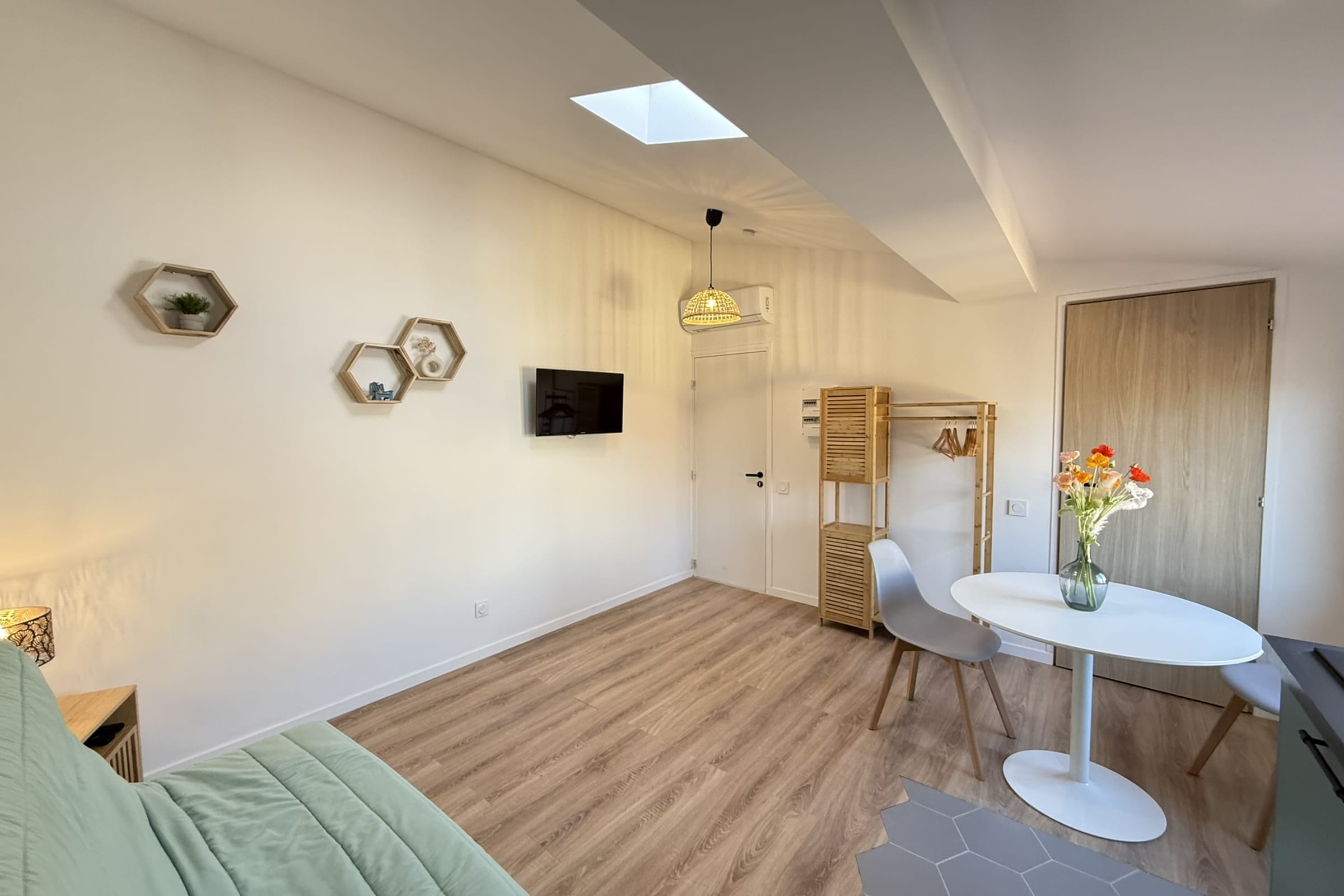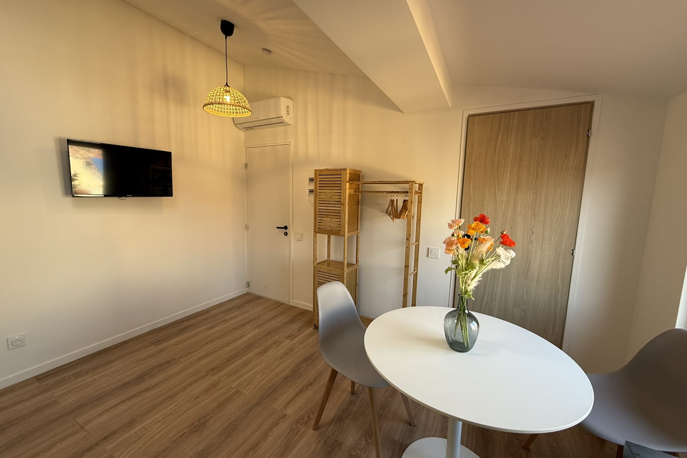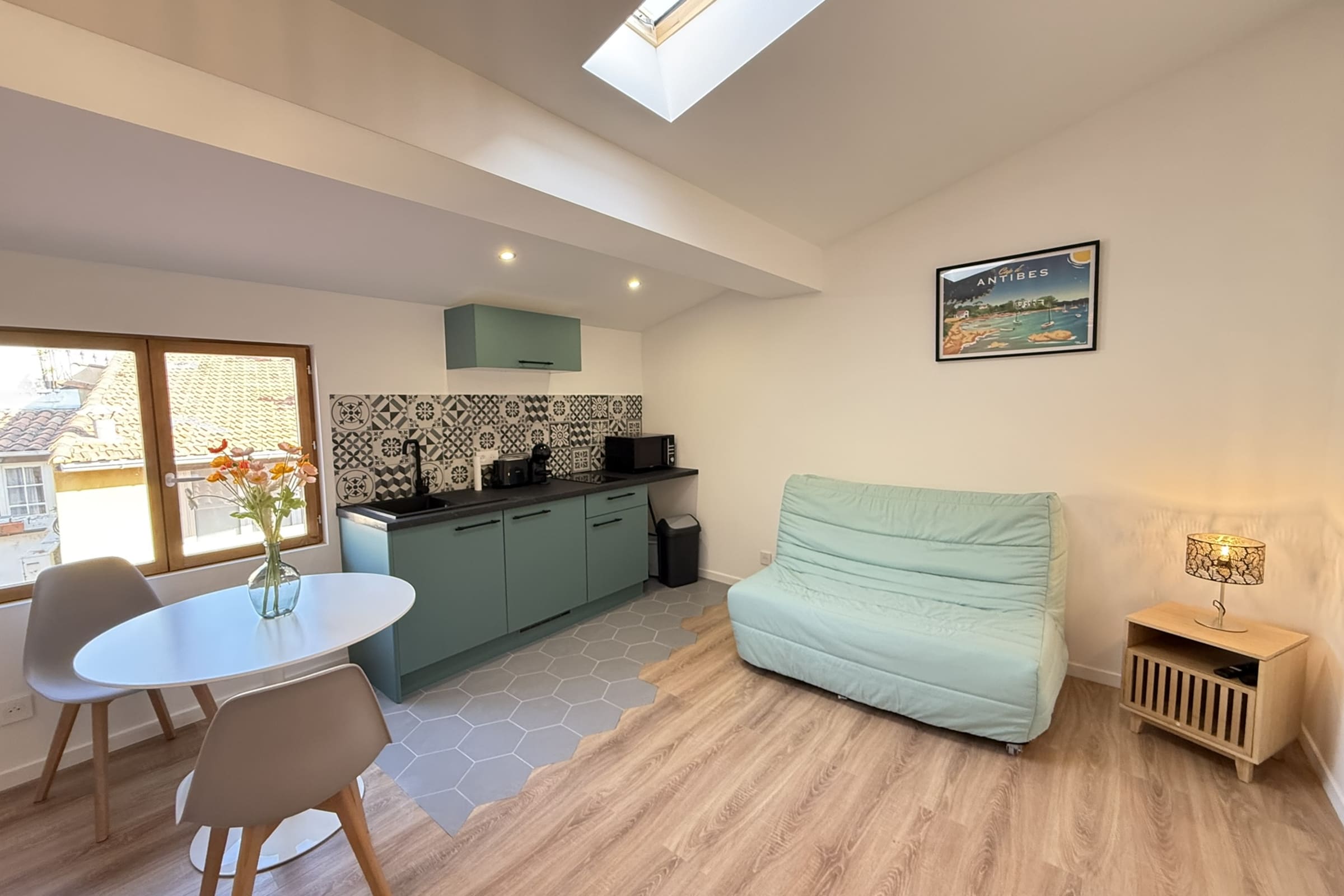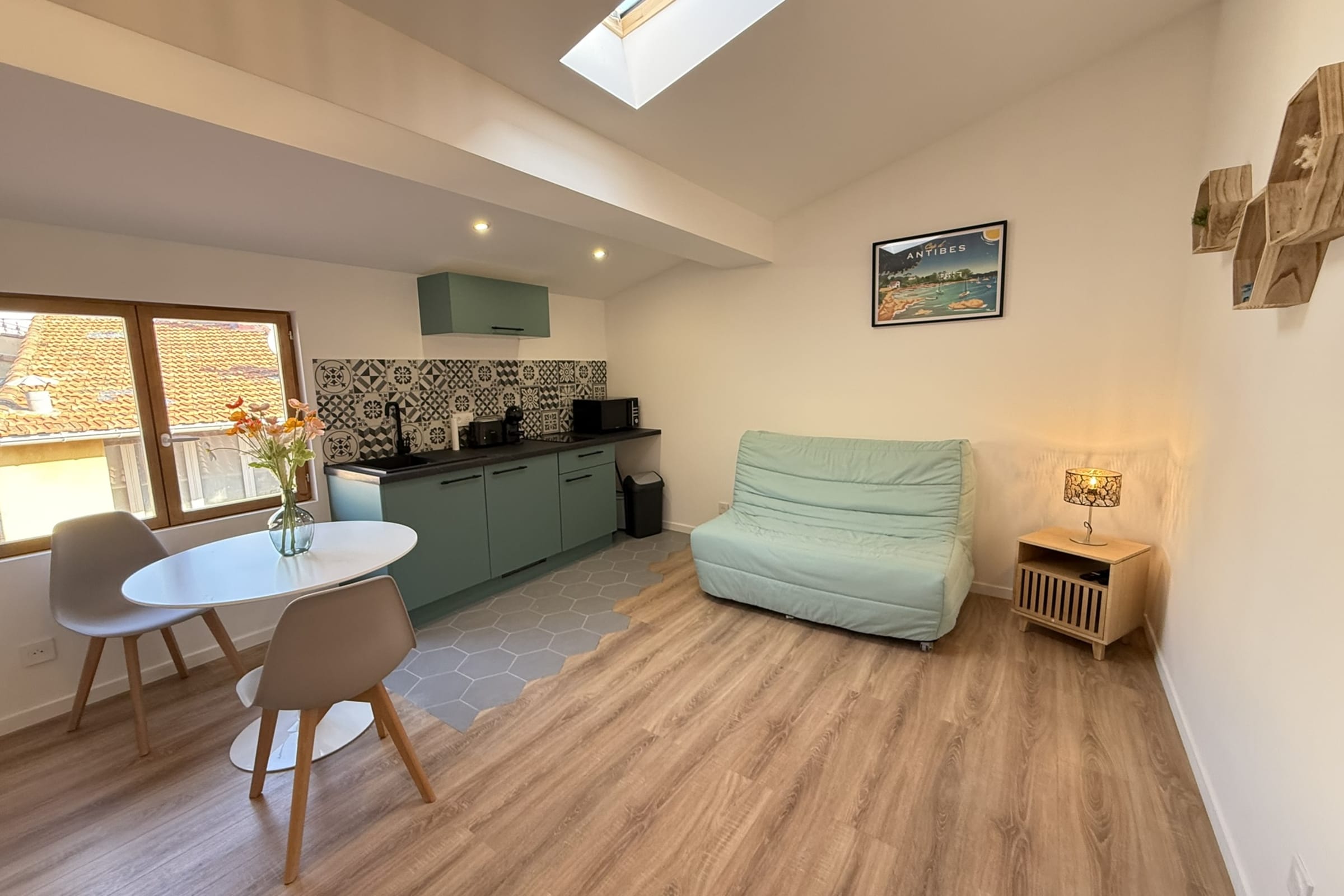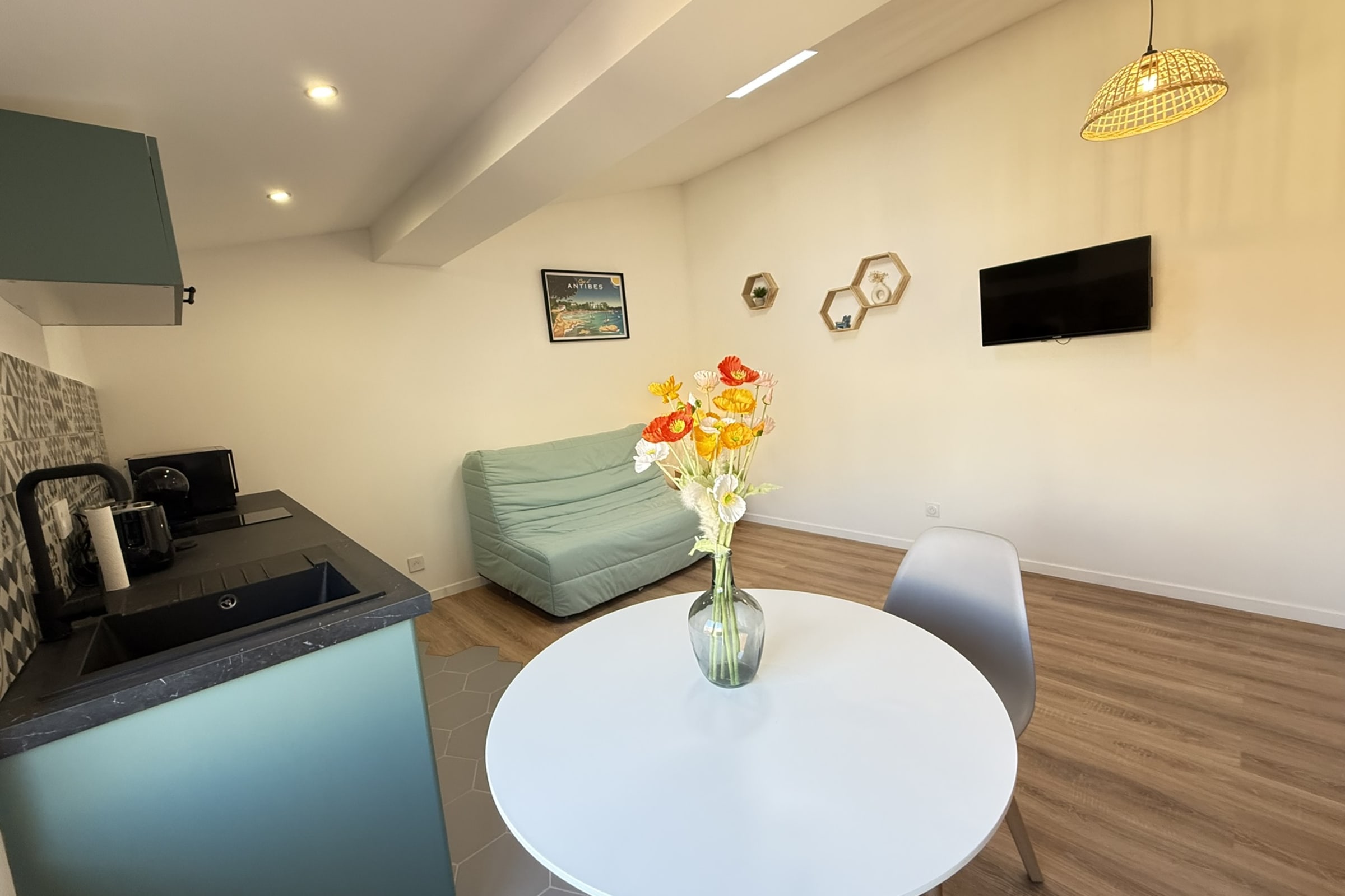 À l’intérieur, la rénovation met en valeur un esprit cosy et contemporain : une cuisine élégante, un coin repas baigné de lumière, un espace nuit confortable et une décoration soignée qui crée immédiatement une atmosphère accueillante. Le studio est compact mais très bien agencé, parfait pour profiter d’Antibes en toute simplicité.