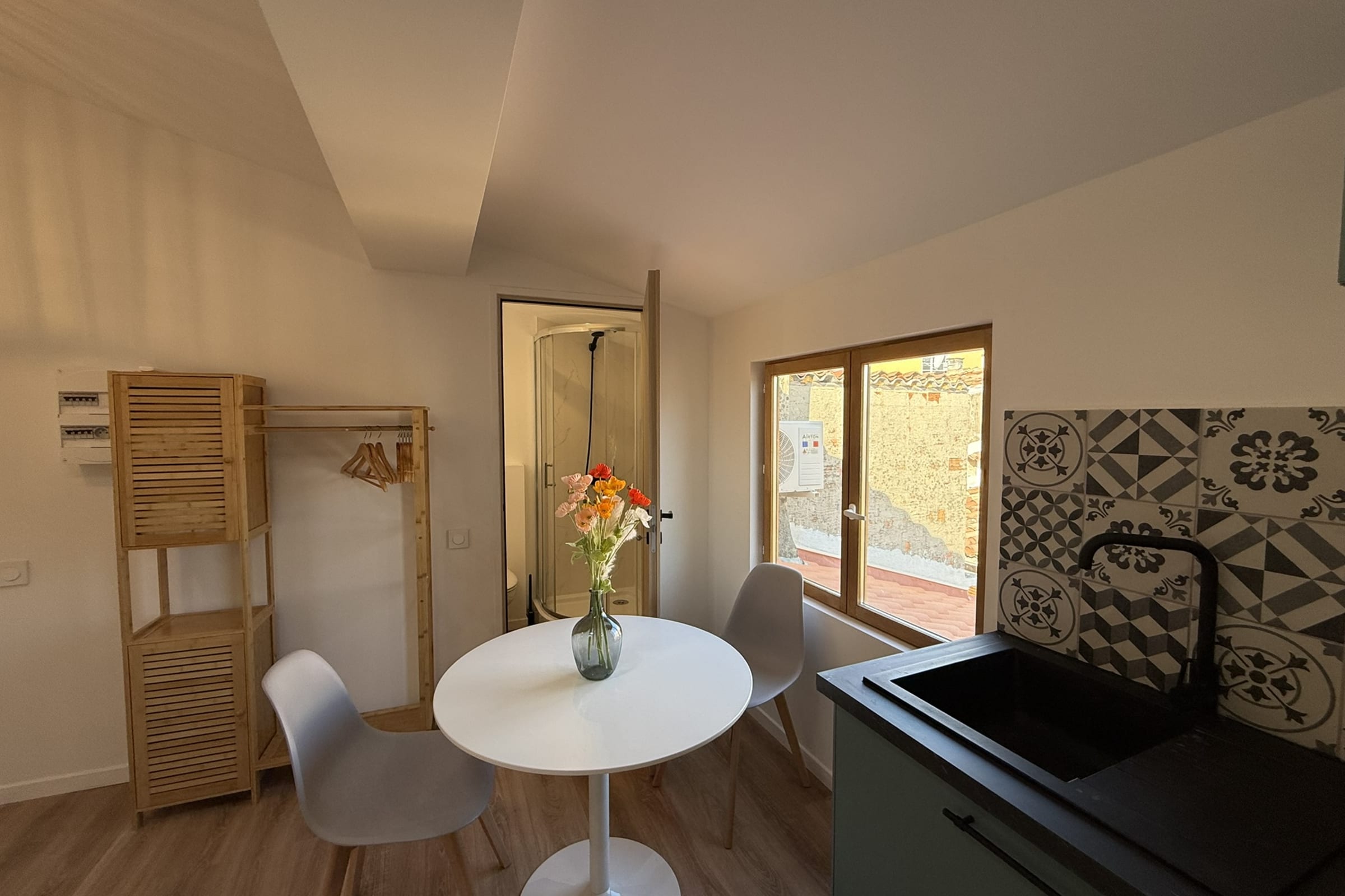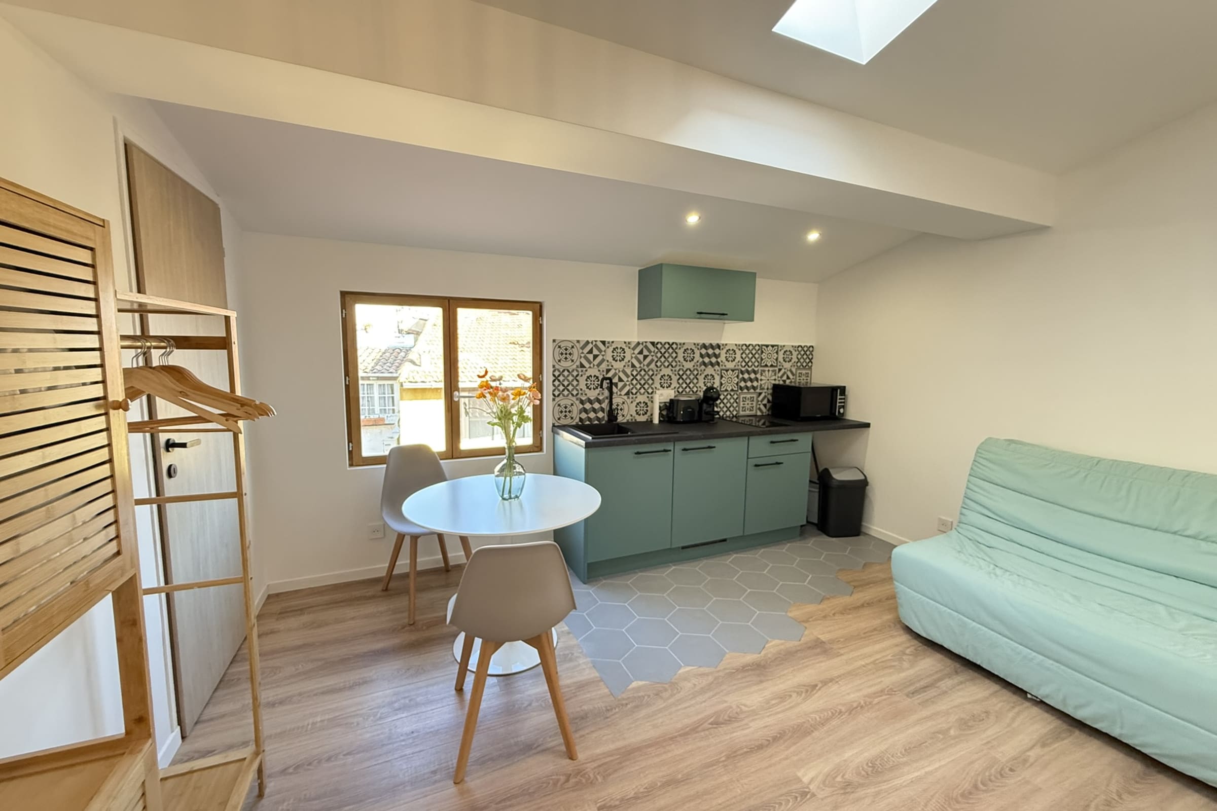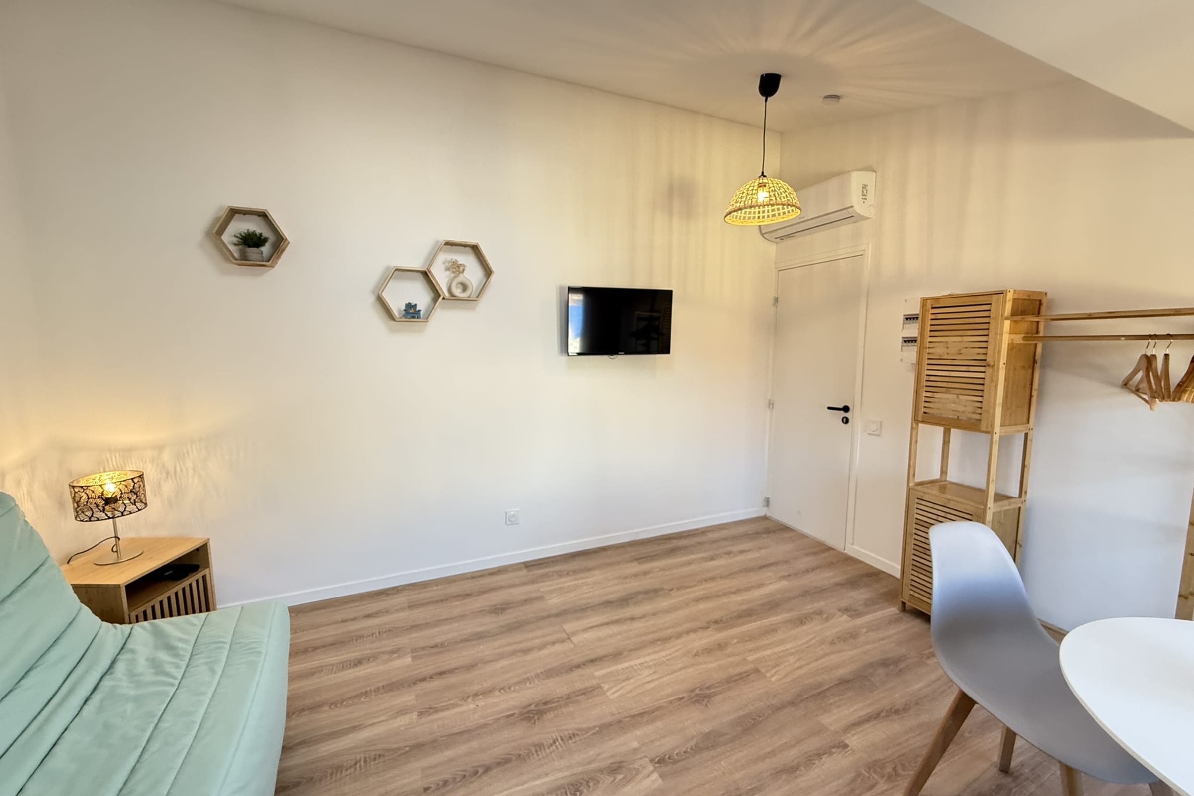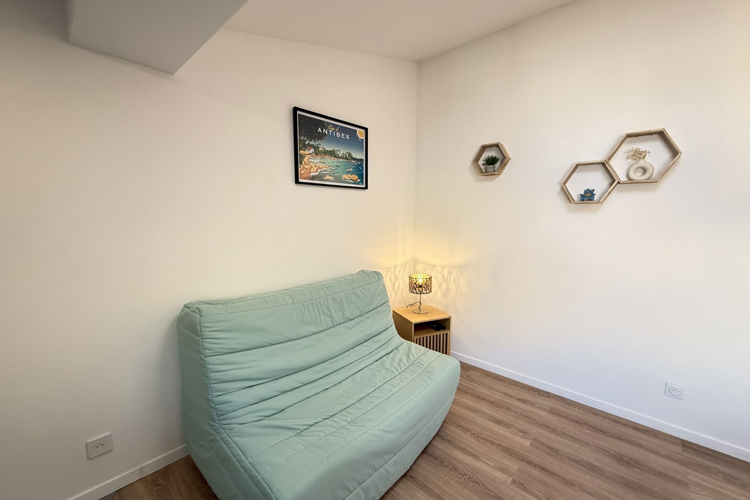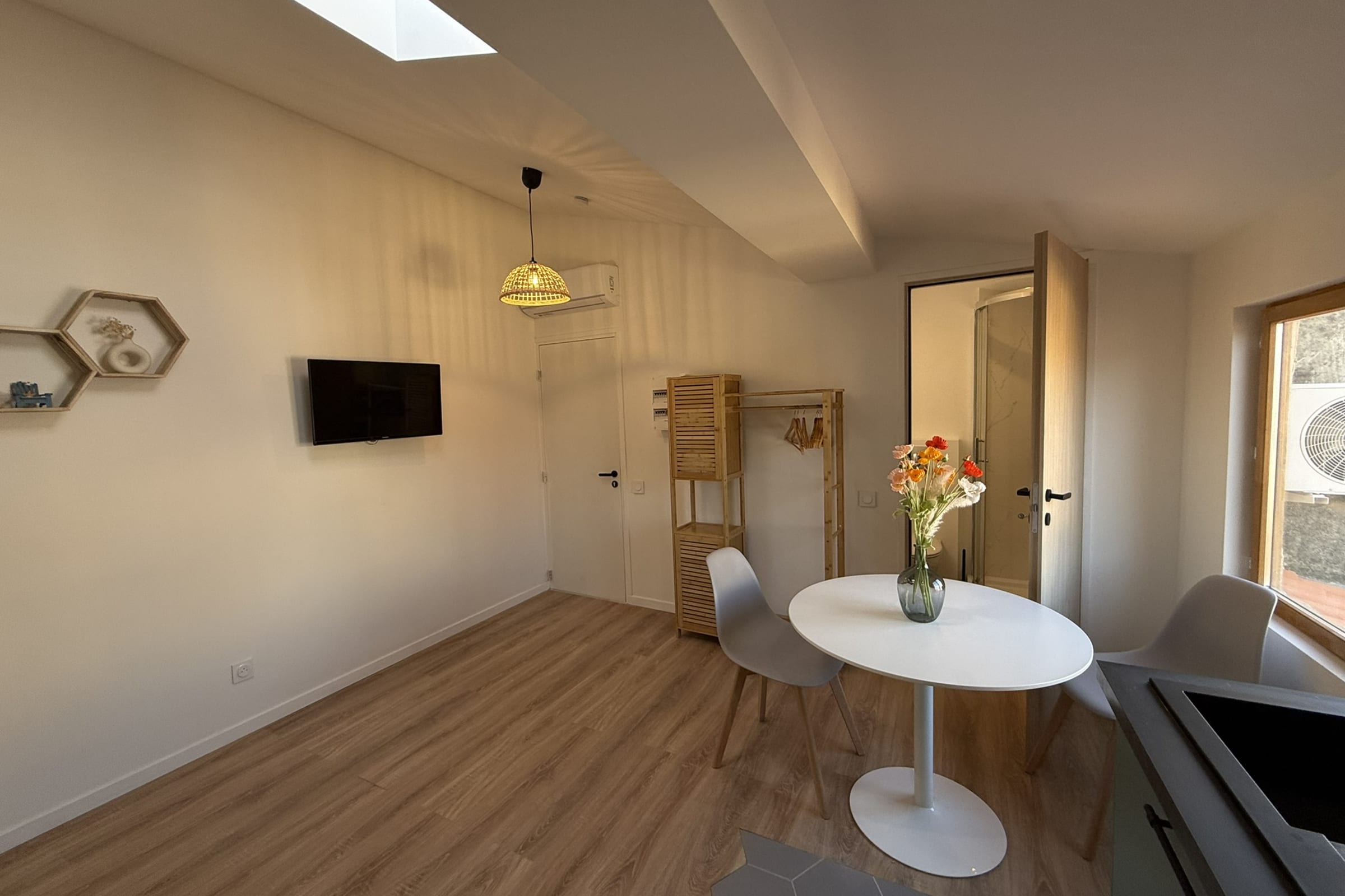 À l’intérieur, la rénovation met en valeur un esprit cosy et contemporain : une cuisine élégante, un coin repas baigné de lumière, un espace nuit confortable et une décoration soignée qui crée immédiatement une atmosphère accueillante. Le studio est compact mais très bien agencé, parfait pour profiter d’Antibes en toute simplicité.