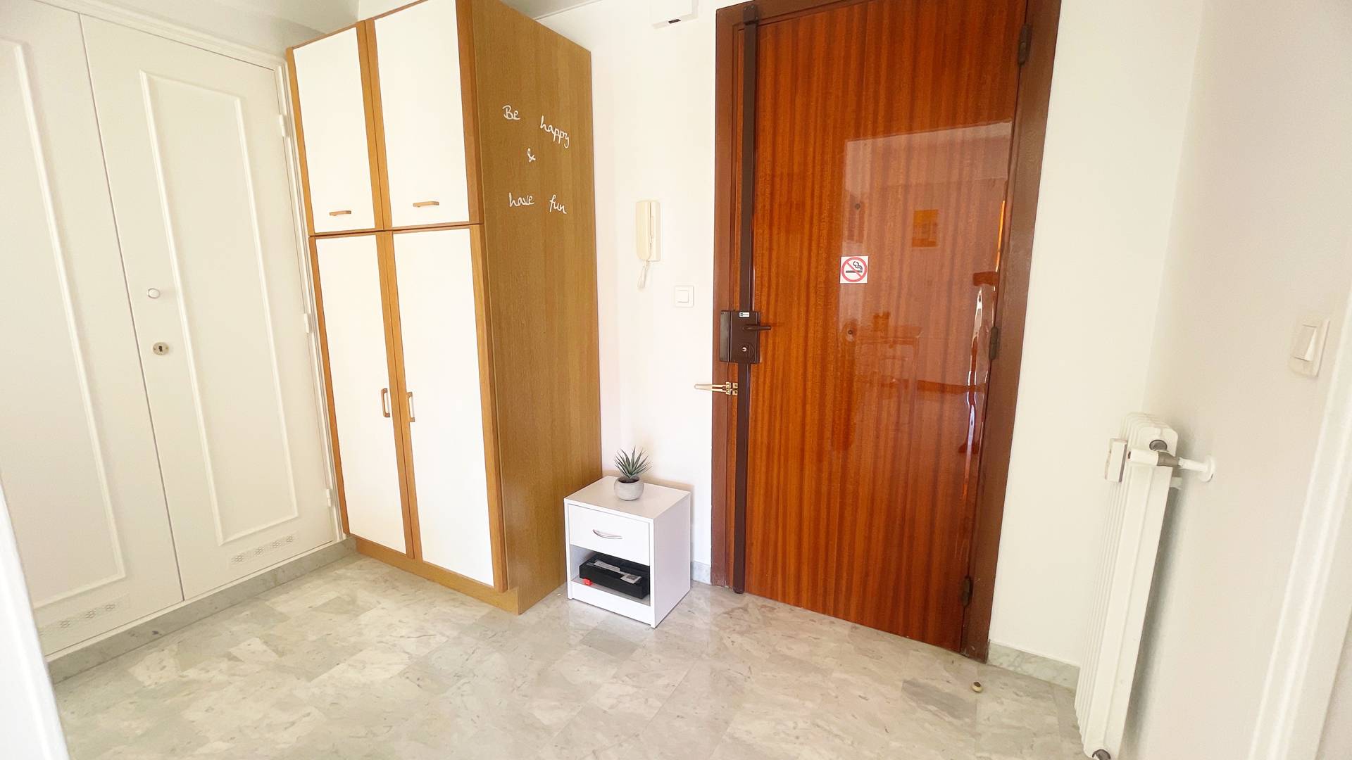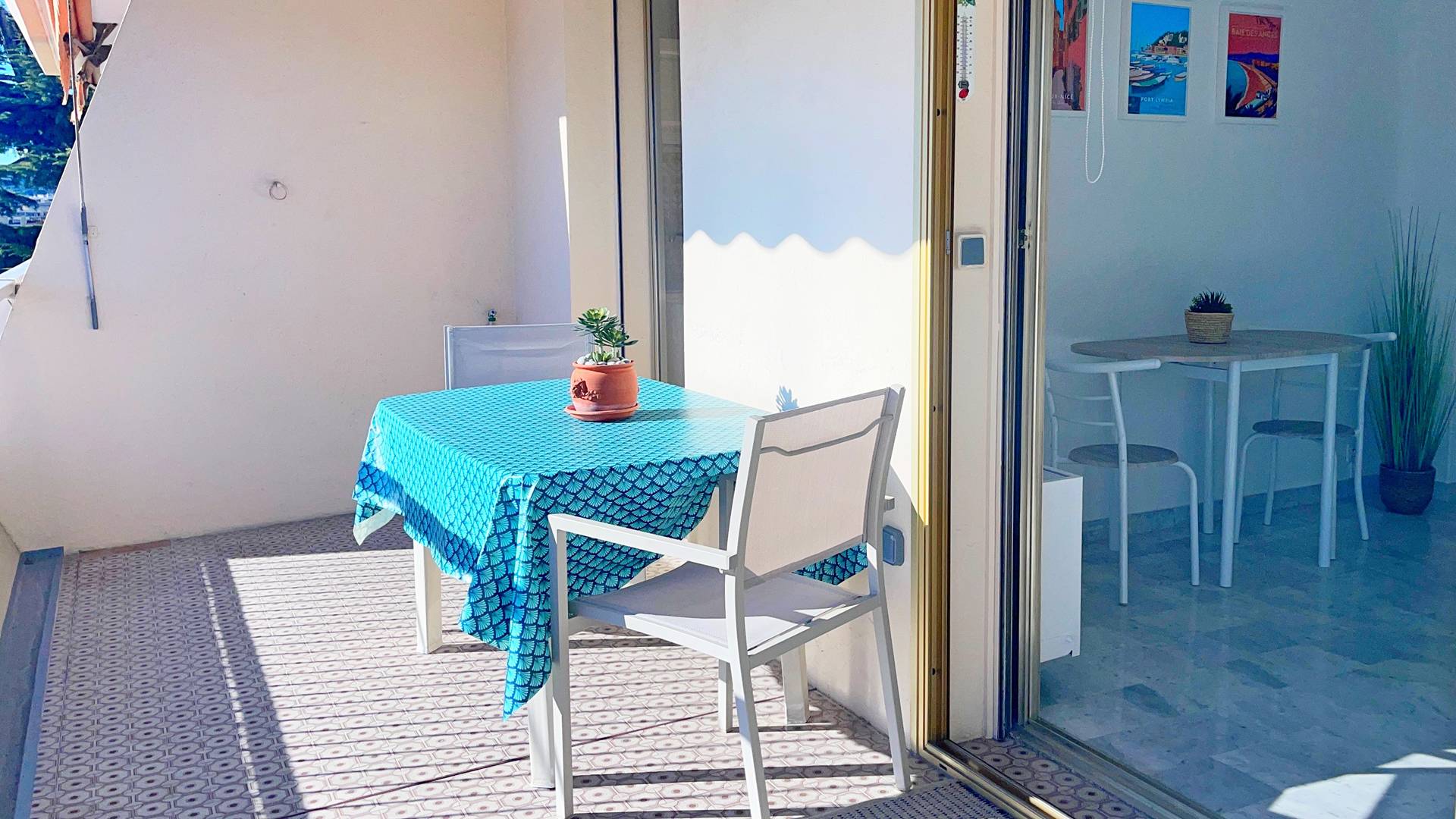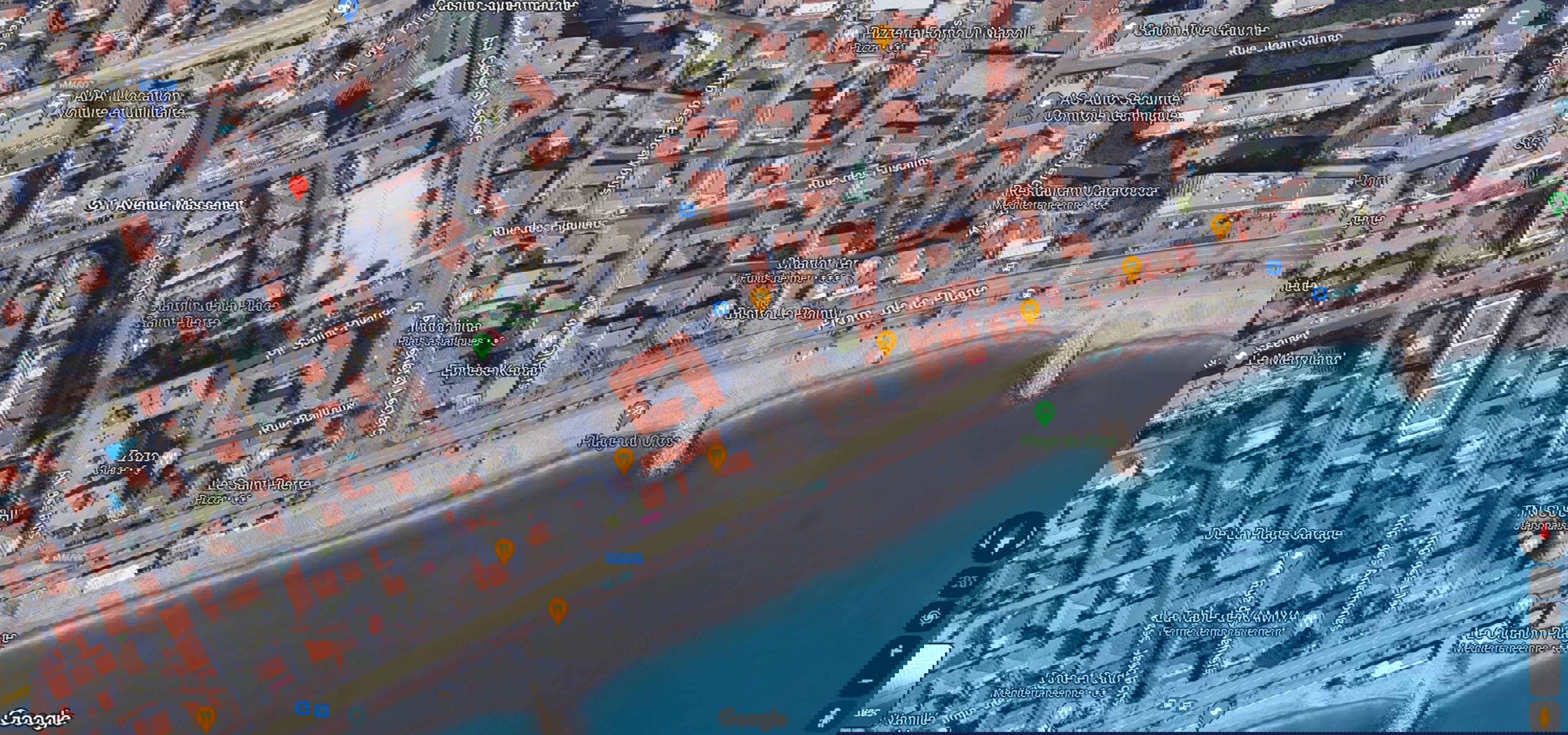 A 650m de la gare du Cros de Cagnes, marché au pied de l'immeuble, tous les commerces à moins de 200m de l'appartement. A 230m de la Plage.