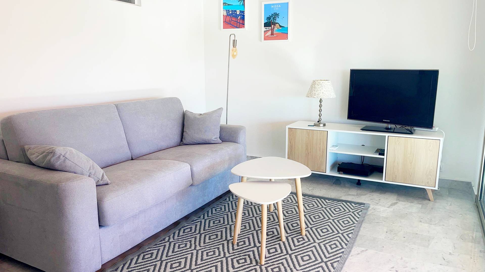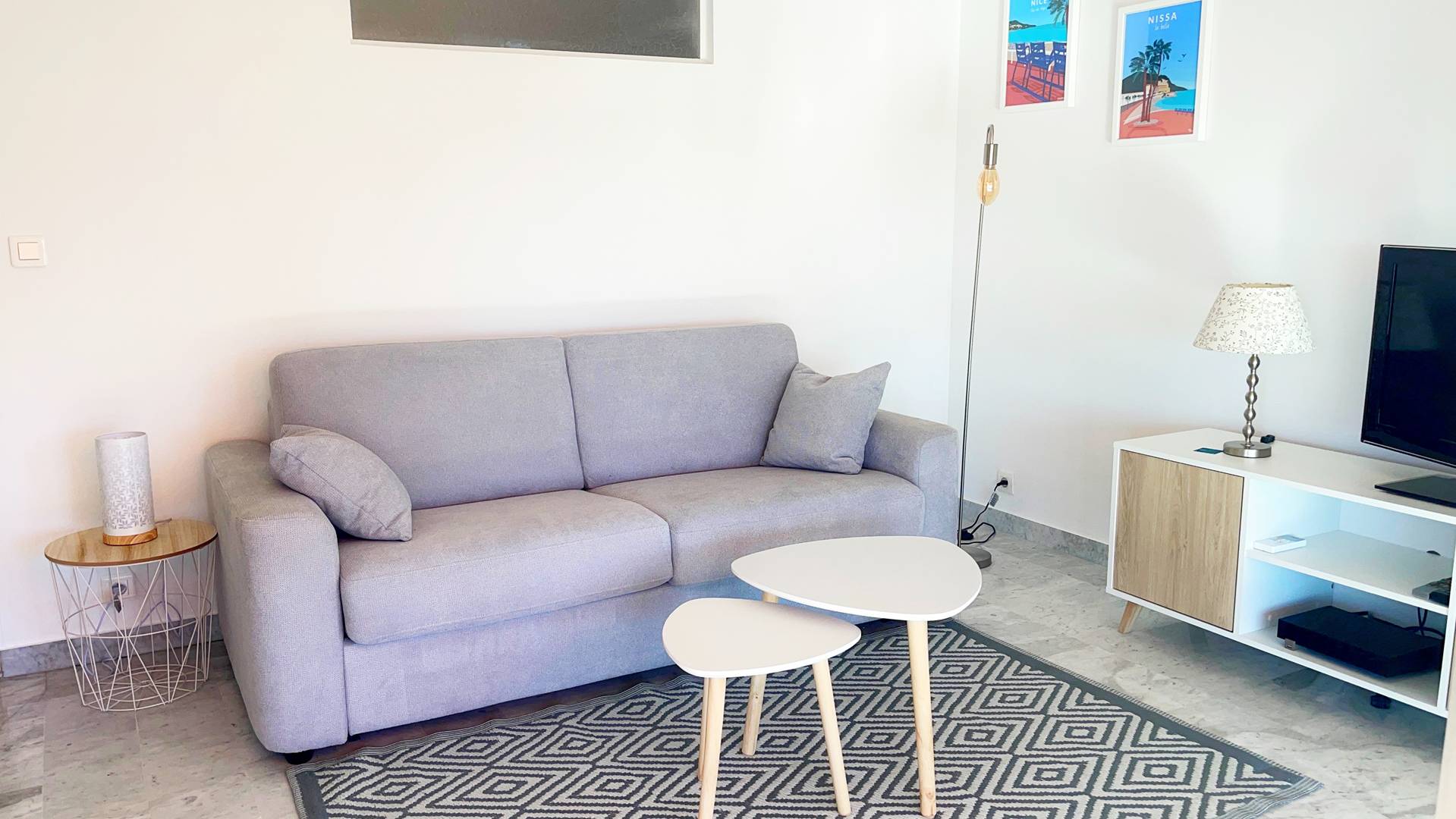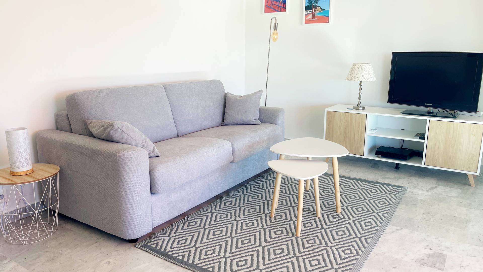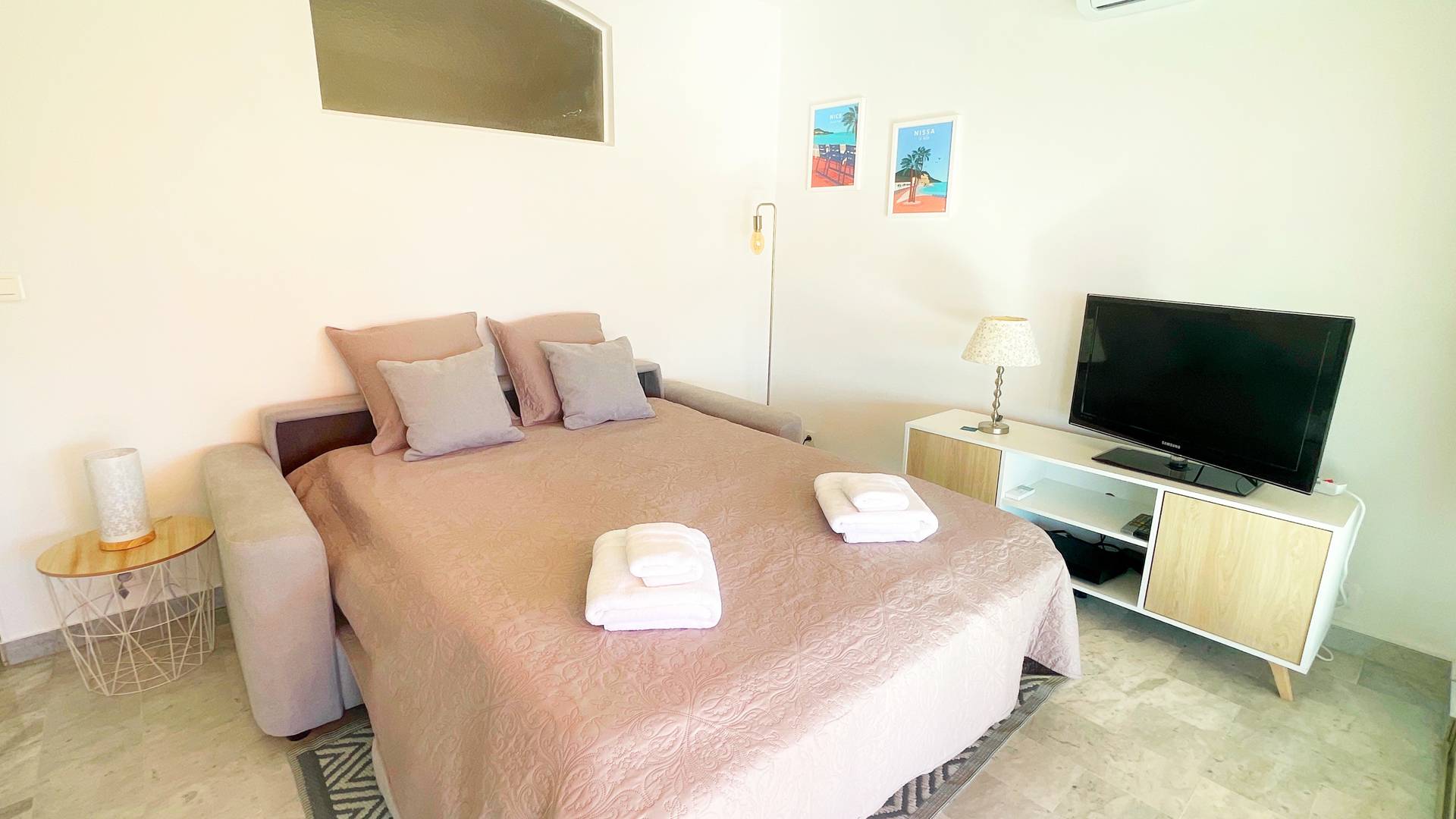 Canapé-lit en 140x200 dans le salon. Tv connectée internet.