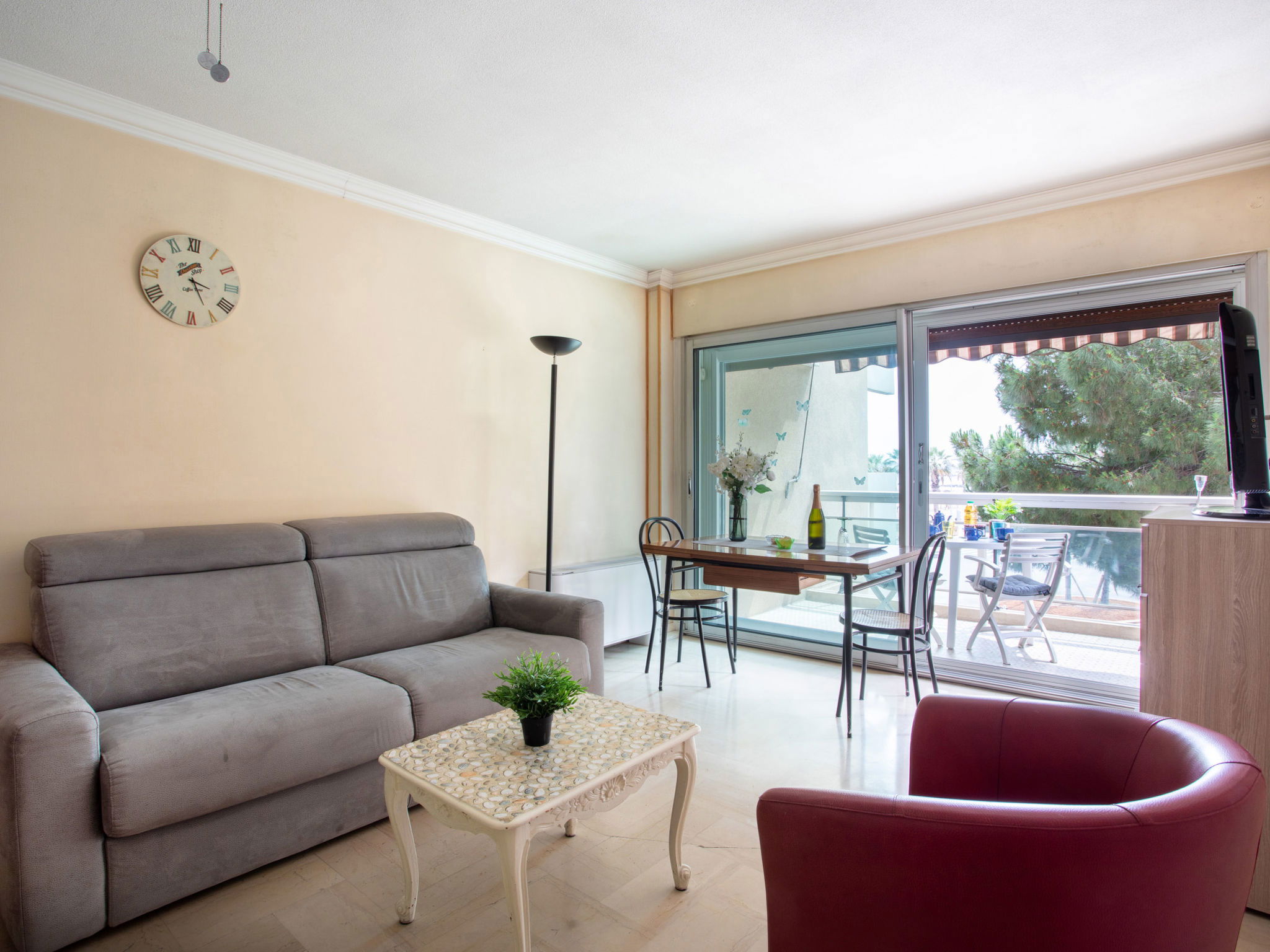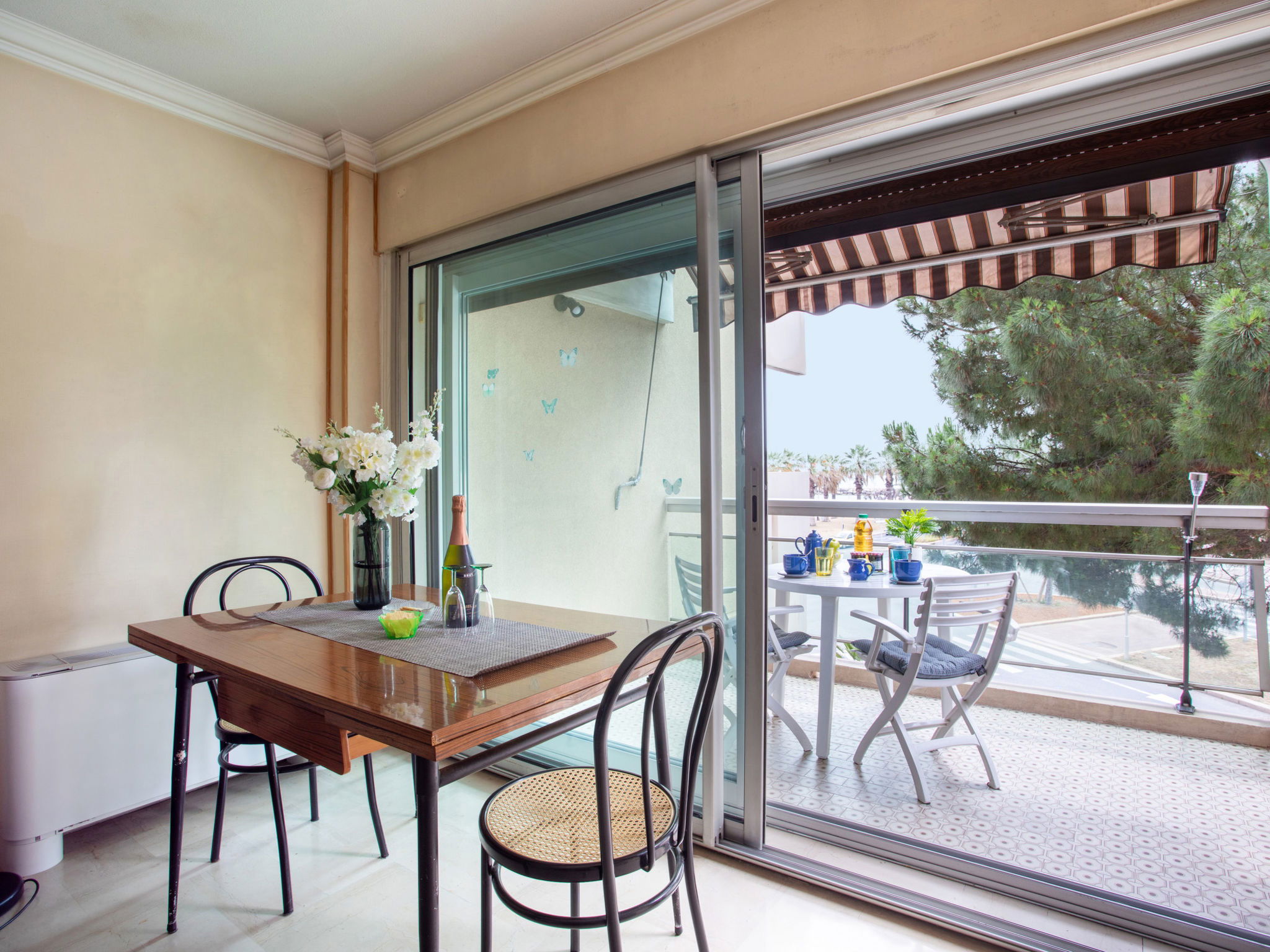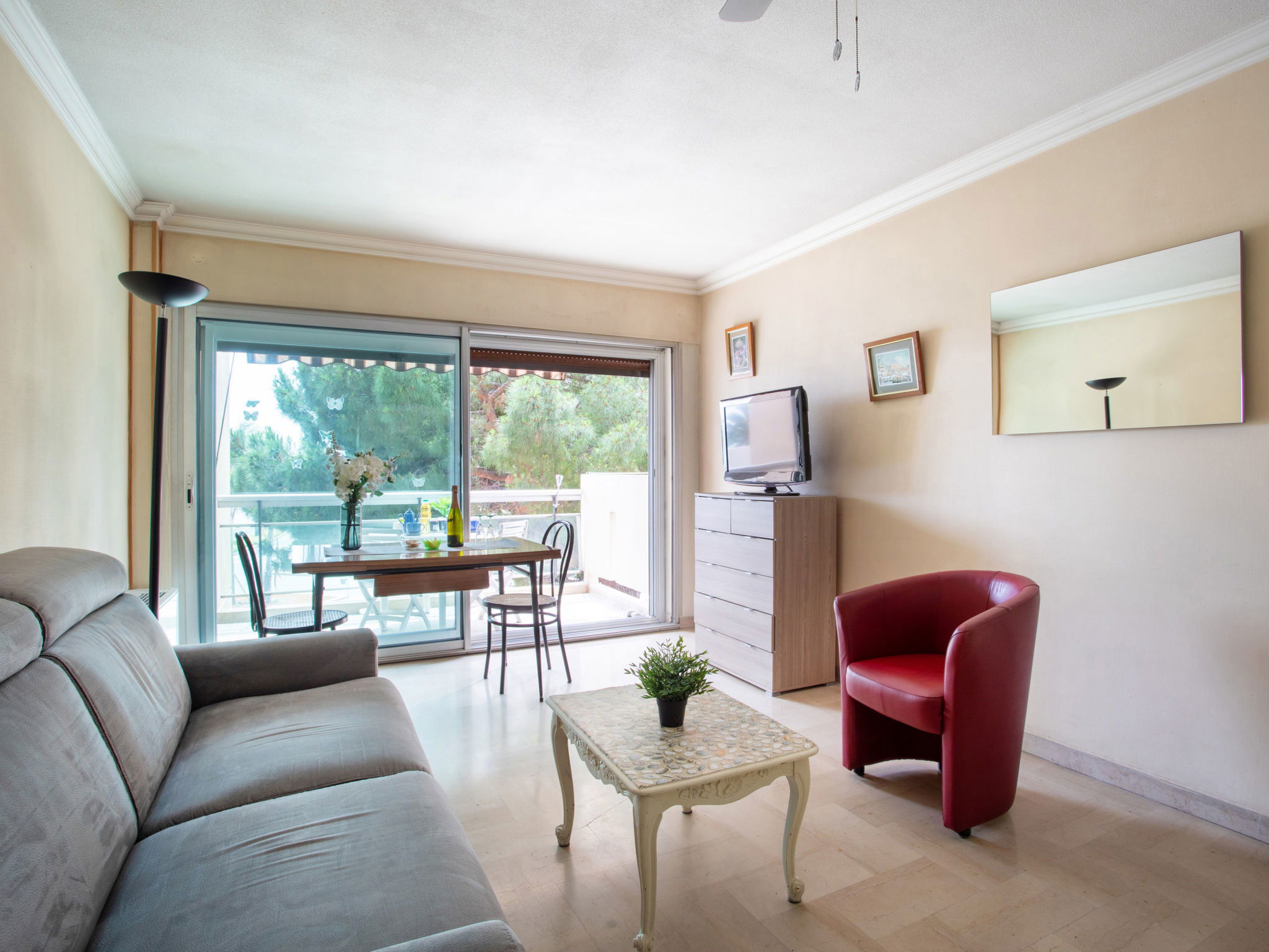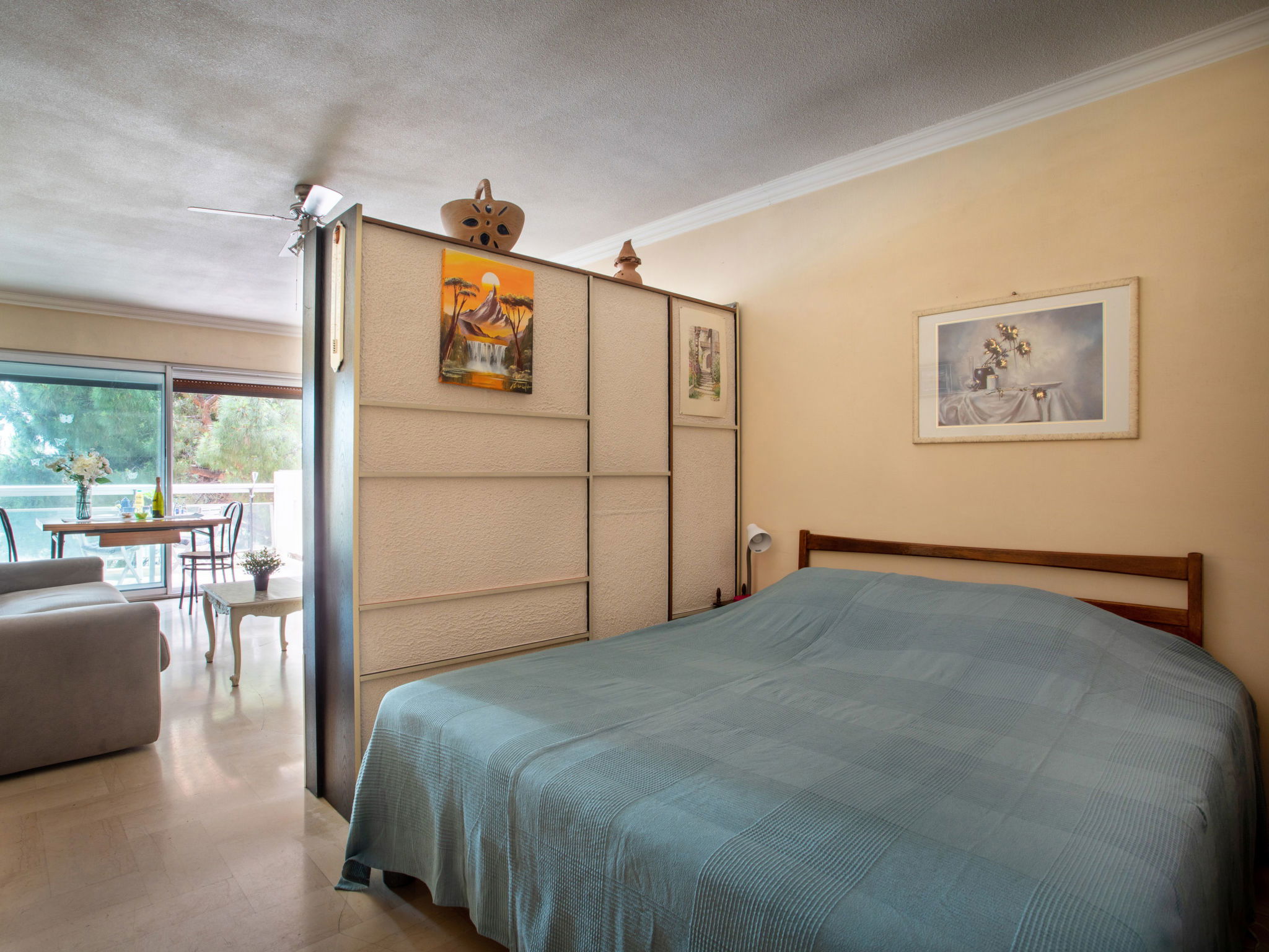 Studio 38 m2 au 2ème étage, situation ouest. Spacieux, aménagement fonctionnel: séjour/salle à manger avec 1 divan-lit double (1 x 140 cm, longueur 190 cm), 1 grand-lit (1 x 160 cm, longueur 200 cm), TV (écran plat). Sortie sur la terrasse. Coin cuisine (2 plaques de cuisson, four, grille-pain, bouilloire électrique, micro-ondes, cafetière électrique). Douche, WC séparé. Chauffage, air-conditionné. Petite terrasse 6 m2, situation ouest. Meubles de terrasse. Vue partielle sur la mer. A disposition: lave-linge, fer à repasser, sèche-cheveux. Internet (Connexion WIFI, en sus). Place de parking No 206 (couvert, 1 Voiture). Veuillez noter: logement non-fumeur parking pour 1 petite voiture. Maximum 1 animal/ chien autorisé. Détecteur de fumée. Annonce d'un particulier (art 155, IV du CGI). 06027028404AK