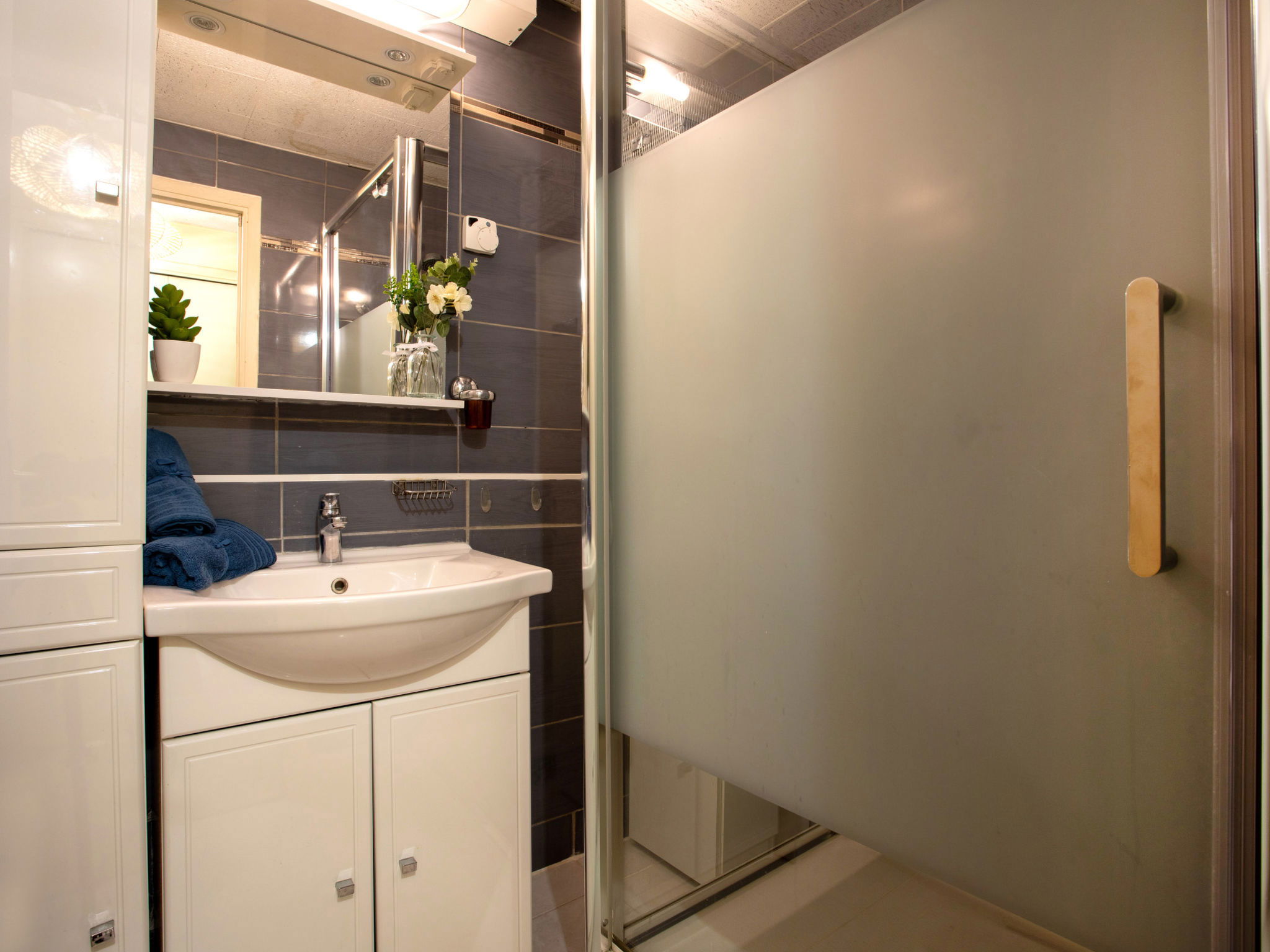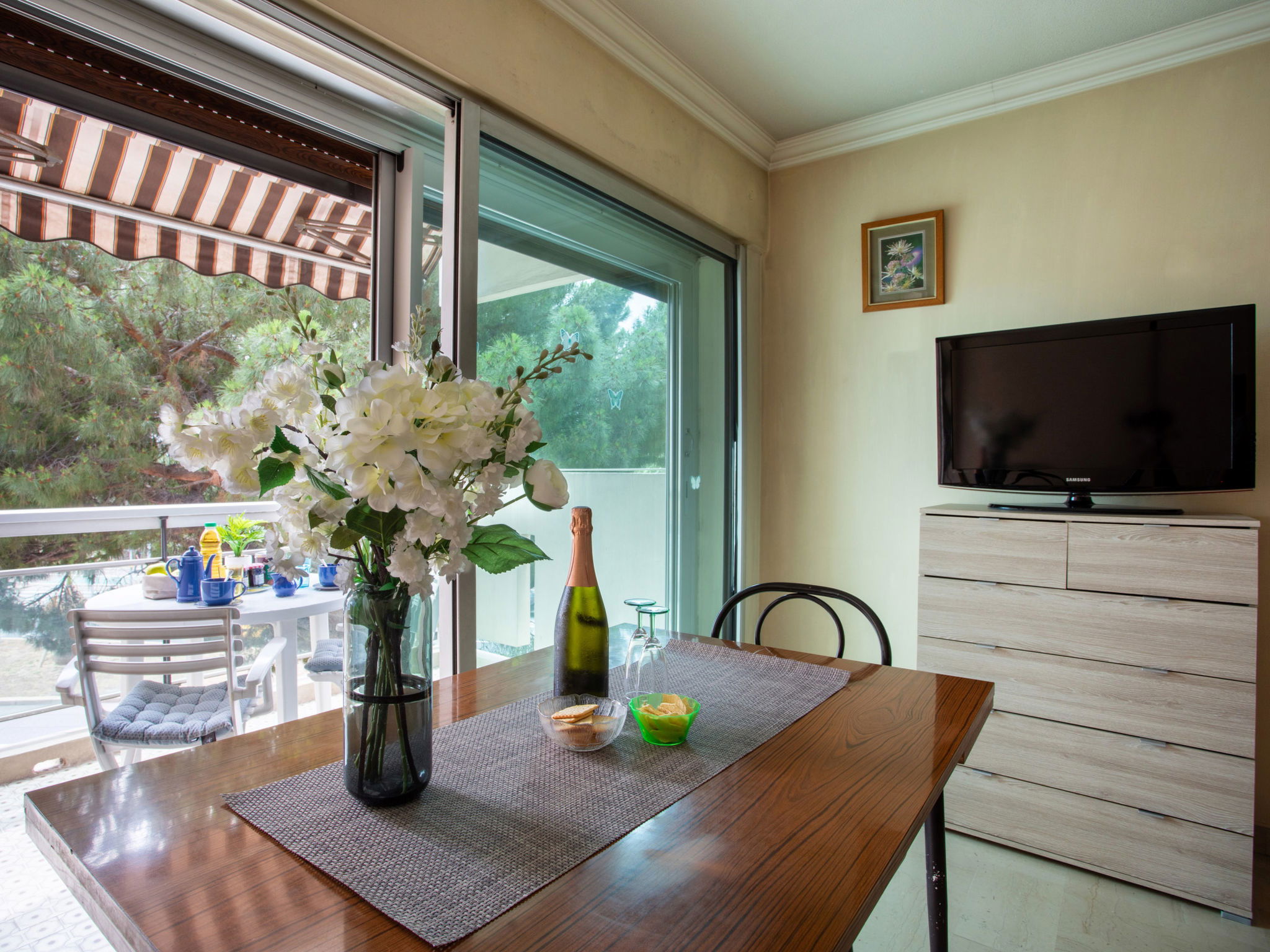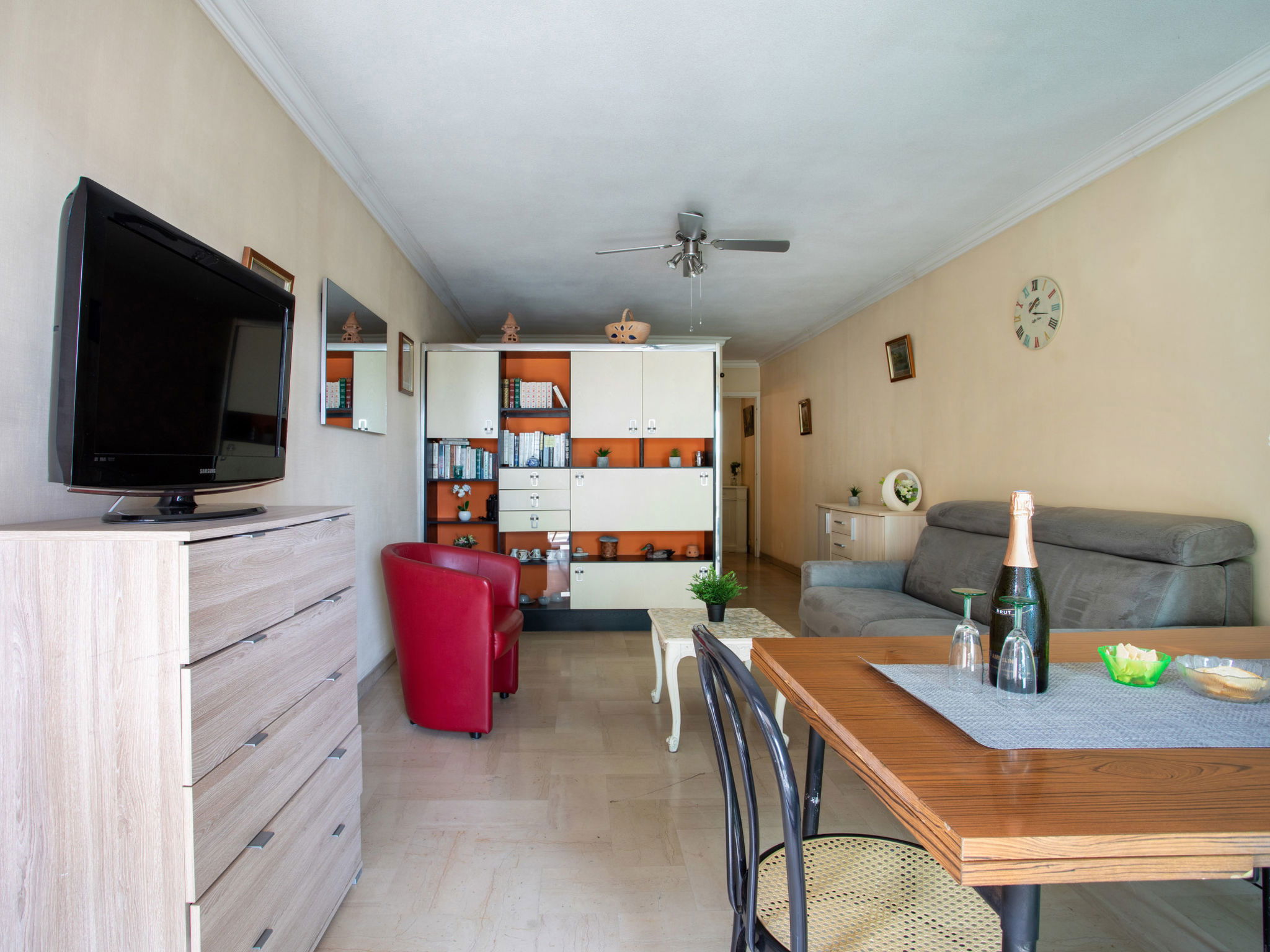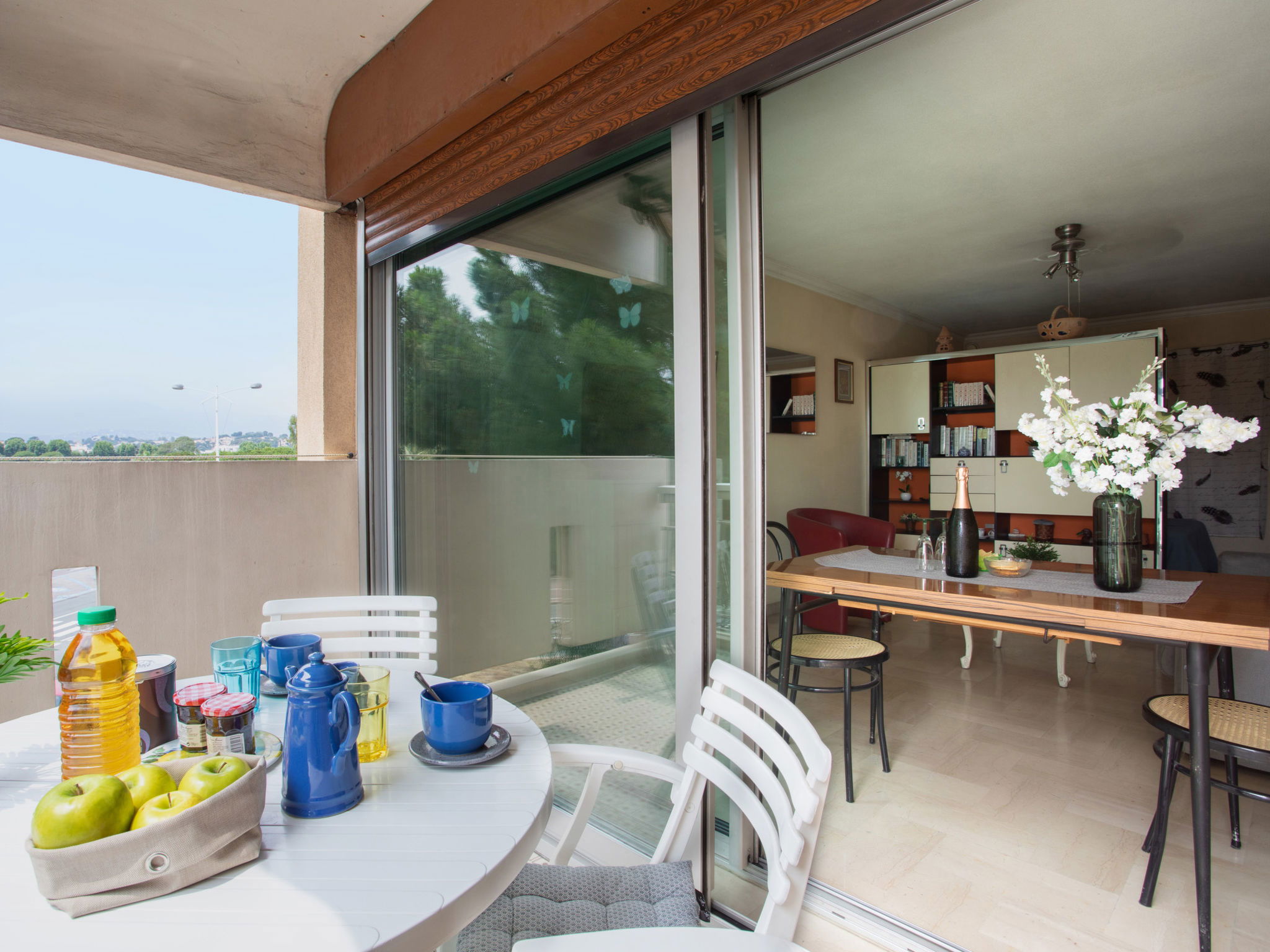 Studio 38 m2 au 2ème étage, situation ouest. Spacieux, aménagement fonctionnel: séjour/salle à manger avec 1 divan-lit double (1 x 140 cm, longueur 190 cm), 1 grand-lit (1 x 160 cm, longueur 200 cm), TV (écran plat). Sortie sur la terrasse. Coin cuisine (2 plaques de cuisson, four, grille-pain, bouilloire électrique, micro-ondes, cafetière électrique). Douche, WC séparé. Chauffage, air-conditionné. Petite terrasse 6 m2, situation ouest. Meubles de terrasse. Vue partielle sur la mer. A disposition: lave-linge, fer à repasser, sèche-cheveux. Internet (Connexion WIFI, en sus). Place de parking No 206 (couvert, 1 Voiture). Veuillez noter: logement non-fumeur parking pour 1 petite voiture. Maximum 1 animal/ chien autorisé. Détecteur de fumée. Annonce d'un particulier (art 155, IV du CGI). 06027028404AK