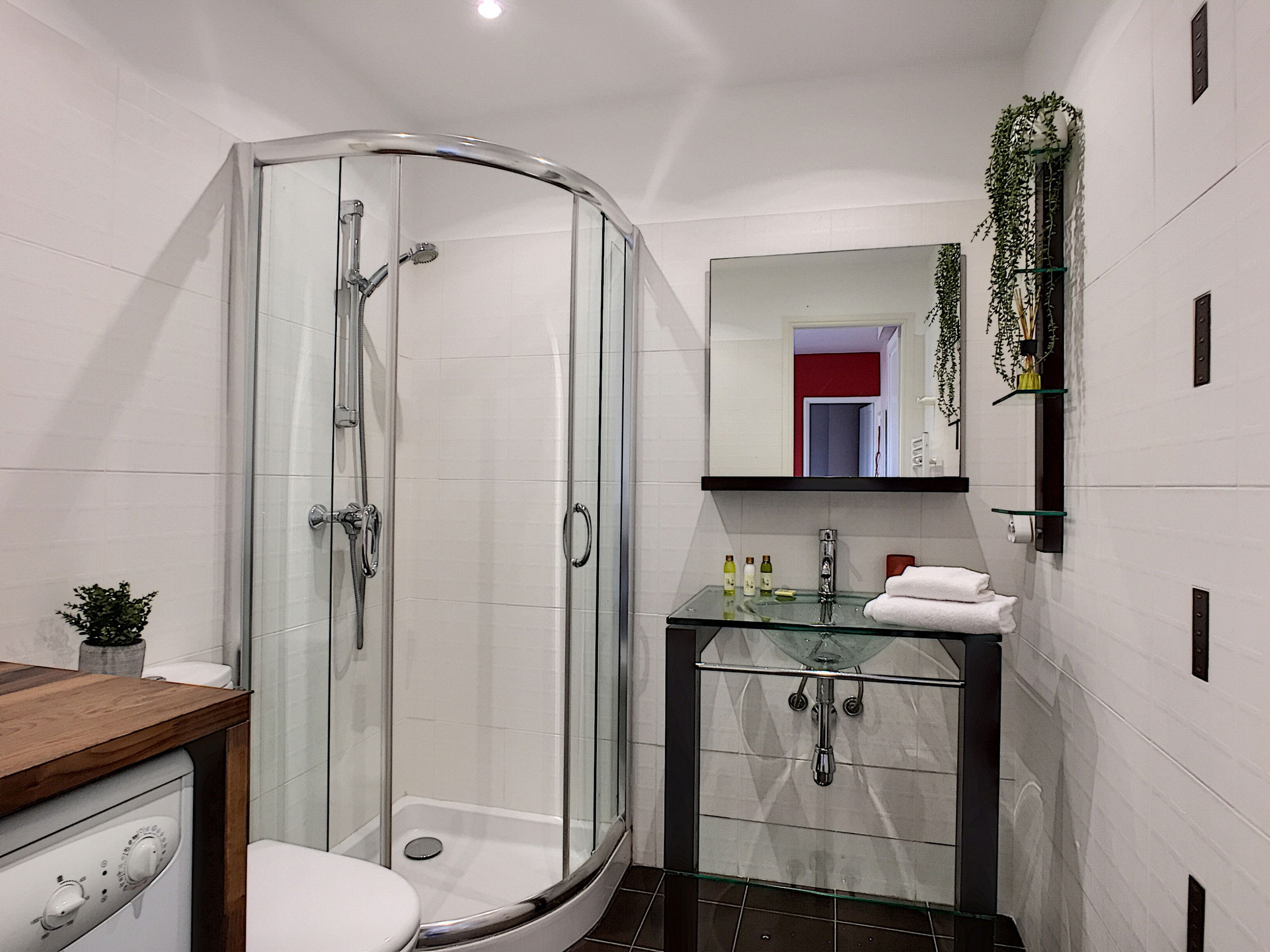 La salle de bain propose une agréable douche, un sèche-cheveux, un sèche-serviettes ainsi que des WC.