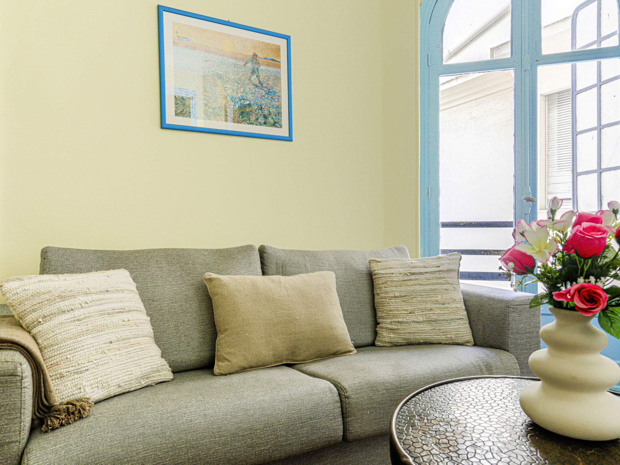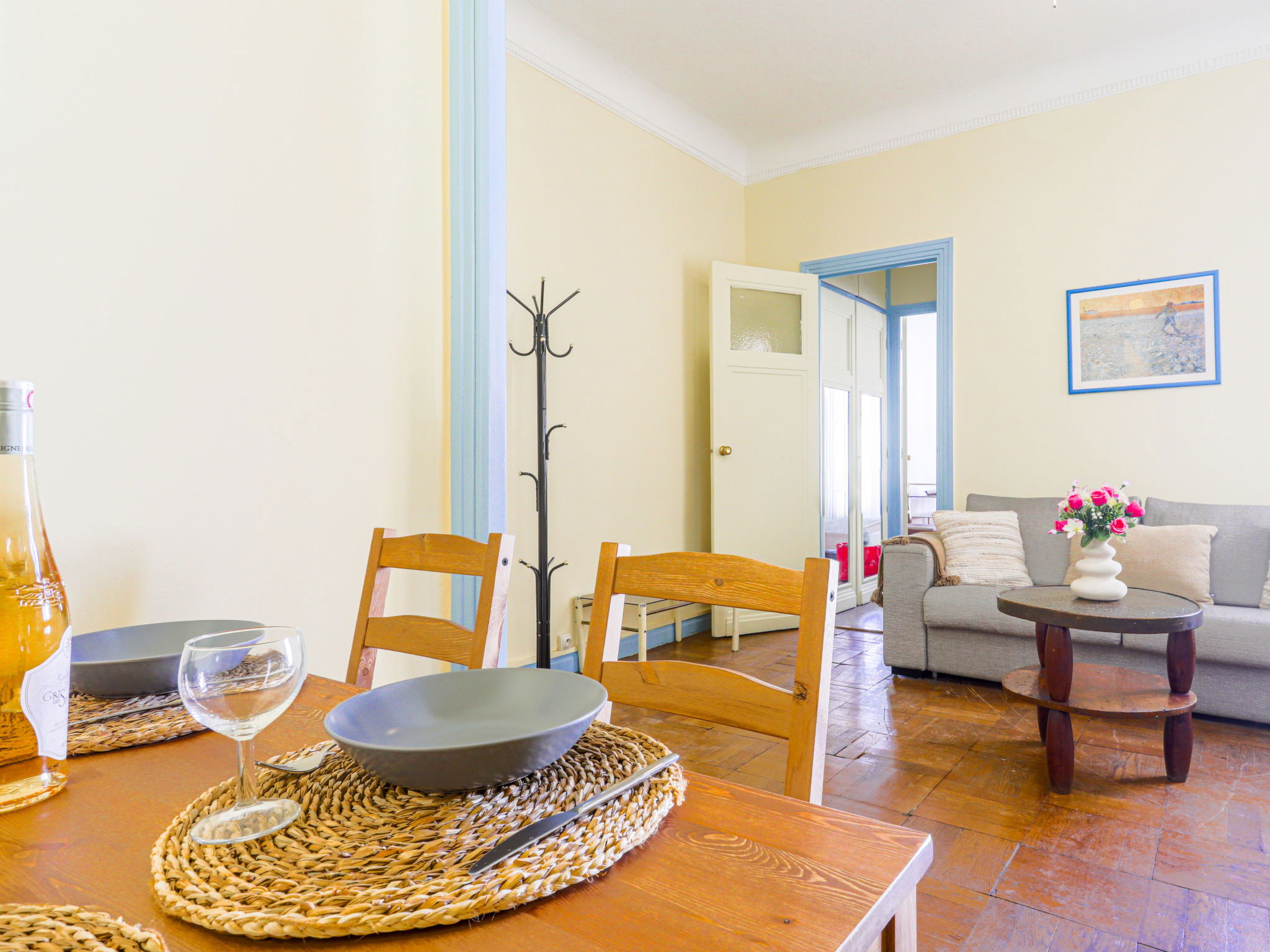 Appartement de 2 pièces 48 m2 au 5ème étage. Aménagement fonctionnel: séjour/salle à manger avec 1 divan-lit double (140 cm, longueur 190 cm), TV (écran plat). 1 chambre avec 1 grand-lit (140 cm, longueur 190 cm). Coin cuisine (2 plaques de cuisson, four, grille-pain, bouilloire électrique, cafetière électrique). Douche/WC. Chauffage. Sol en parquet. A disposition: lave-linge, sèche-cheveux. Internet (Connexion WIFI, en sus). Veuillez noter: logement non-fumeur. Détecteur de fumée. 06088000820JQ