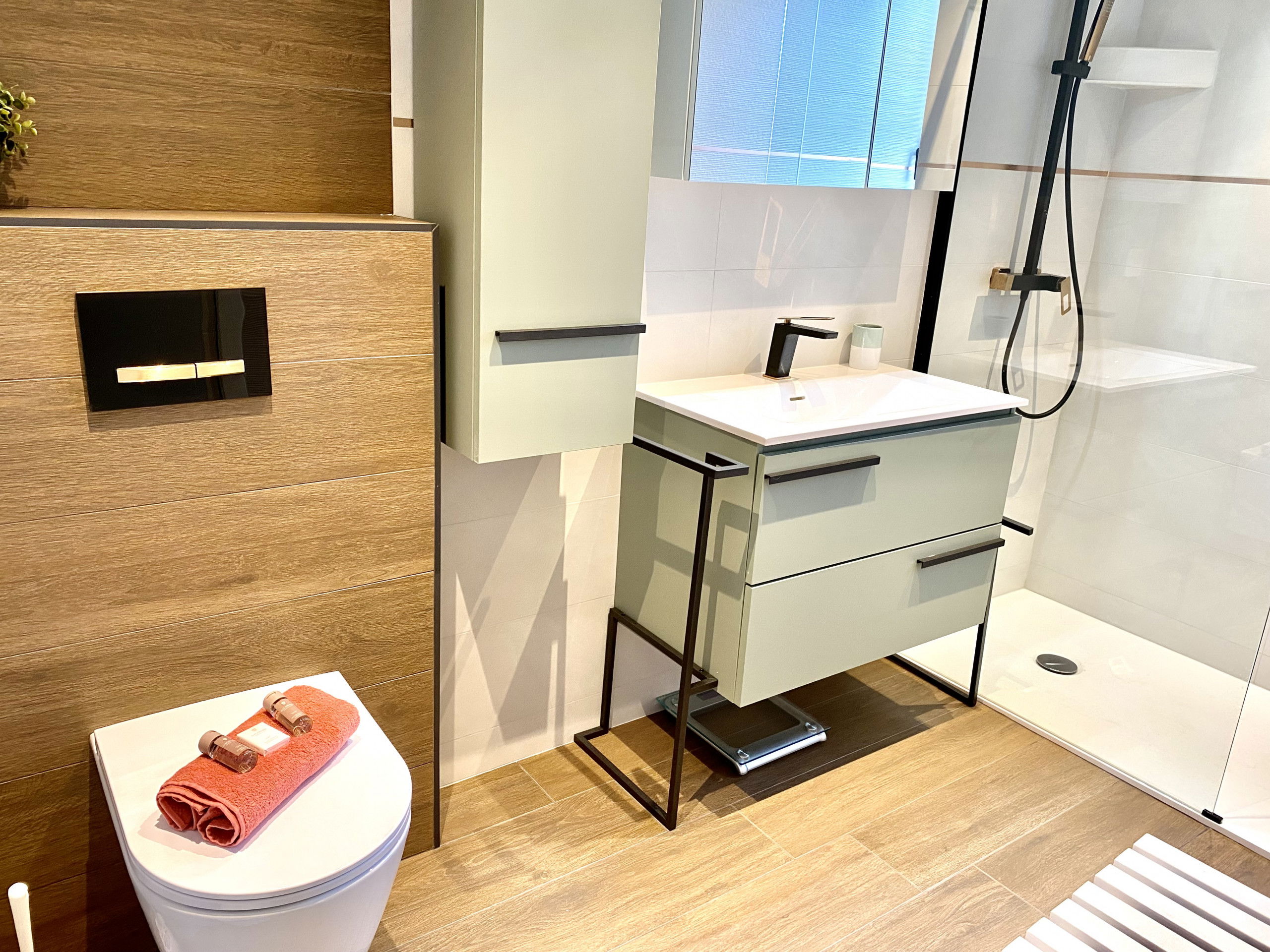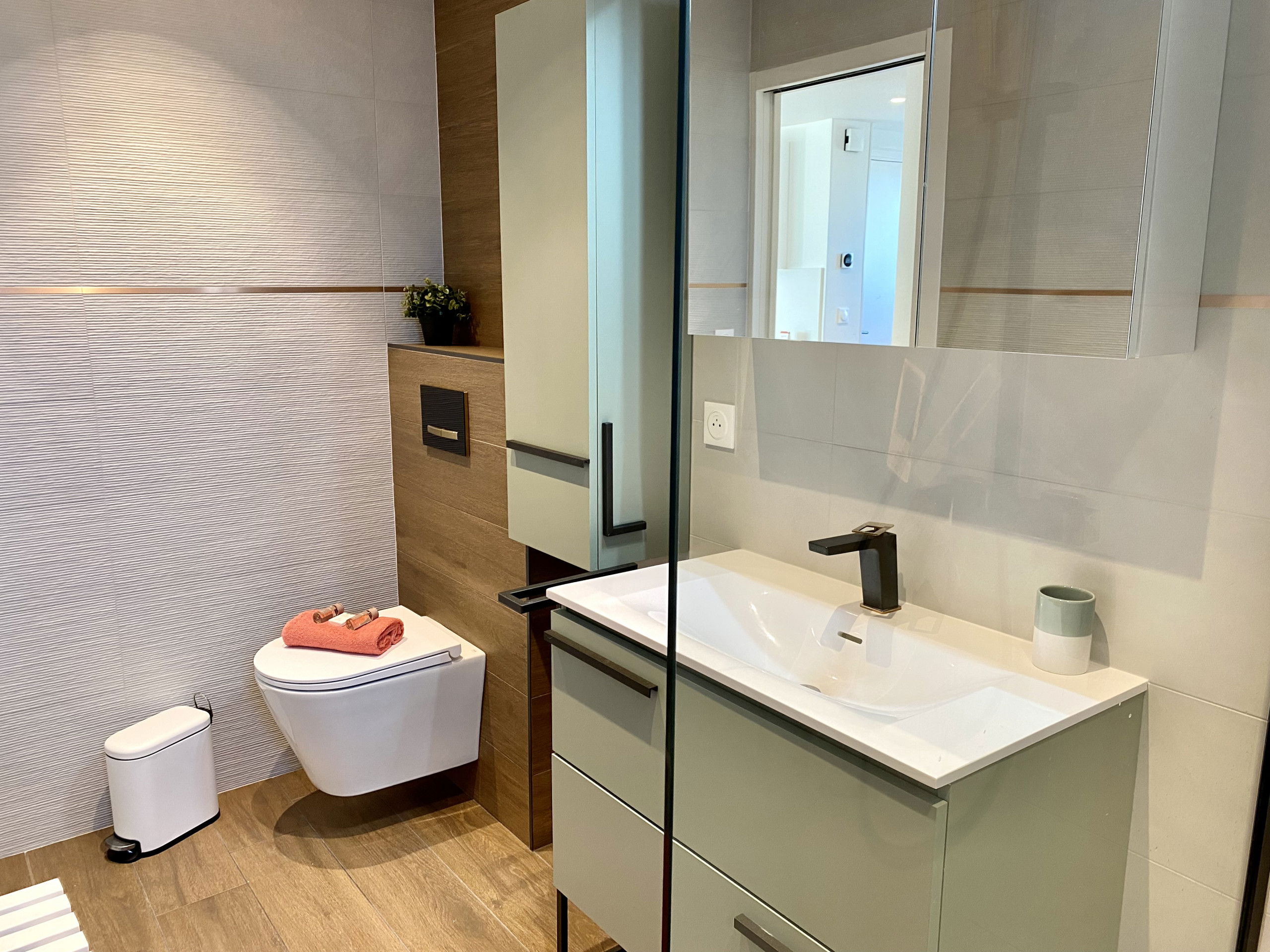 L'appartement dispose d'une cuisine américaine équipée de four, plaque vitrocéramique, micro-ondes, lave-linge, sèche-linge etc., un salon-salle à manger avec un canapé-lit pour 2 personnes, Une chambre à couchée avec un lit double (140 cm) une salle de bain équipée d'un lavabo d'une douche et d'un toilette.