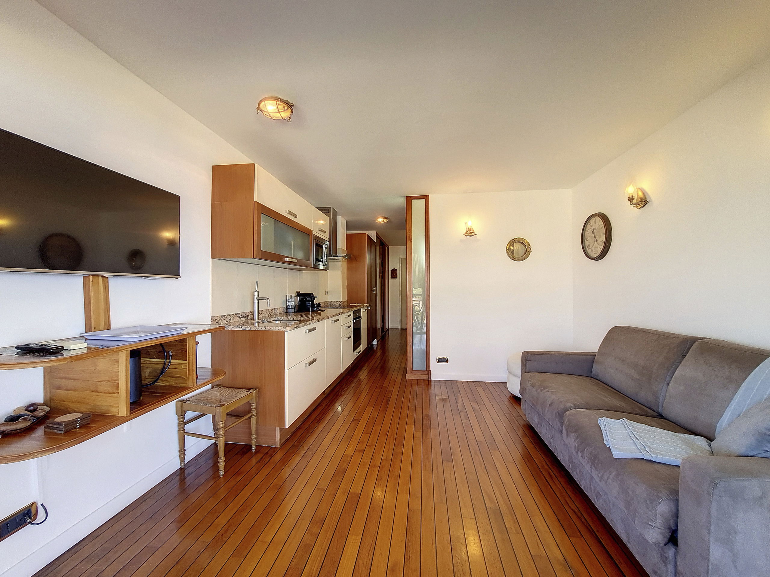 Grâce à sa décoration, vous aurez l'impression de voyager a bord d'un bateau. Vous apprécierez son entrée offrant grand placard de rangement pour vos affaires personnelles, sa cuisine équipée ouvrant sur la pièce principale, sa salle de bain avec grande douche à l'italienne et son séjour avec canapé lit ouvrant sur la terrasse.