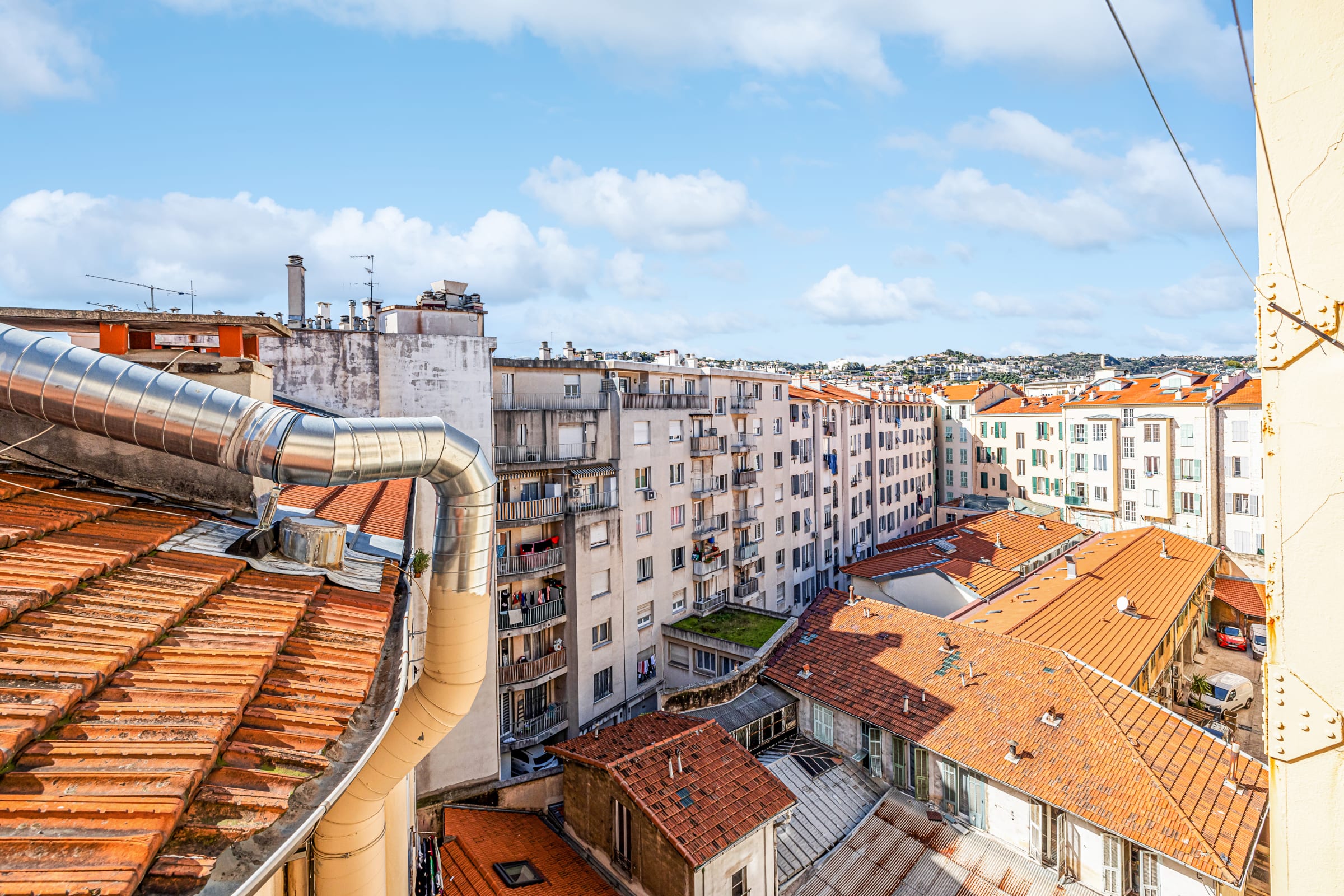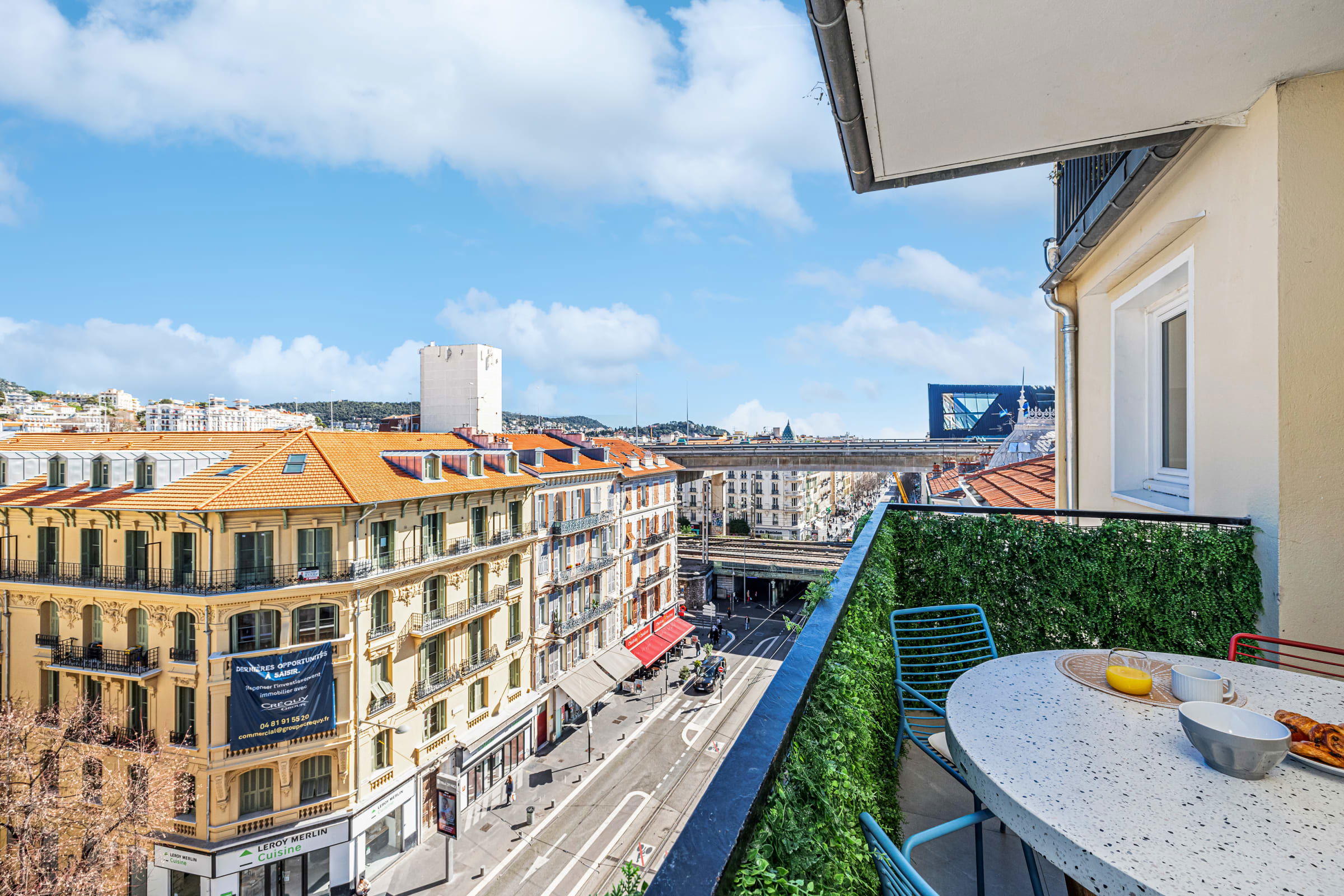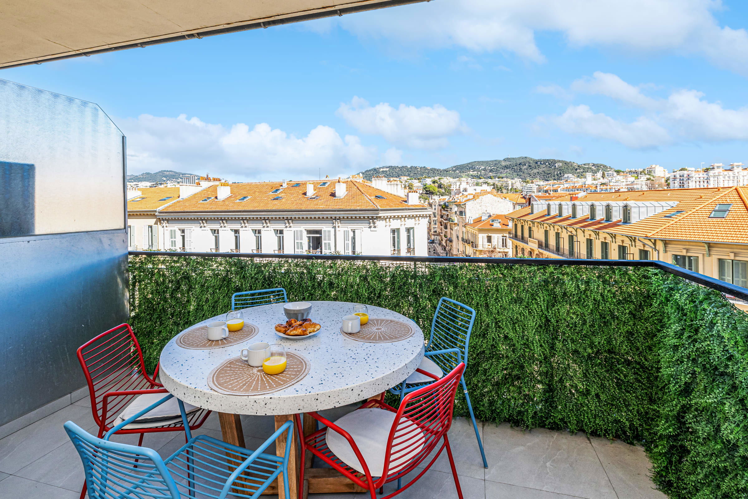 🌿 La terrasse orientée sud-est offre une vue panoramique sur les toits de la ville et les montagnes du Mont Boron et de l’Alban Mont Chauve. Véritable atout en cœur de ville, ce rare espace extérieur, aménagé avec table et chaises, est parfait pour savourer un petit-déjeuner au soleil ou un apéritif en fin de journée.