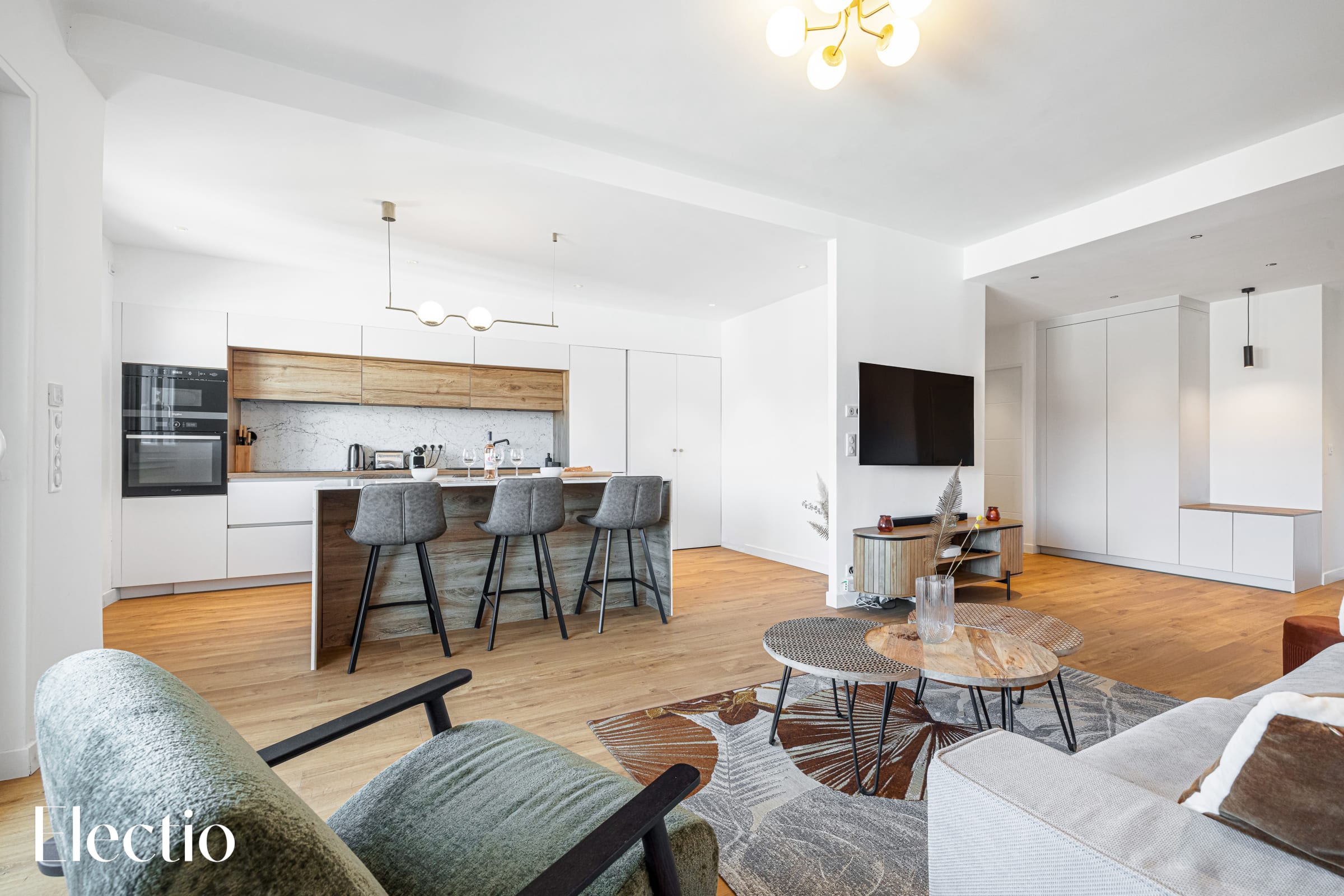☀️ La pièce de vie, lumineuse et conviviale, combine un salon douillet et une cuisine parfaitement équipée. Spacieux, le salon invite à la détente avec un canapé-lit confortable, un fauteuil, une table basse et une smart TV connectée (Netflix inclus) pour vos soirées cinéma. La décoration, mêlant bois naturel et touches graphiques, crée une ambiance à la fois chaleureuse et raffinée.