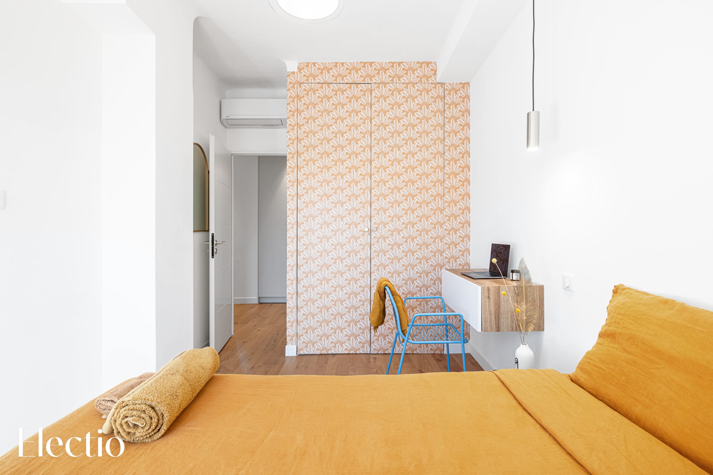 🛏️ La seconde chambre, lumineuse, dispose d’un accès direct au balcon avec vue sur la cour et les collines de l’ouest niçois, ainsi que sur un palais historique. Elle est équipée d’un lit double, de rangements et d’un bureau discret, idéal pour télétravailler ou écrire quelques cartes postales. Juste à côté, la seconde salle d’eau comprend une douche à l’italienne, une grande vasque, un miroir, un sèche-serviette et des toilettes.