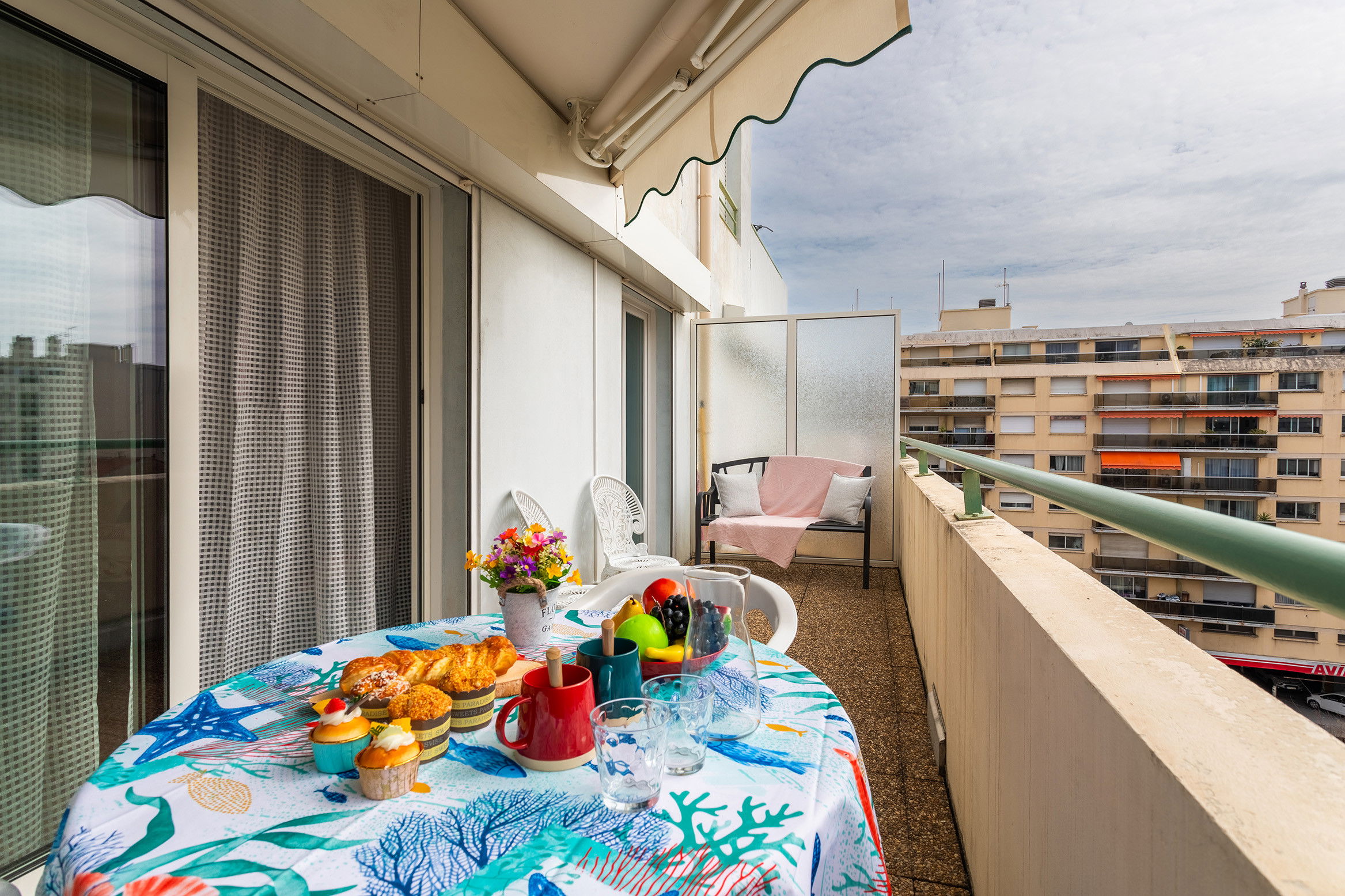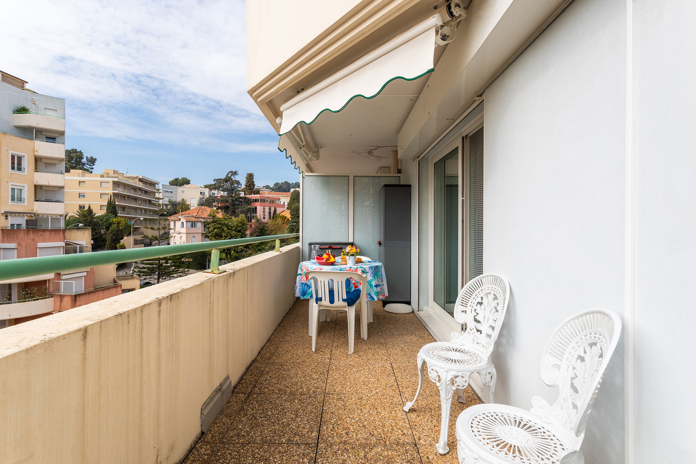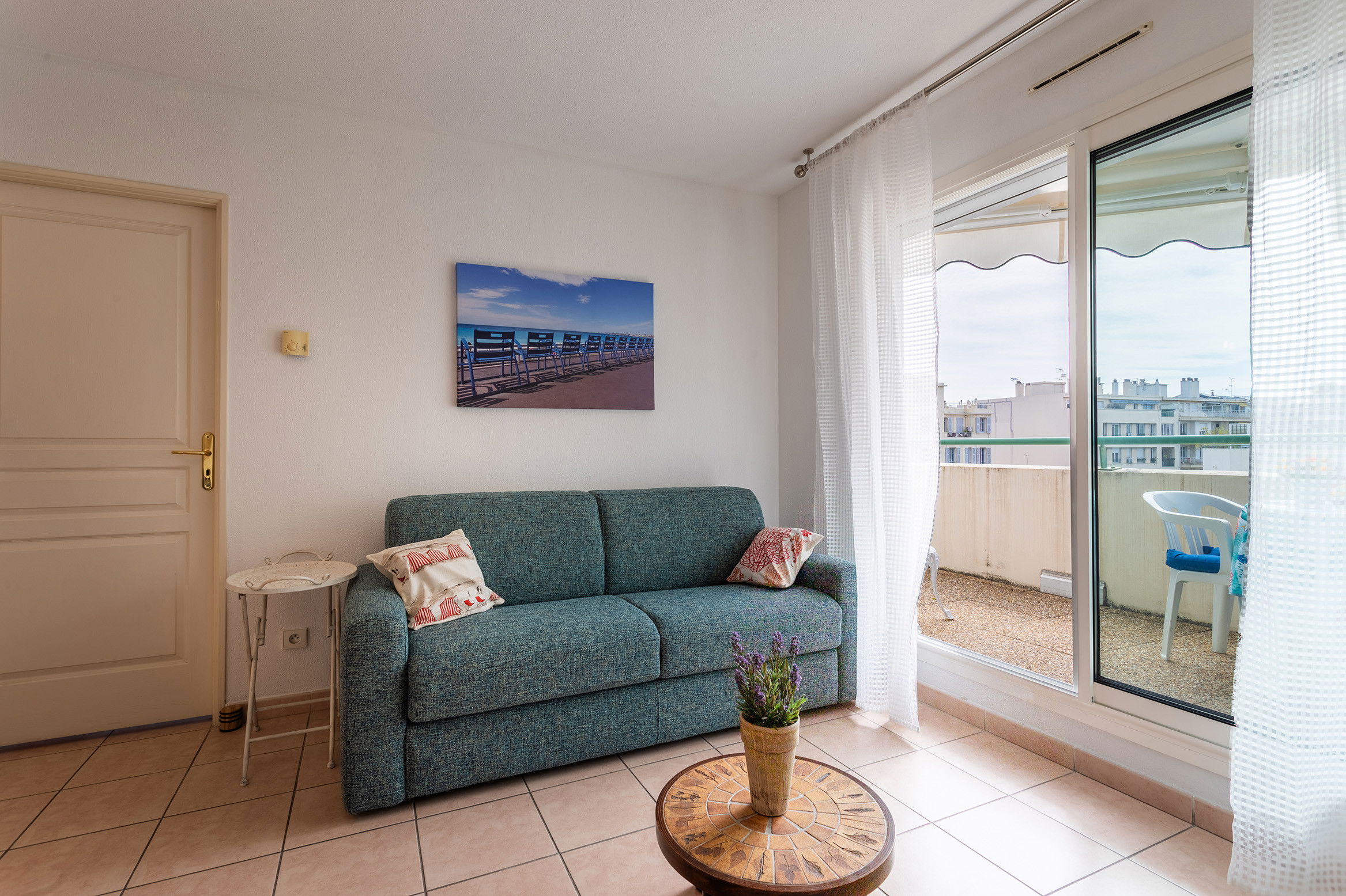 Appartement de location saisonnière de 2 pièces situé A Nice en centre-ville et proche de la plage ,Promenade des Anglais et commerces , Idéalement situé , il possède une chambre avec 1 lit 160cm ,une salle d'eau avec douche et WC , un coin cuisine équipé avec table et chaise, et un salon avec un canapé-lit double et une terrasse de 10m2