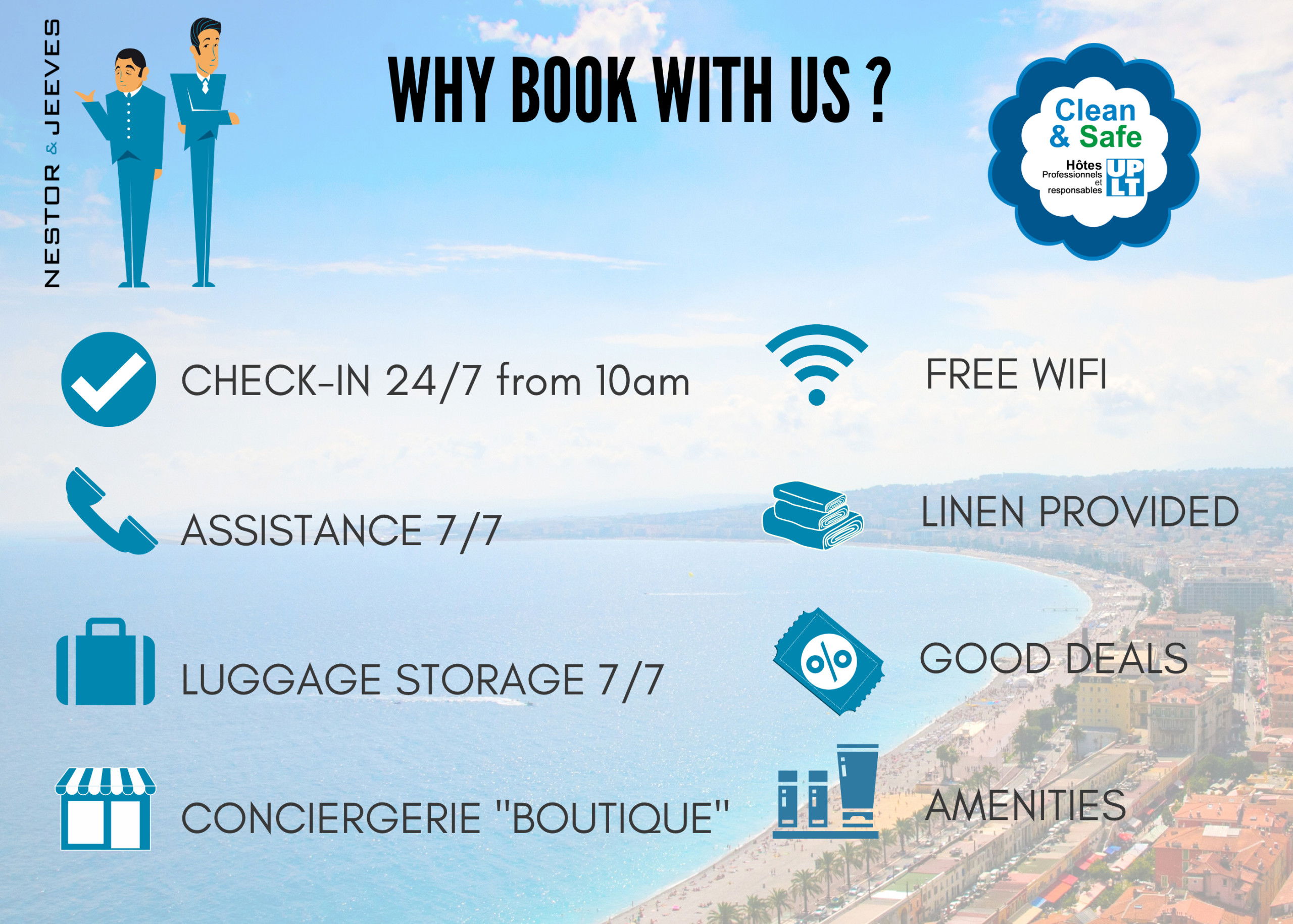 Un service de conciergerie située dans le centre de Nice sera présente pour vous accompagner pendant toute la durée de votre séjour.