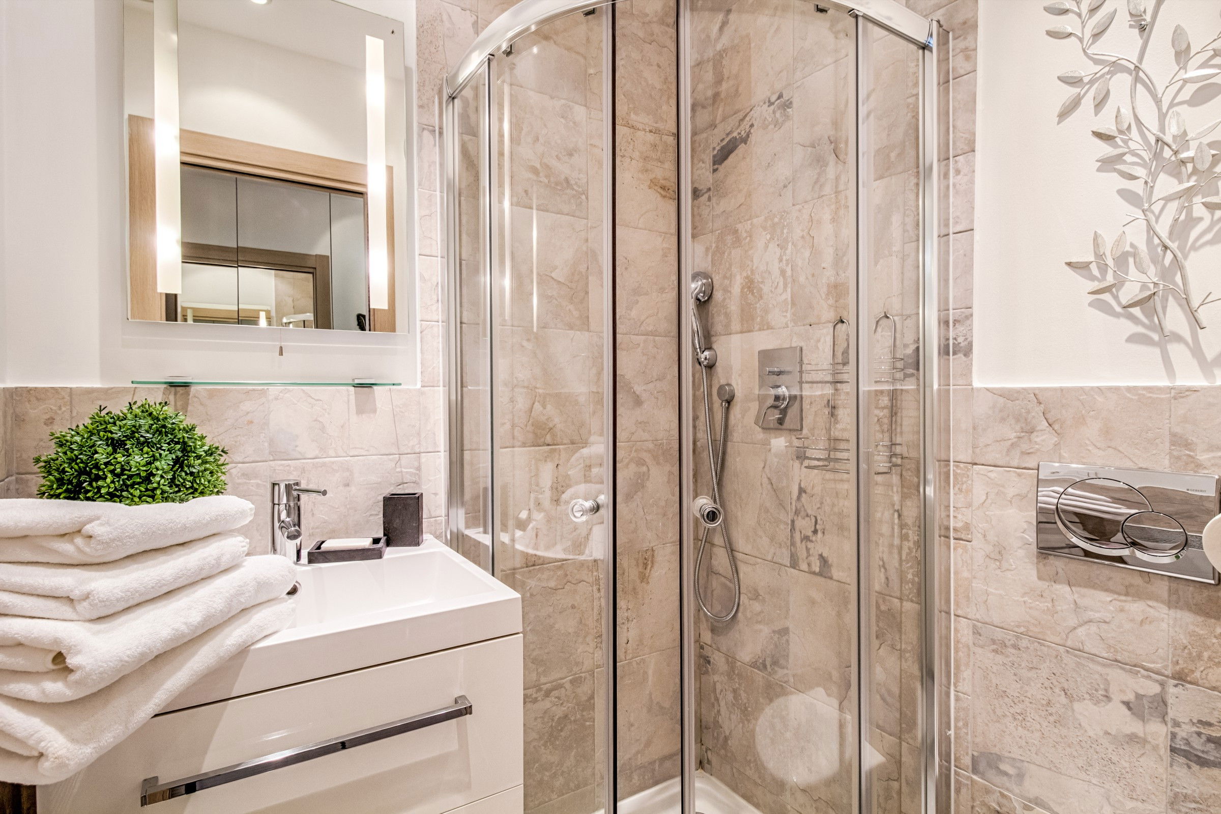 La salle de bain est équipée d’une belle douche, un lavabo, un miroir éclairé, un sèche-serviette, un sèche-cheveux et des WC suspendus.