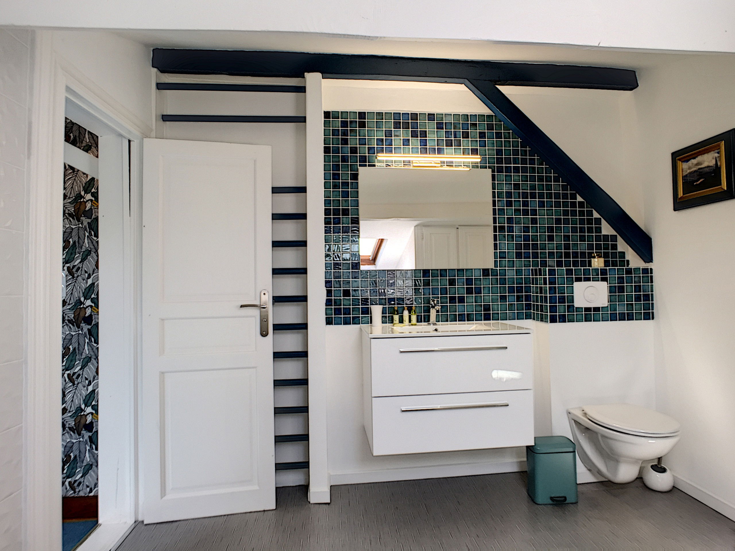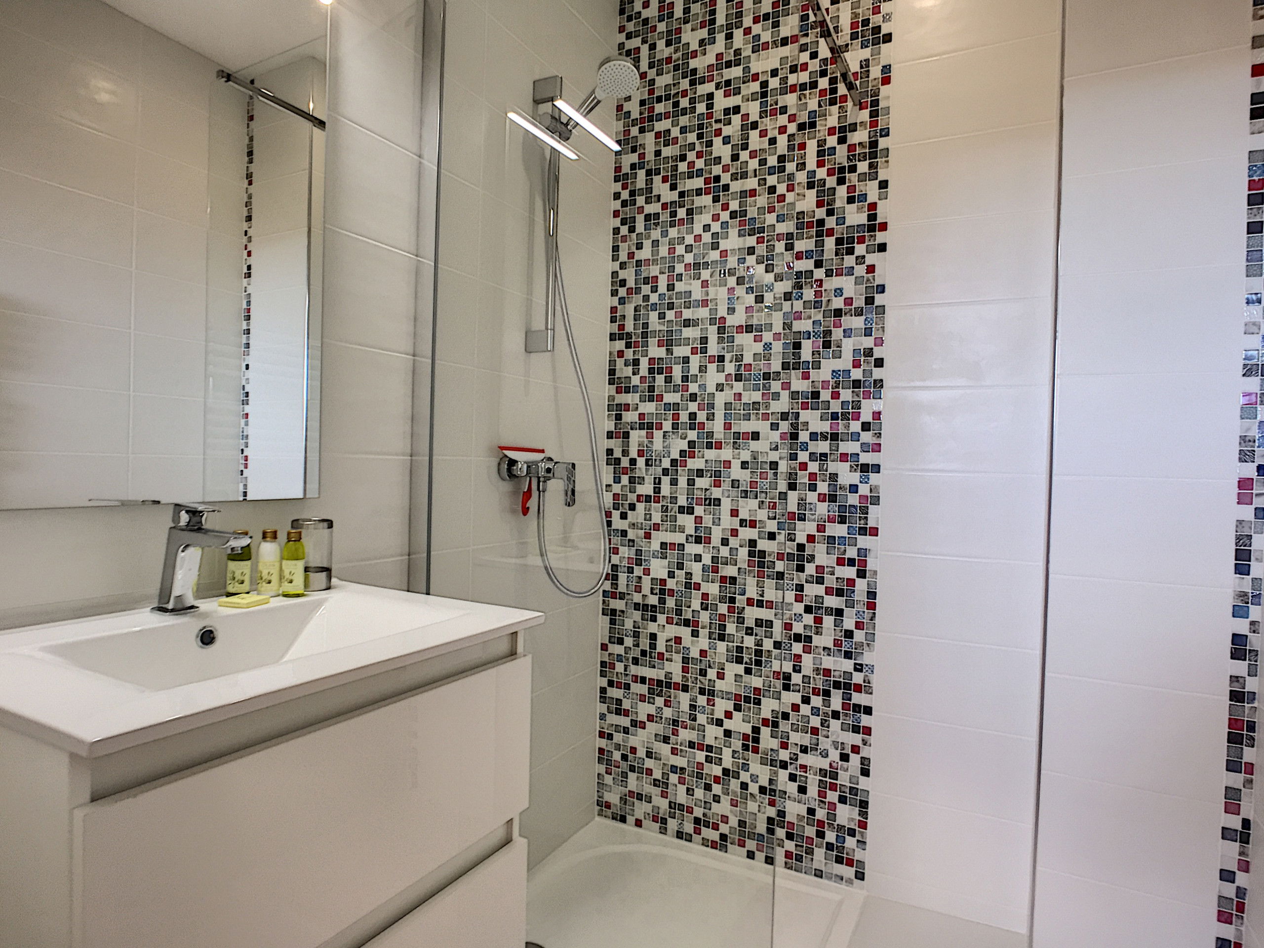 Elle comprend une douche à l’italienne, un lavabo, un sèche-serviettes et un sèche-cheveux.