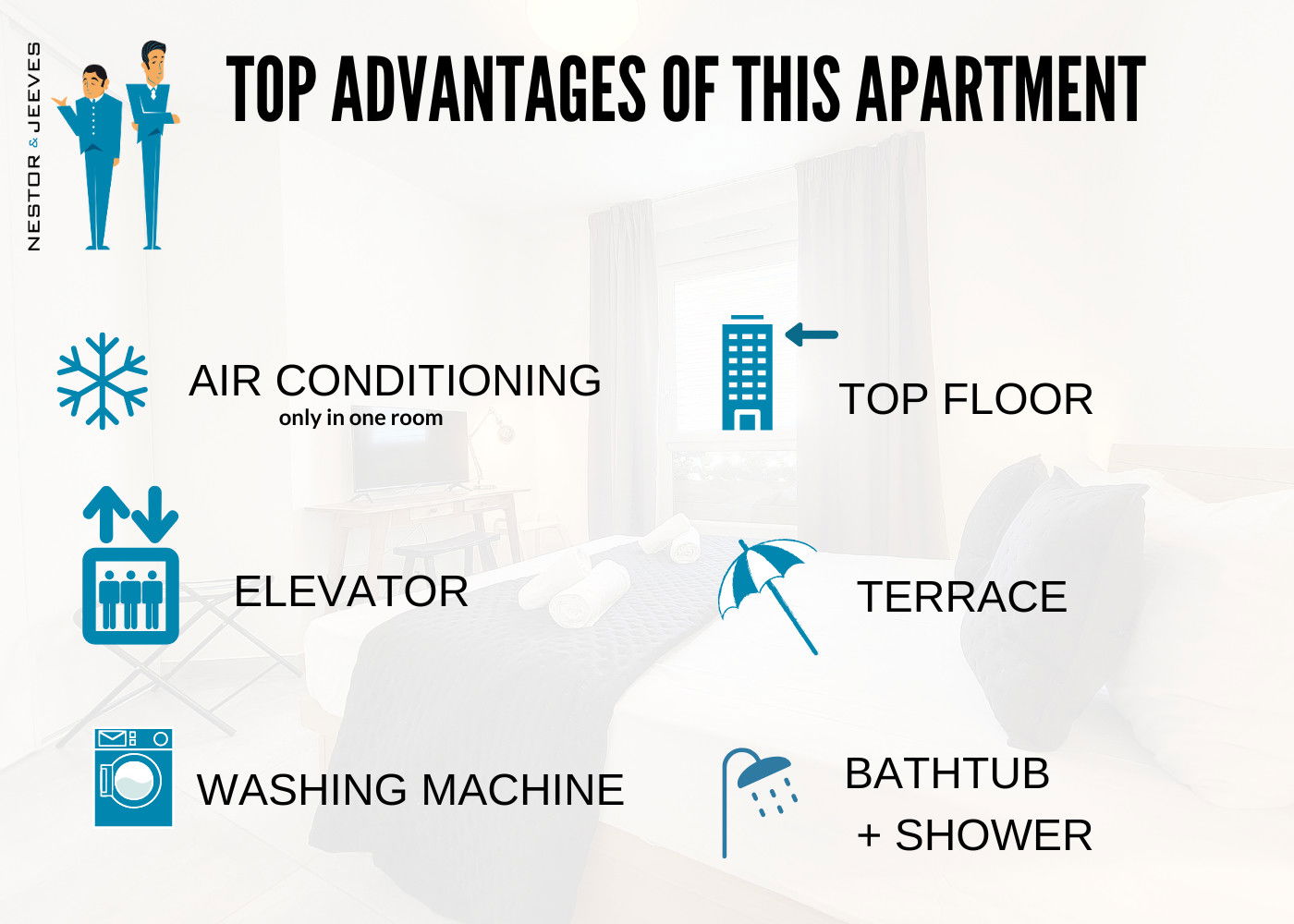 L’appartement est au 5ème et dernier étage. Il accessible par ascenseur. Il bénéficie d’une connexion Wifi gratuite. La climatisation se trouve dans la chambre à l’étage qui est ouverte et en mezzanine.