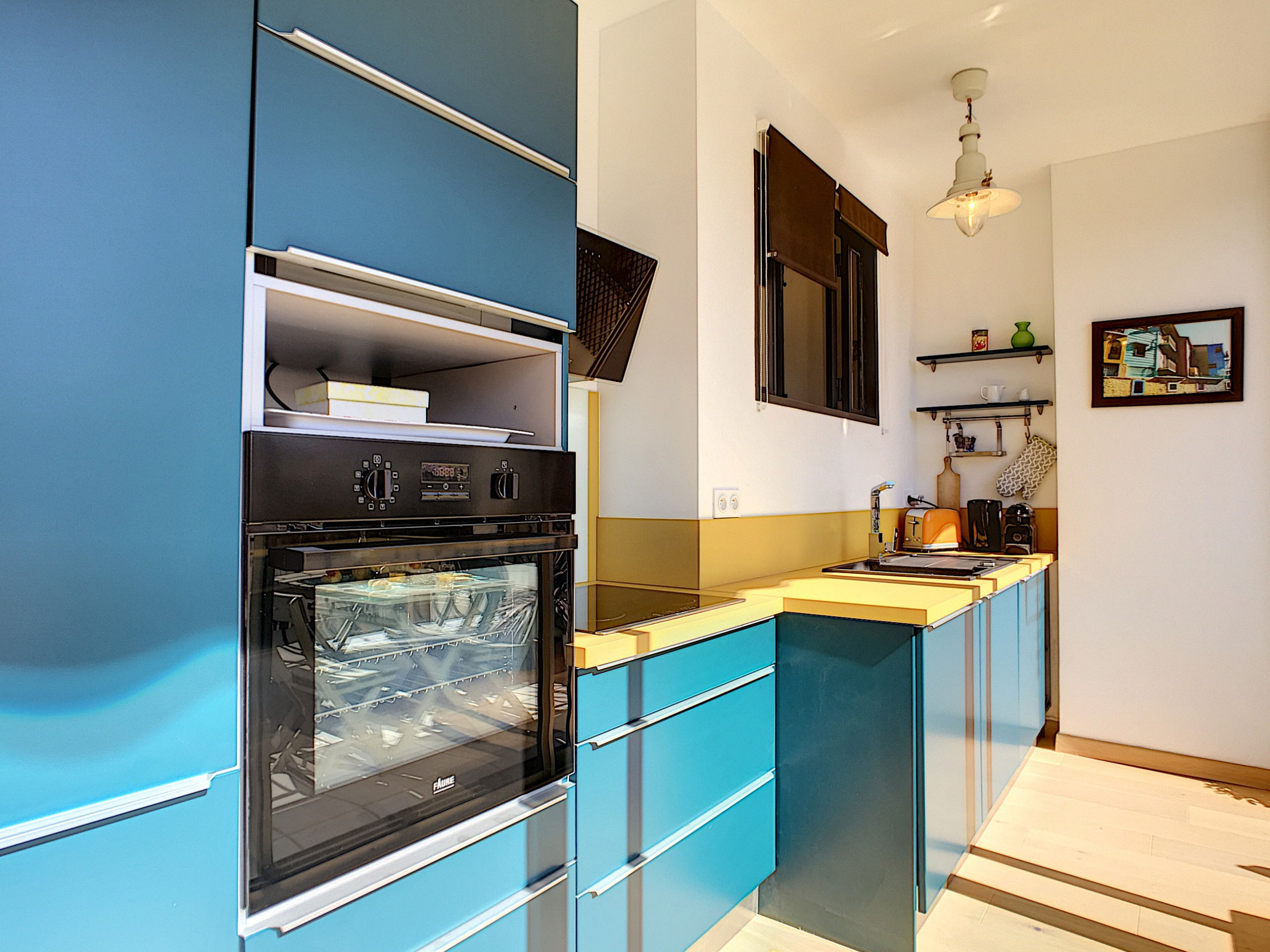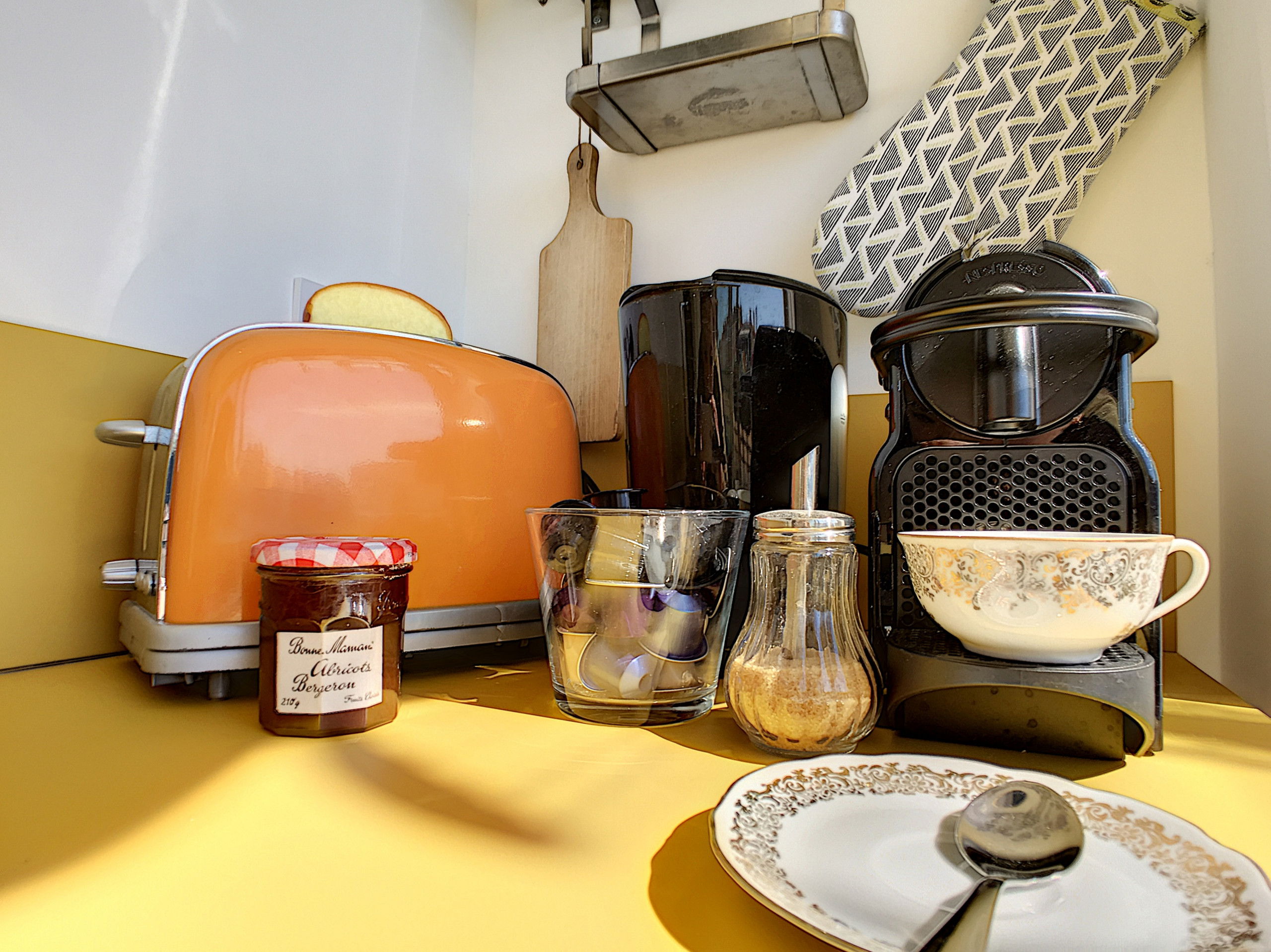 Cuisine américaine donnant sur le séjour, équipée de plaque de cuisson à induction, d’un réfrigérateur, congélateur, un micro-onde, une bouilloire, un grille-pain, un lave-vaisselle, une machine à café Nespresso et un lave-linge.