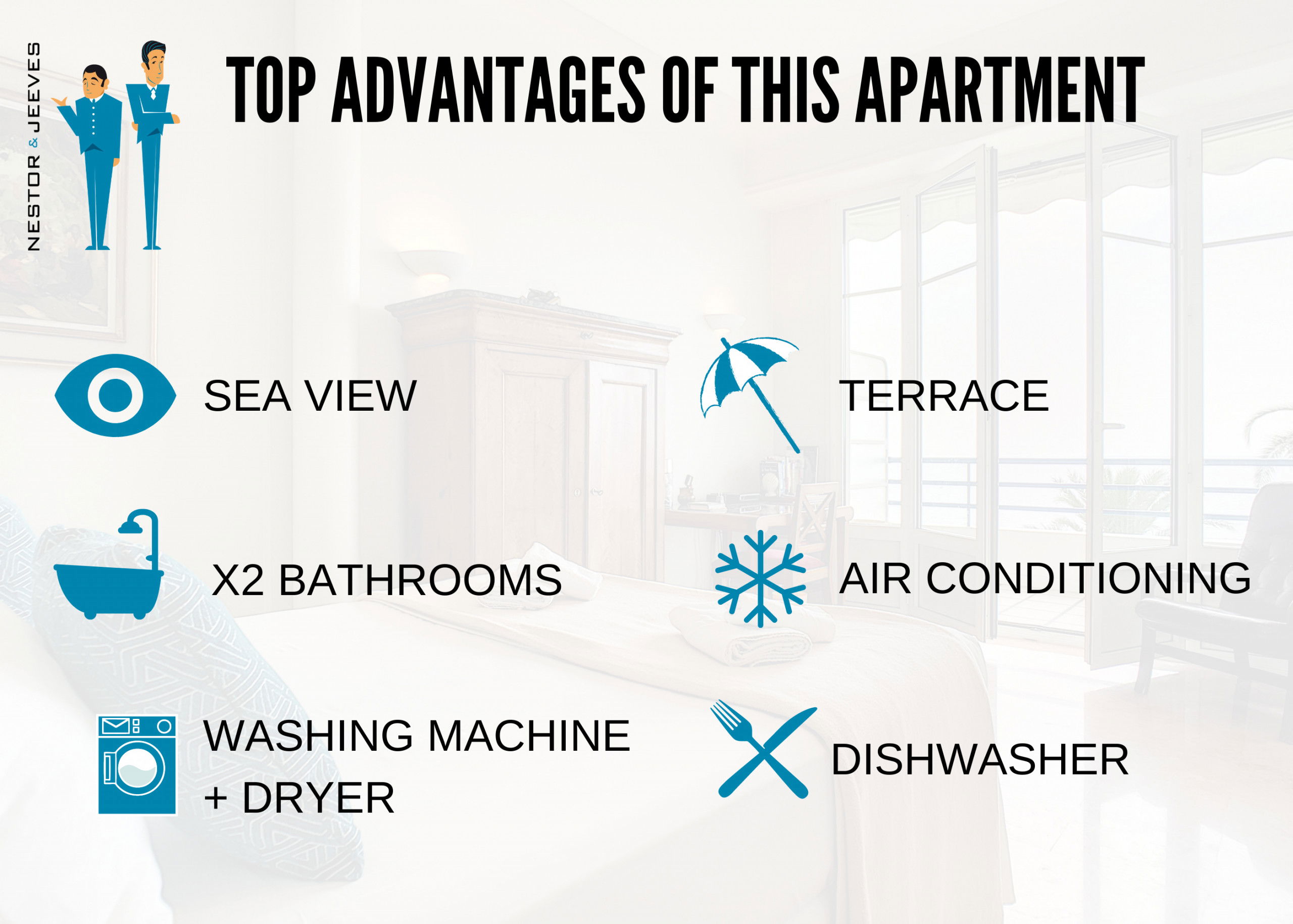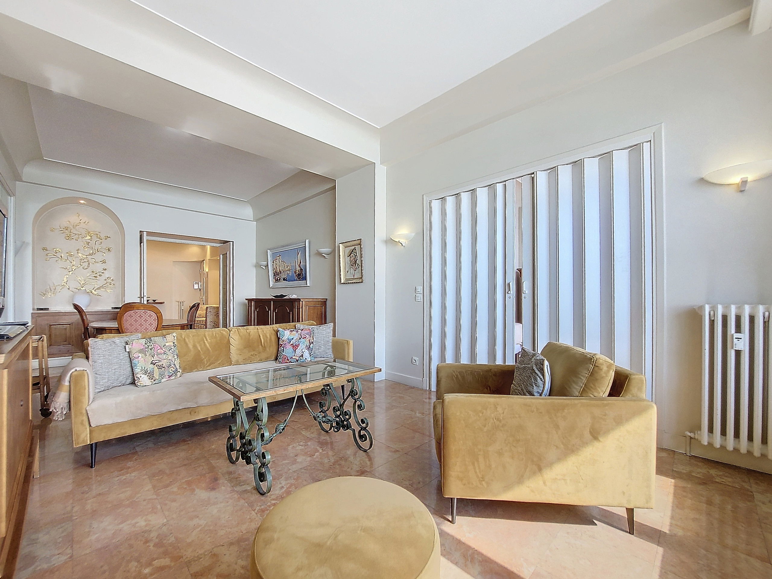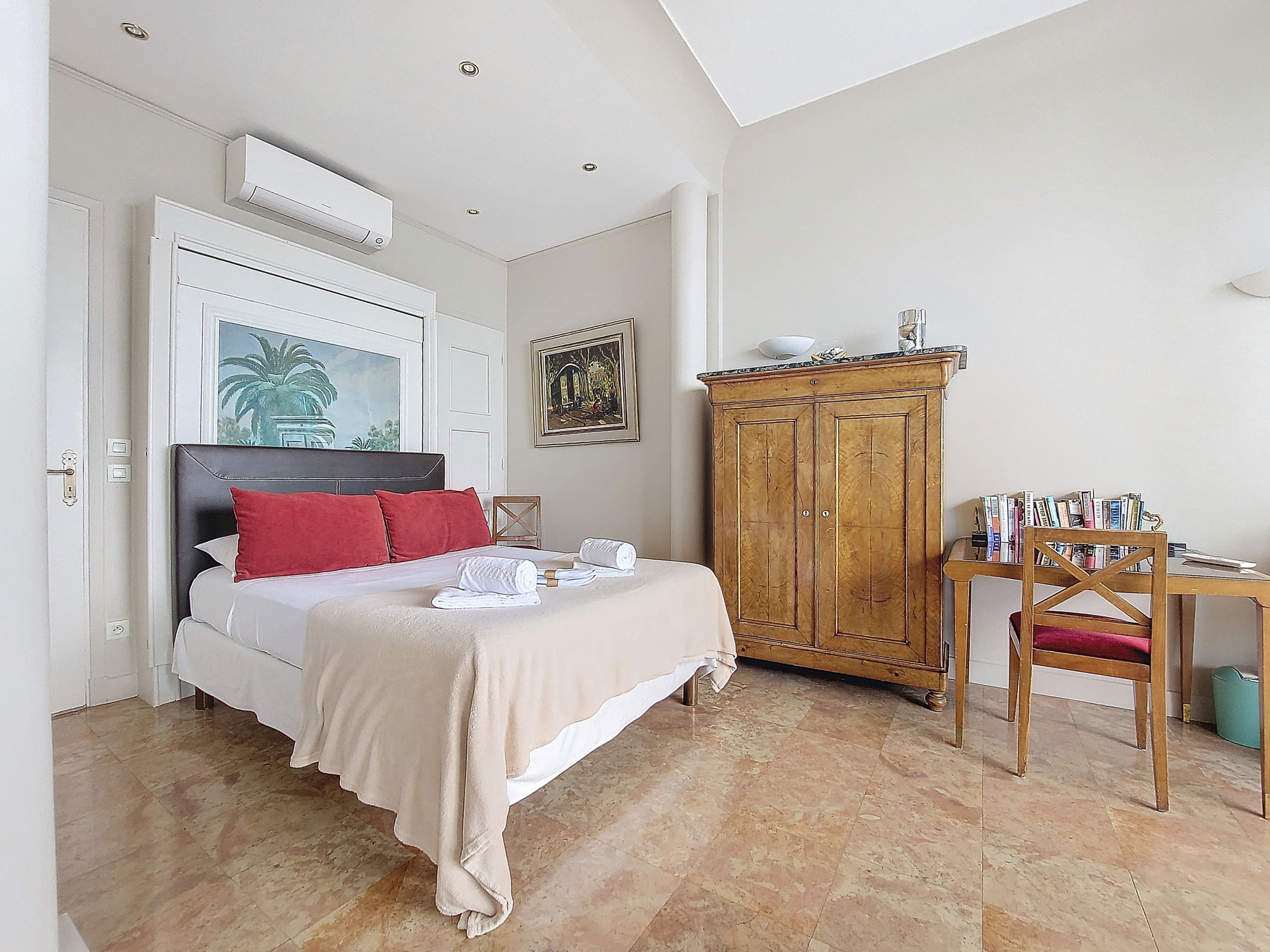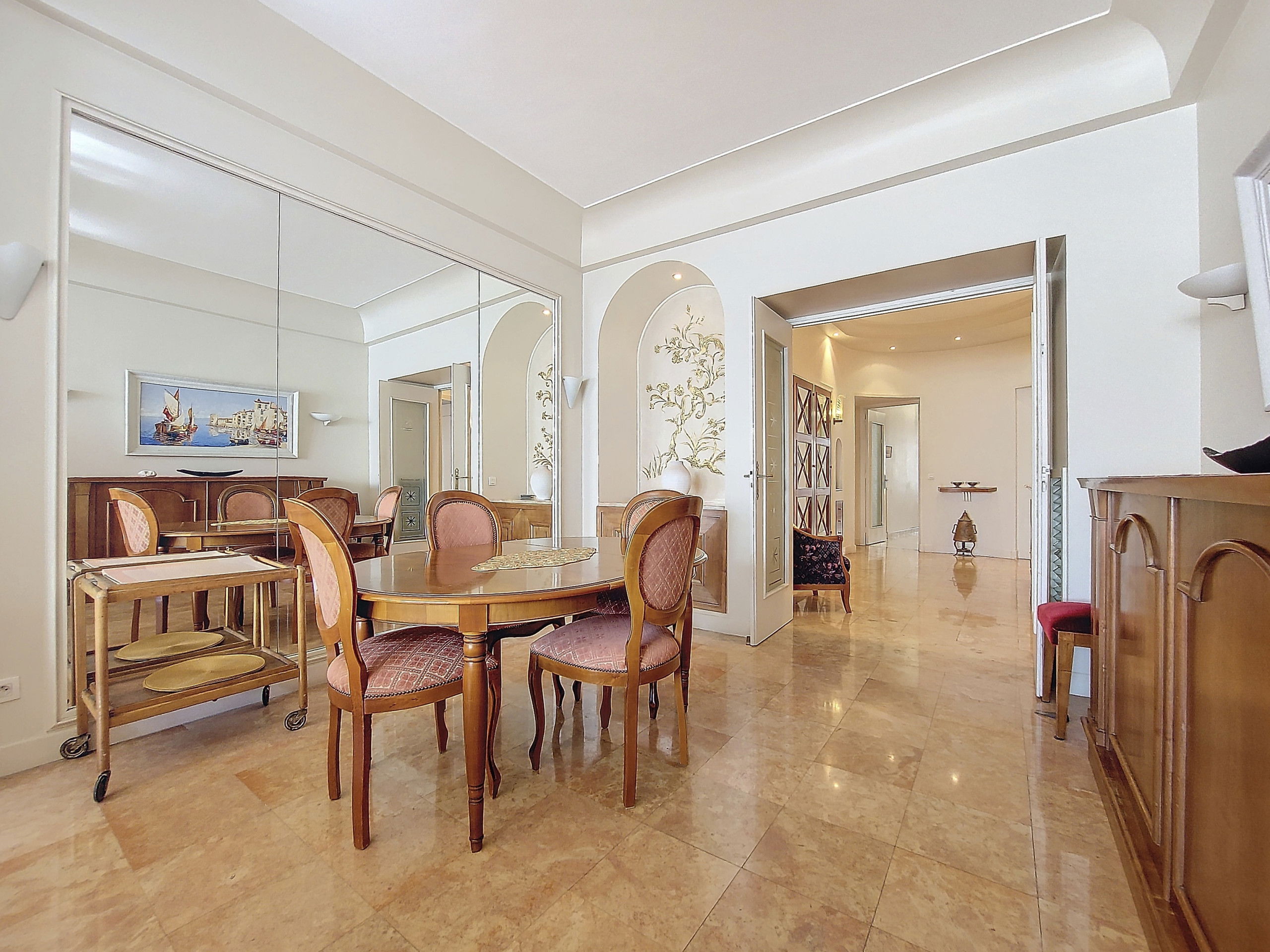 Bel appartement climatisé de deux chambres et deux salles de bain. Il a une localisation rêvée sur la Promenade des Anglais au niveau du centre-ville. Il bénéficie d’une grande terrasse avec une vue magique sur la mer.