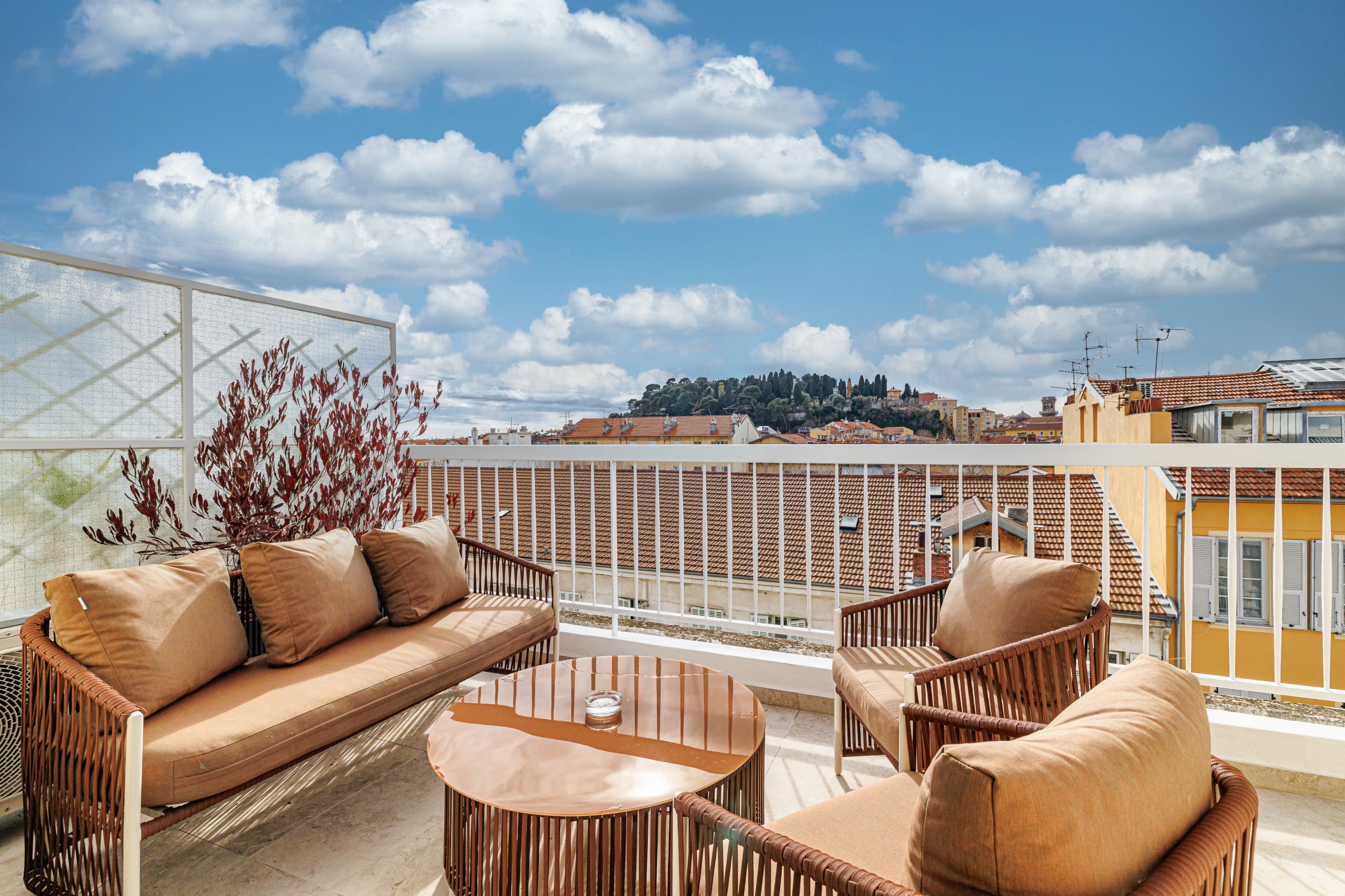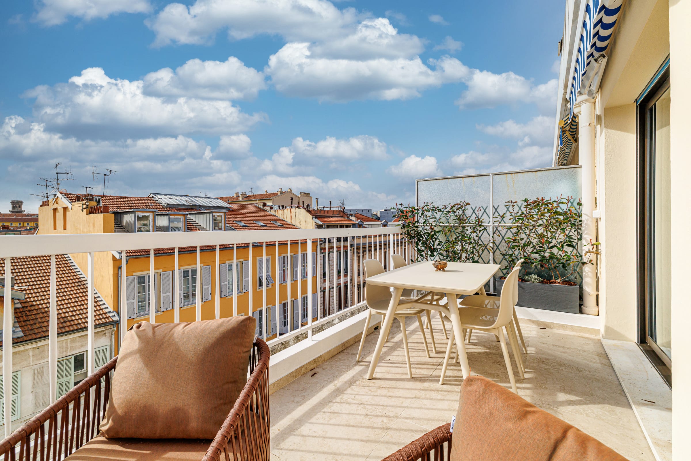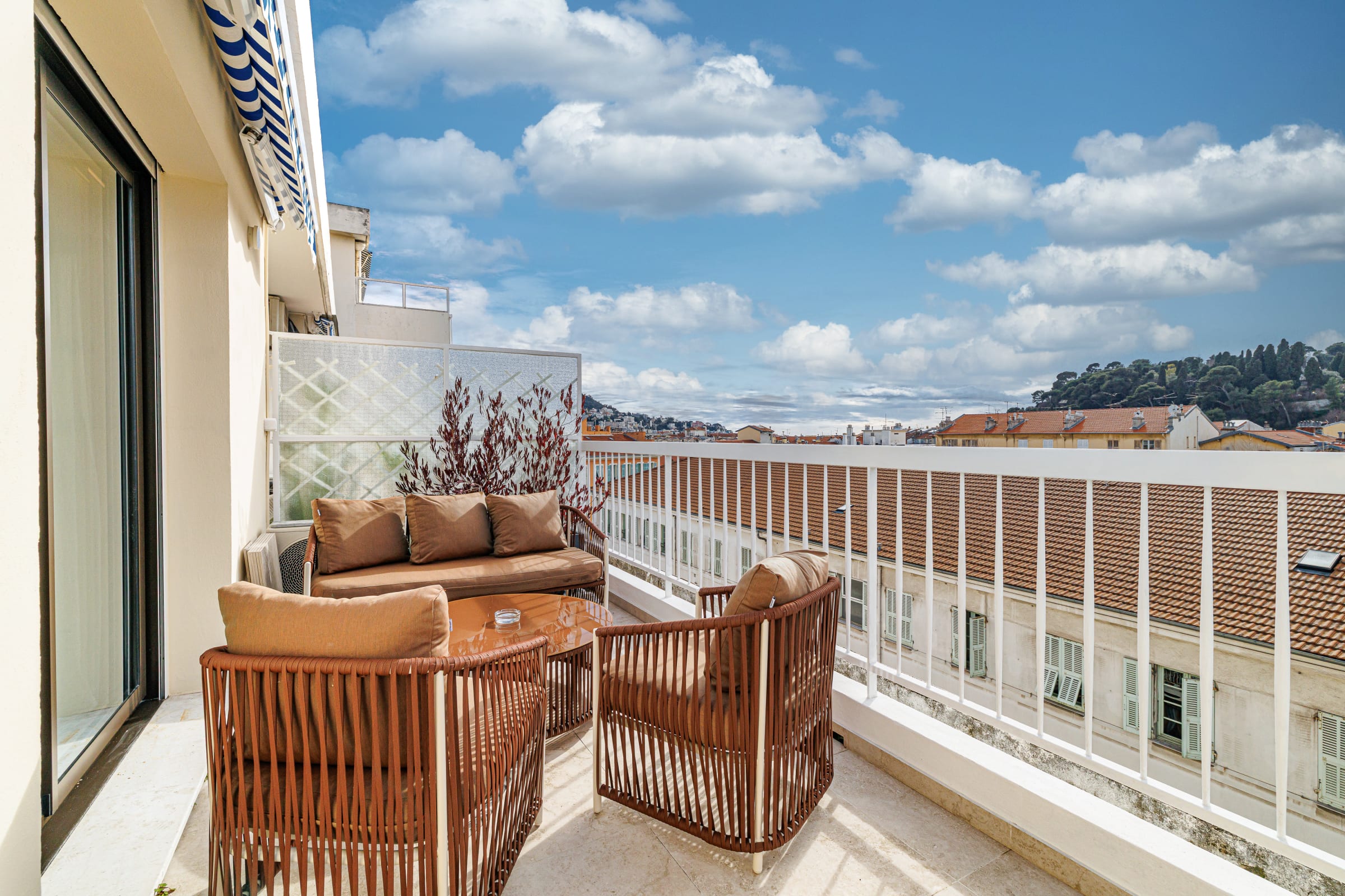🌿 La terrasse de 14 m², accessible depuis le séjour, est un véritable atout. Aménagée avec une table pour quatre personnes et un salon de jardin, elle offre une vue dégagée sur les toits de Nice, la colline du château et le port. L’éclairage d’ambiance permet d’en profiter aussi bien de jour que de soir.