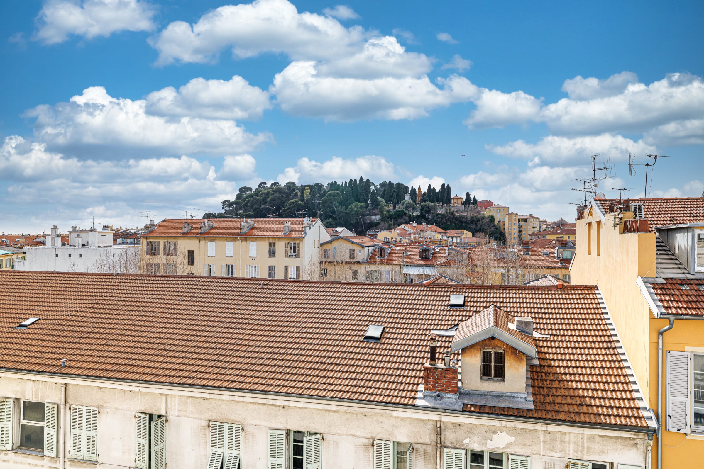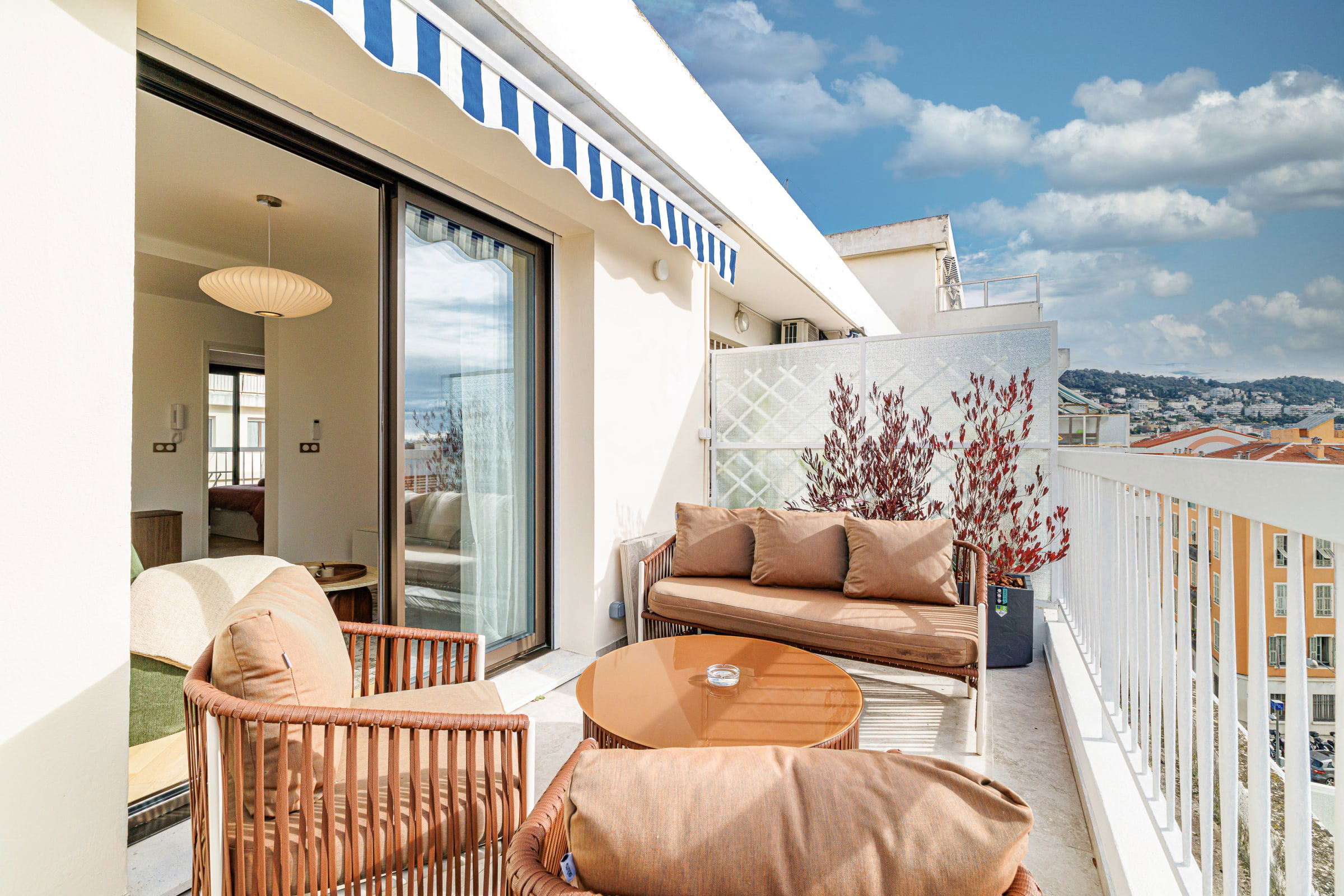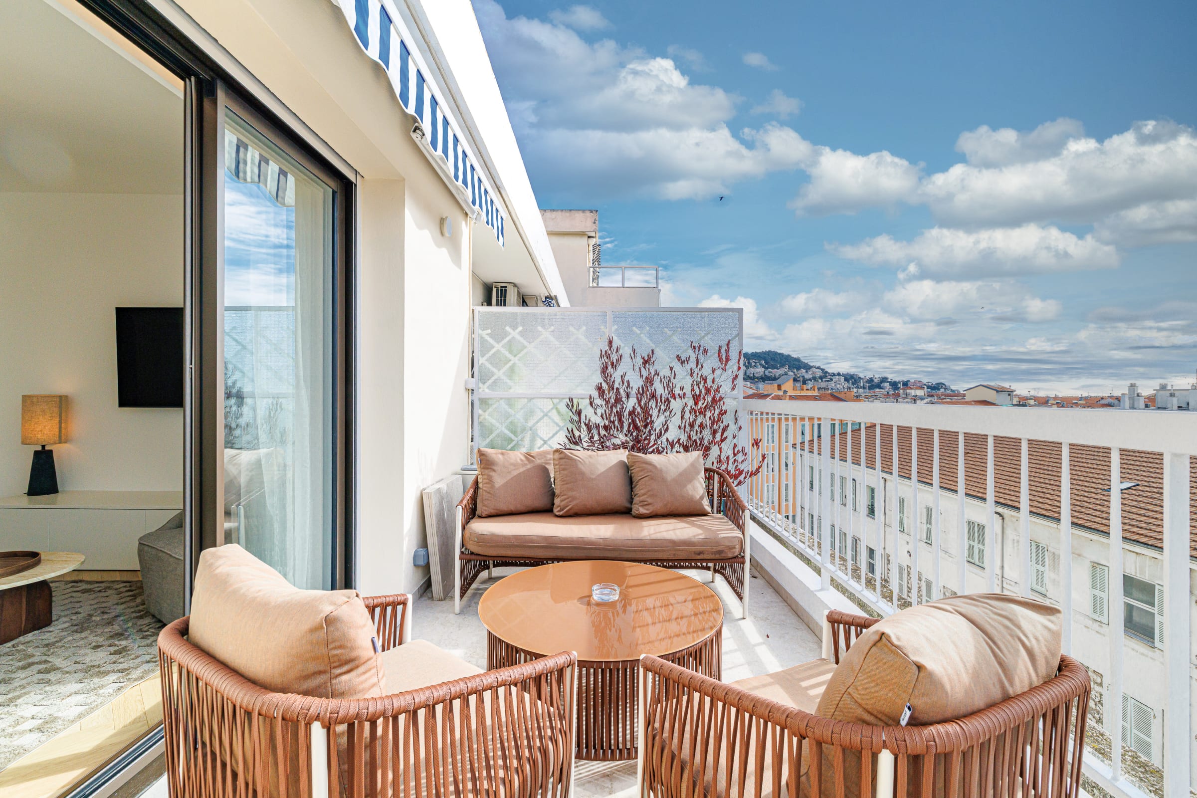 🌿 La terrasse de 14 m², accessible depuis le séjour, est un véritable atout. Aménagée avec une table pour quatre personnes et un salon de jardin, elle offre une vue dégagée sur les toits de Nice, la colline du château et le port. L’éclairage d’ambiance permet d’en profiter aussi bien de jour que de soir.