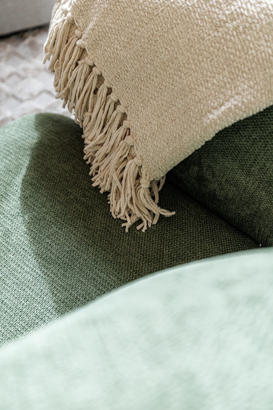 🛋️ Le salon, chaleureux et élégant, invite immédiatement à la détente. Le canapé aux tons verts, harmonieusement intégré à l’espace, fait face à une Smart TV grand format (120 cm).