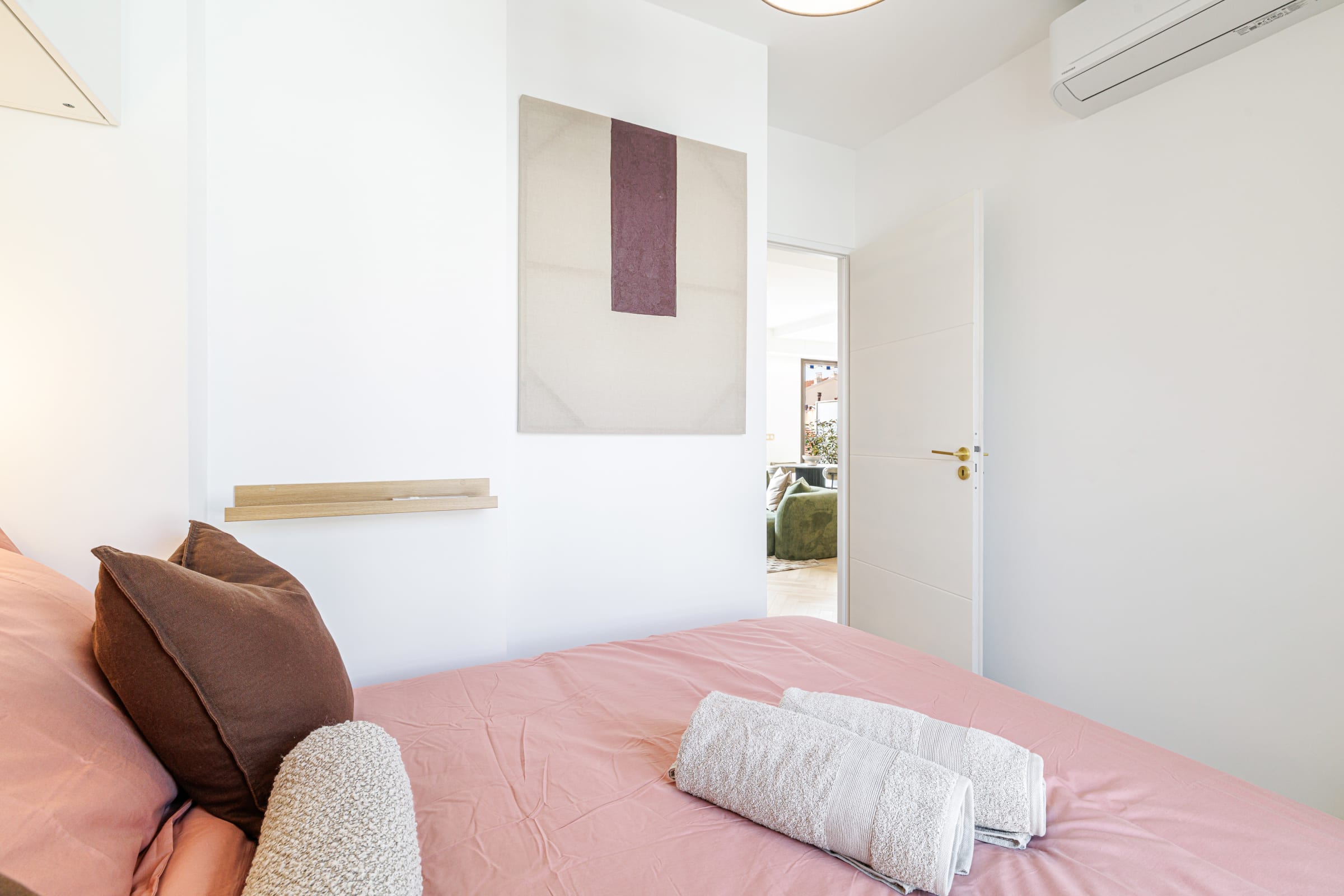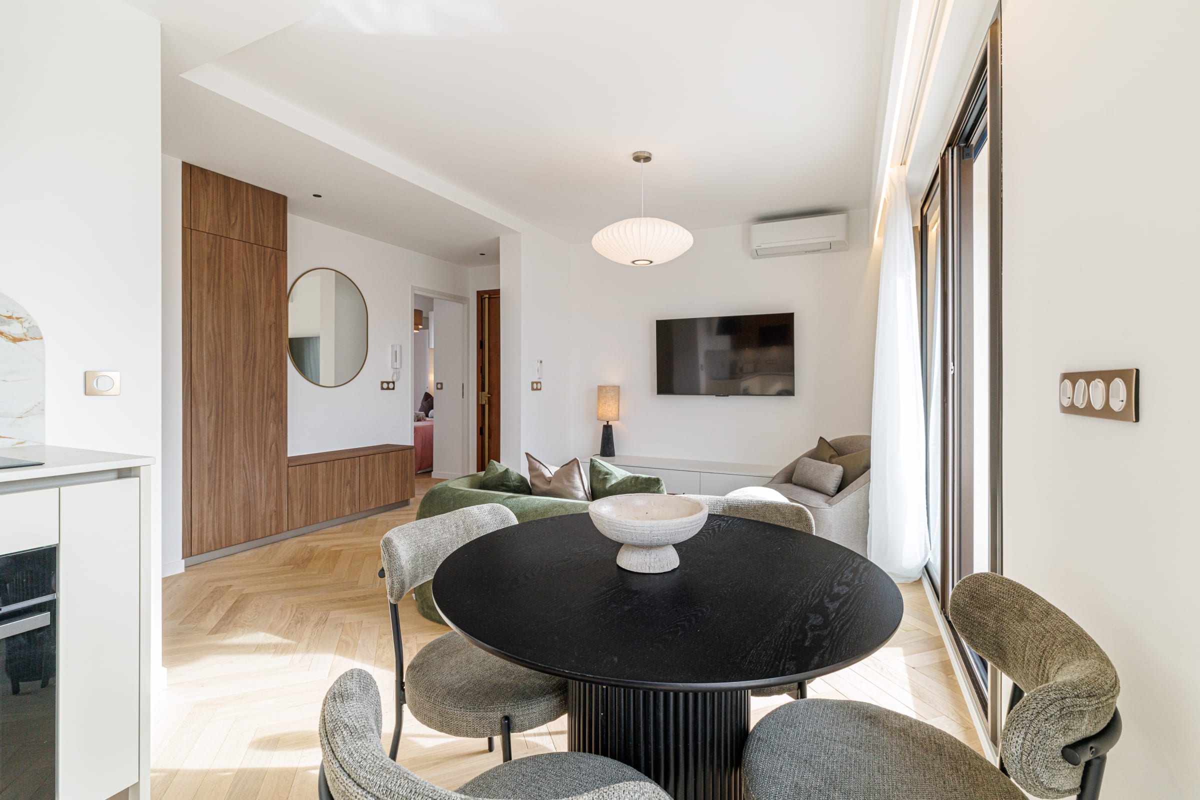Une Smart TV, une lampe suspendue et une décoration soignée viennent compléter cet espace, équipé lui aussi de climatisation réversible.