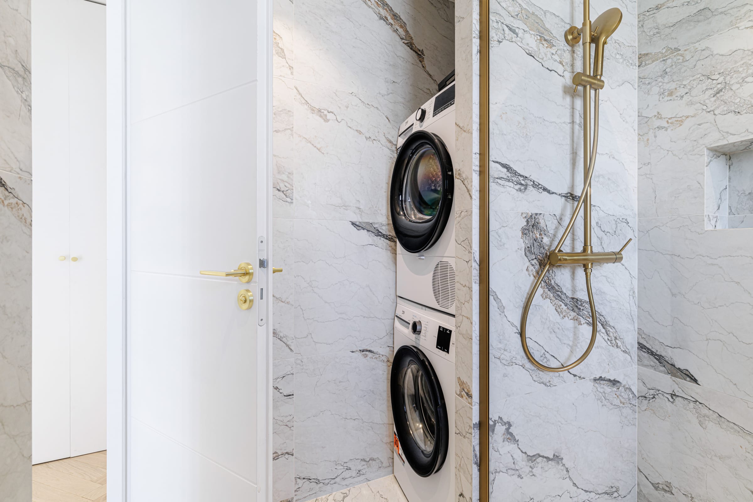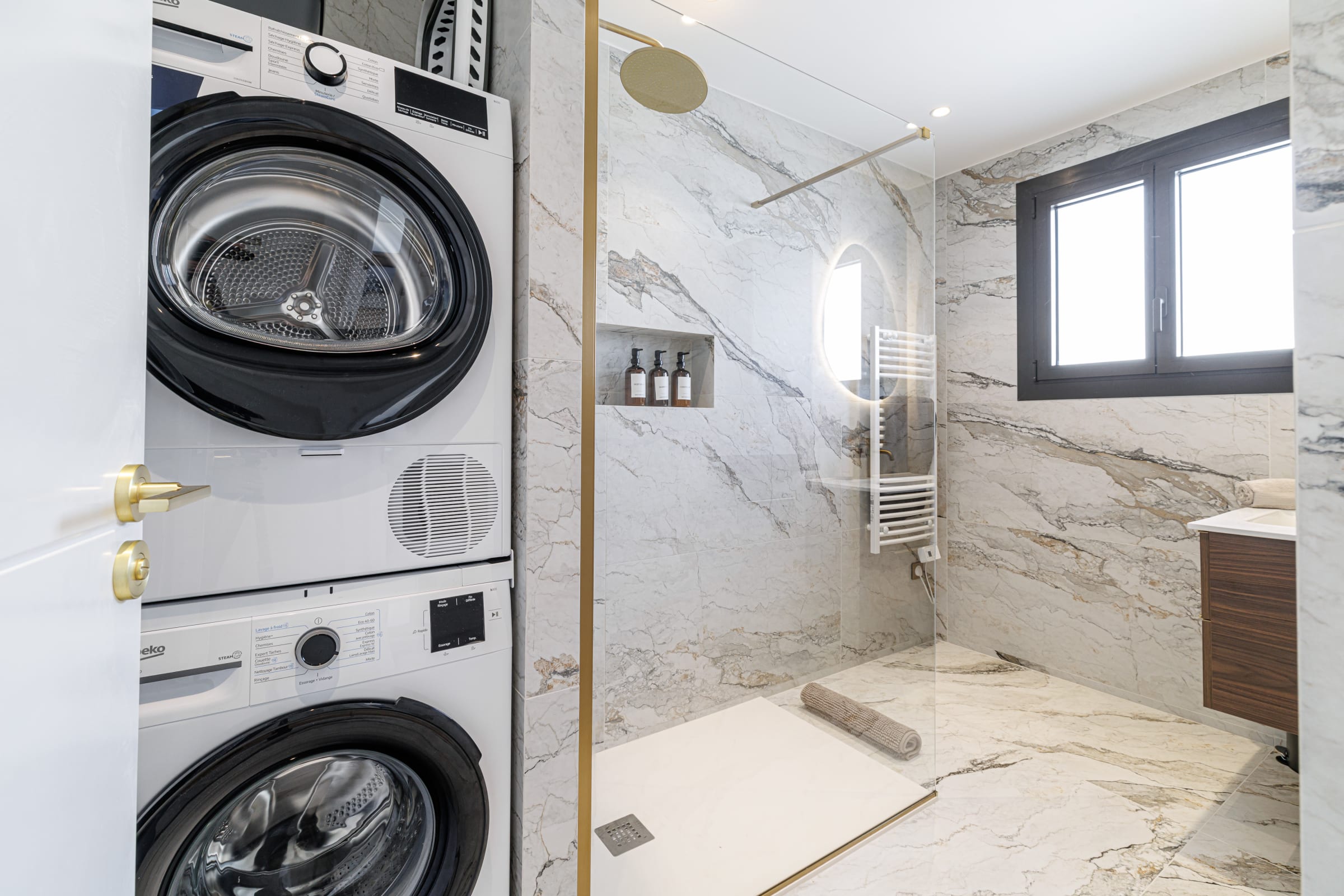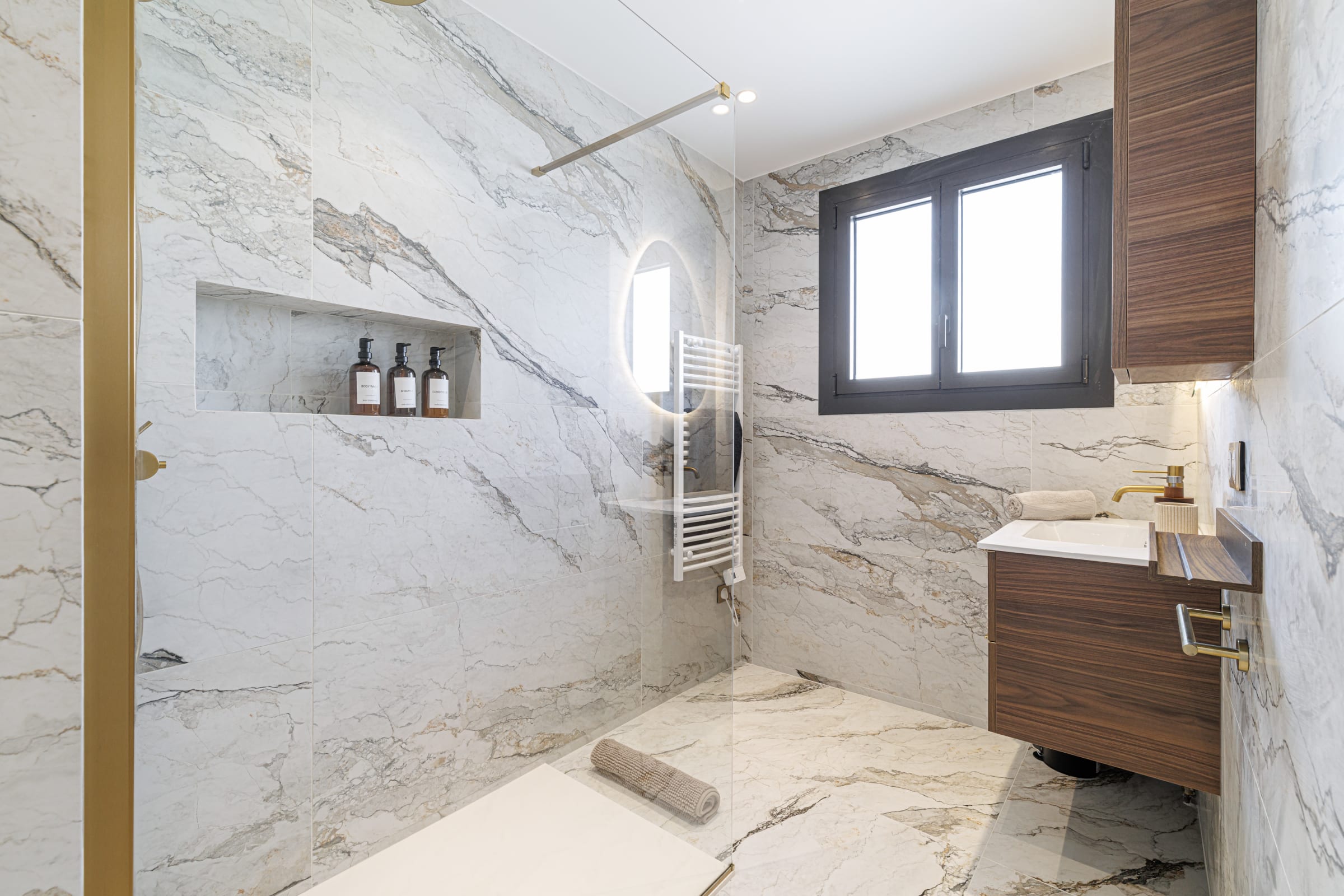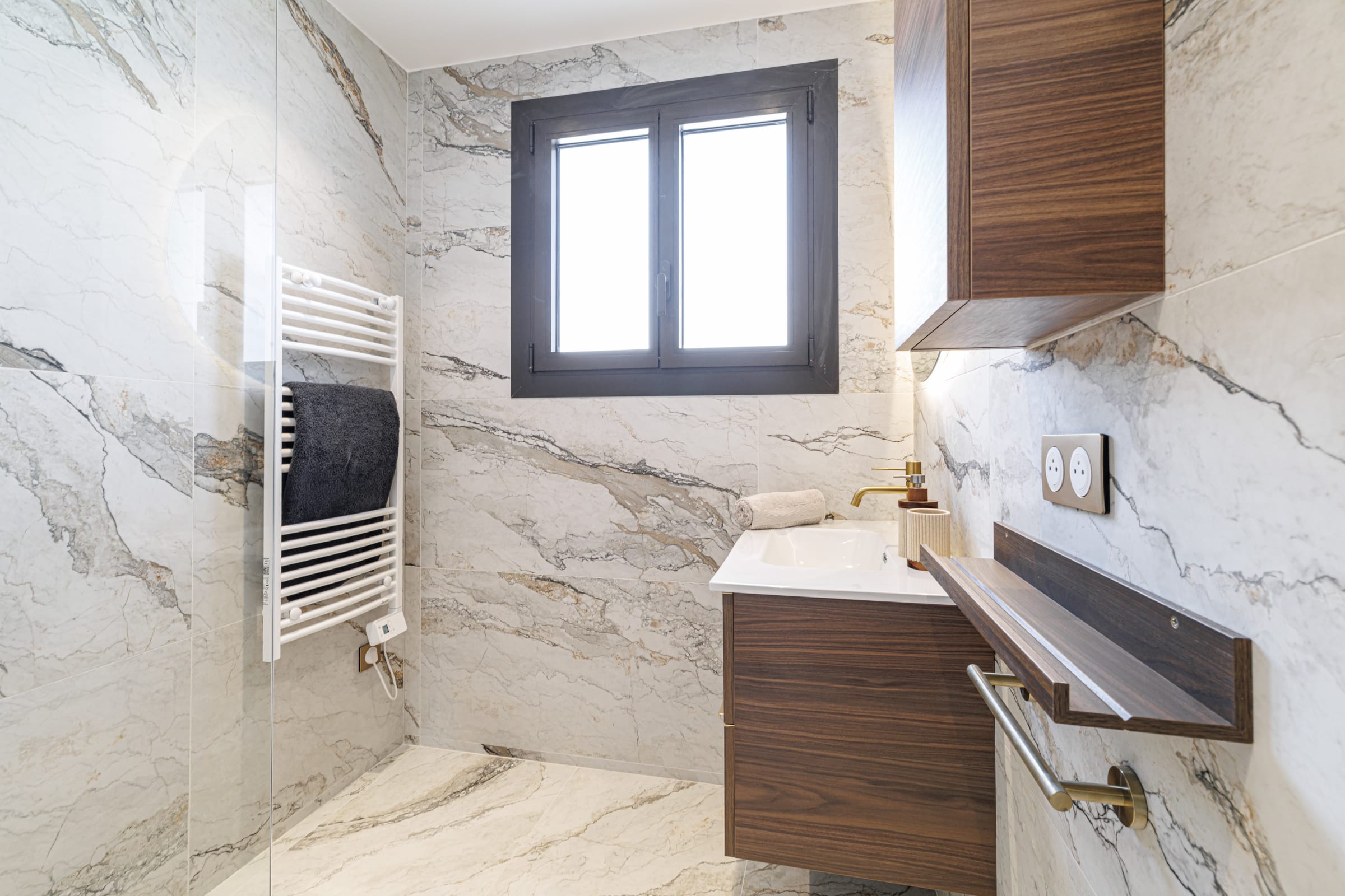 🚿 La salle de bain, entièrement réalisée en effet marbre, allie élégance et fonctionnalité. Elle comprend une douche à l’italienne avec colonne dorée, une niche intégrée avec produits mis à disposition, ainsi qu’un sèche-serviette.
