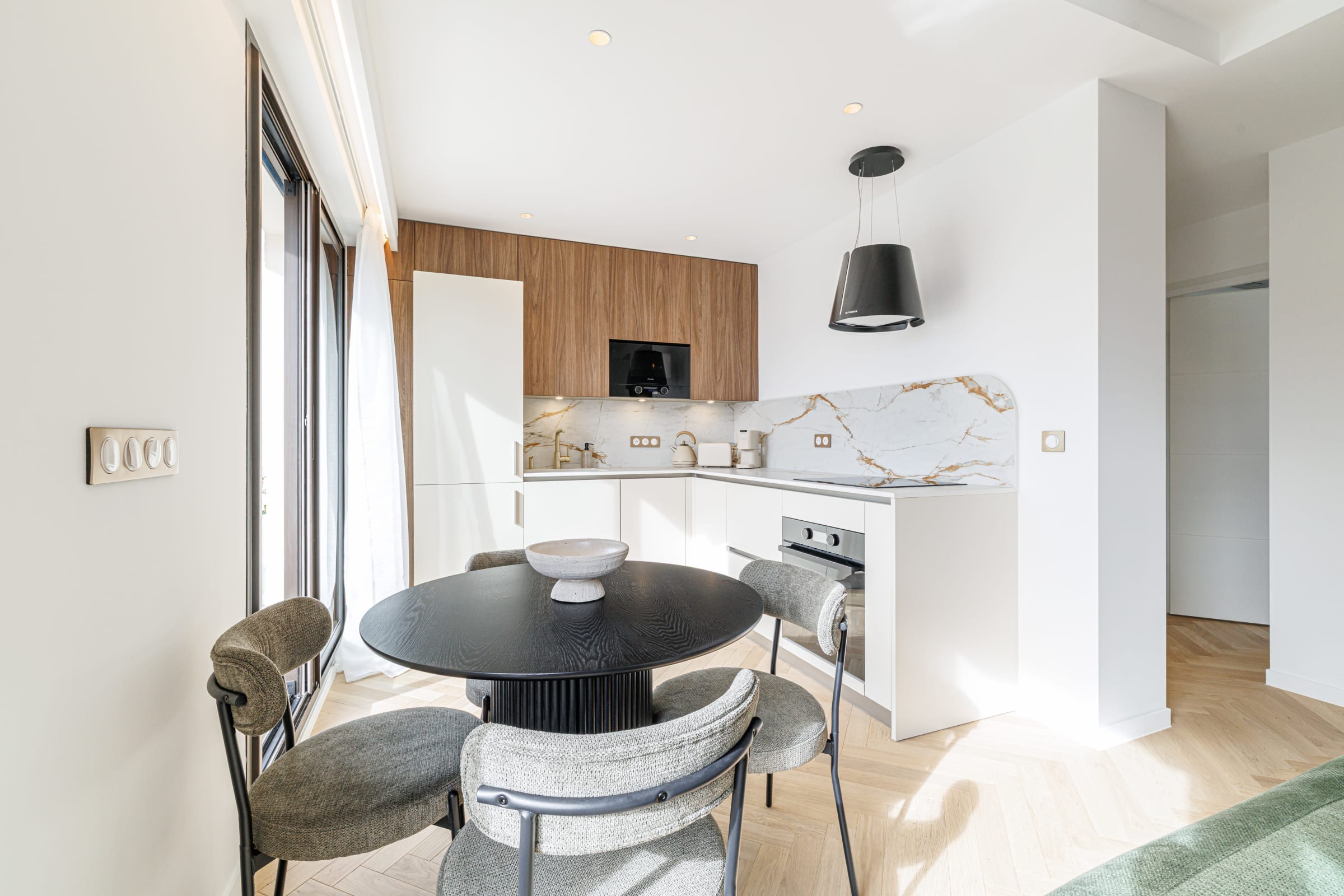 🍽️ La cuisine ouverte, parfaitement intégrée au séjour, mêle avec élégance bois, beige et pierre marbrée.