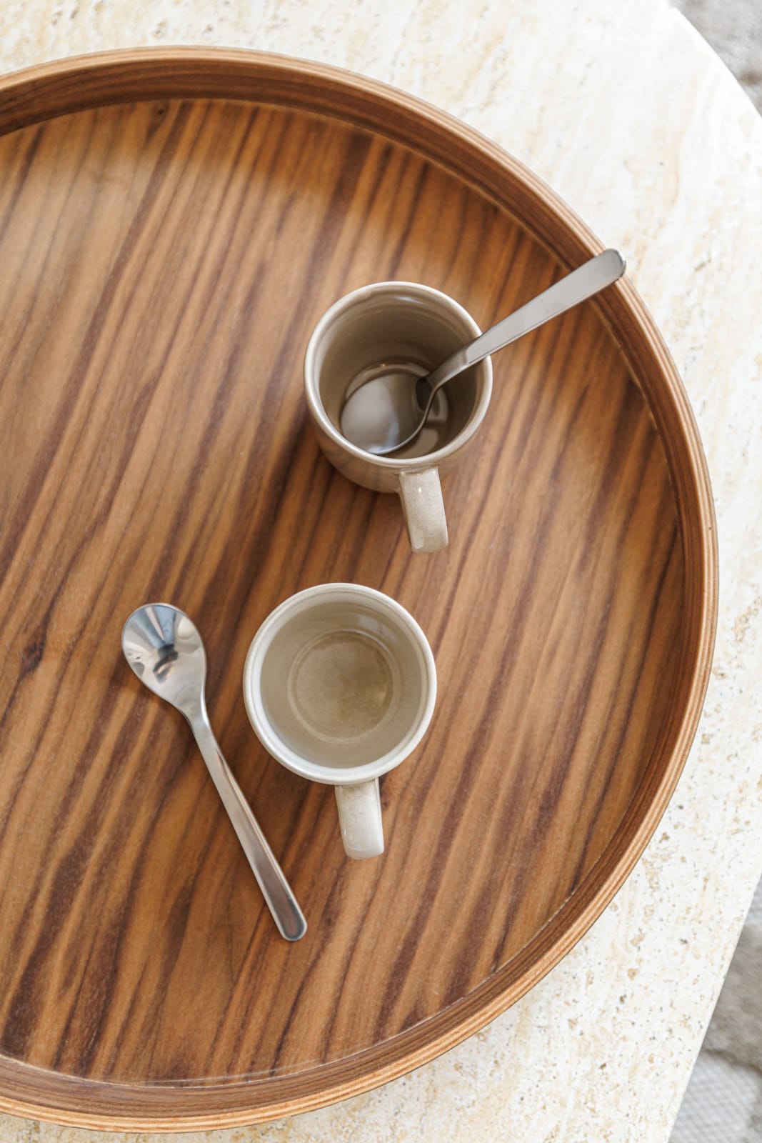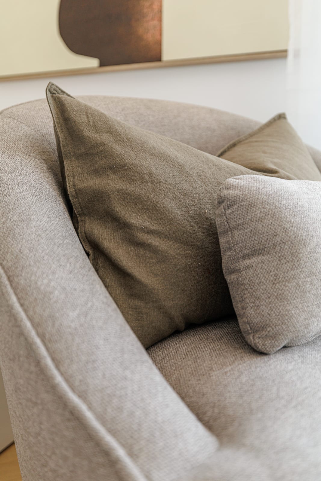 Une table basse effet marbre, posée sur un tapis beige, ainsi qu’un fauteuil confortable, complètent cet espace convivial.