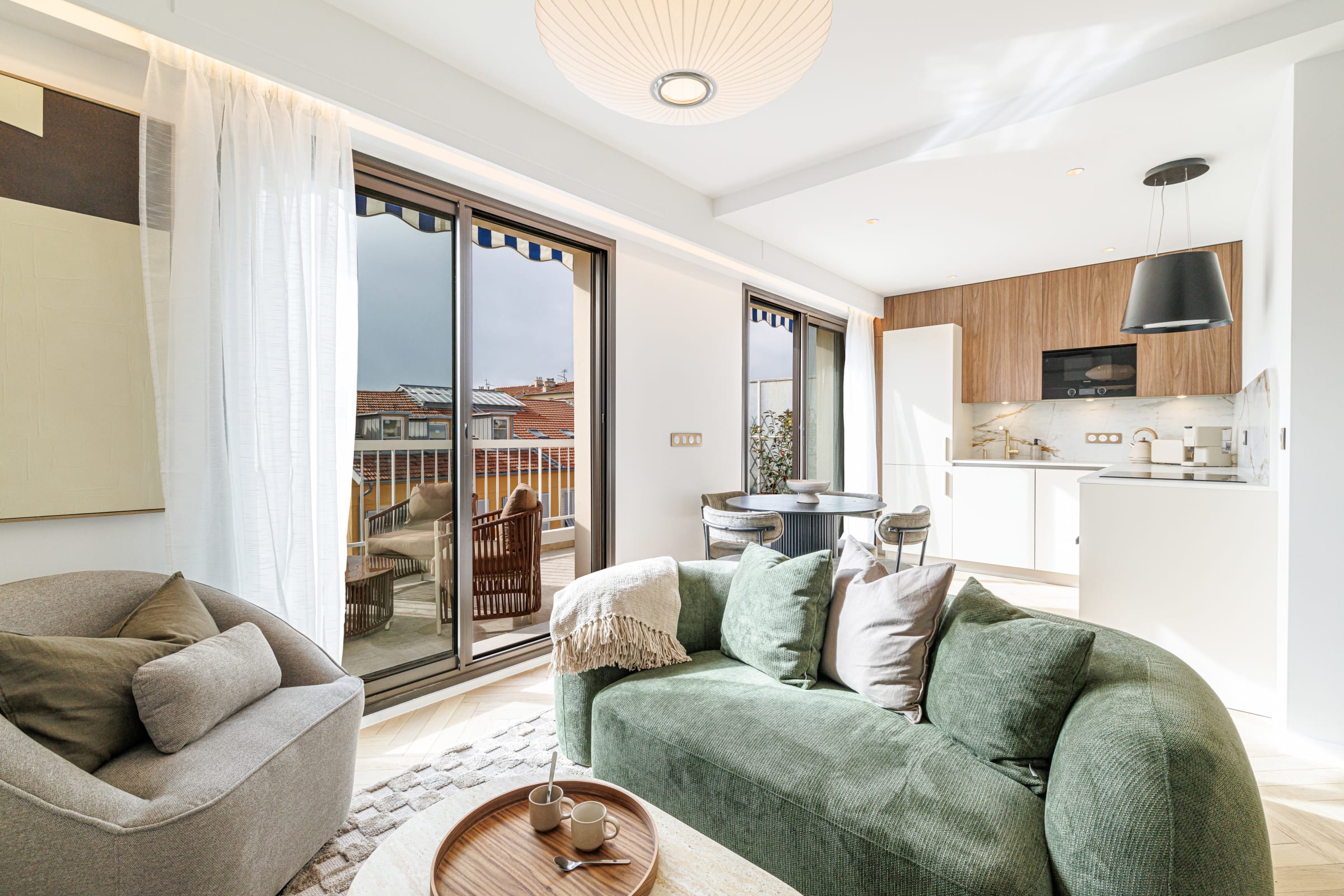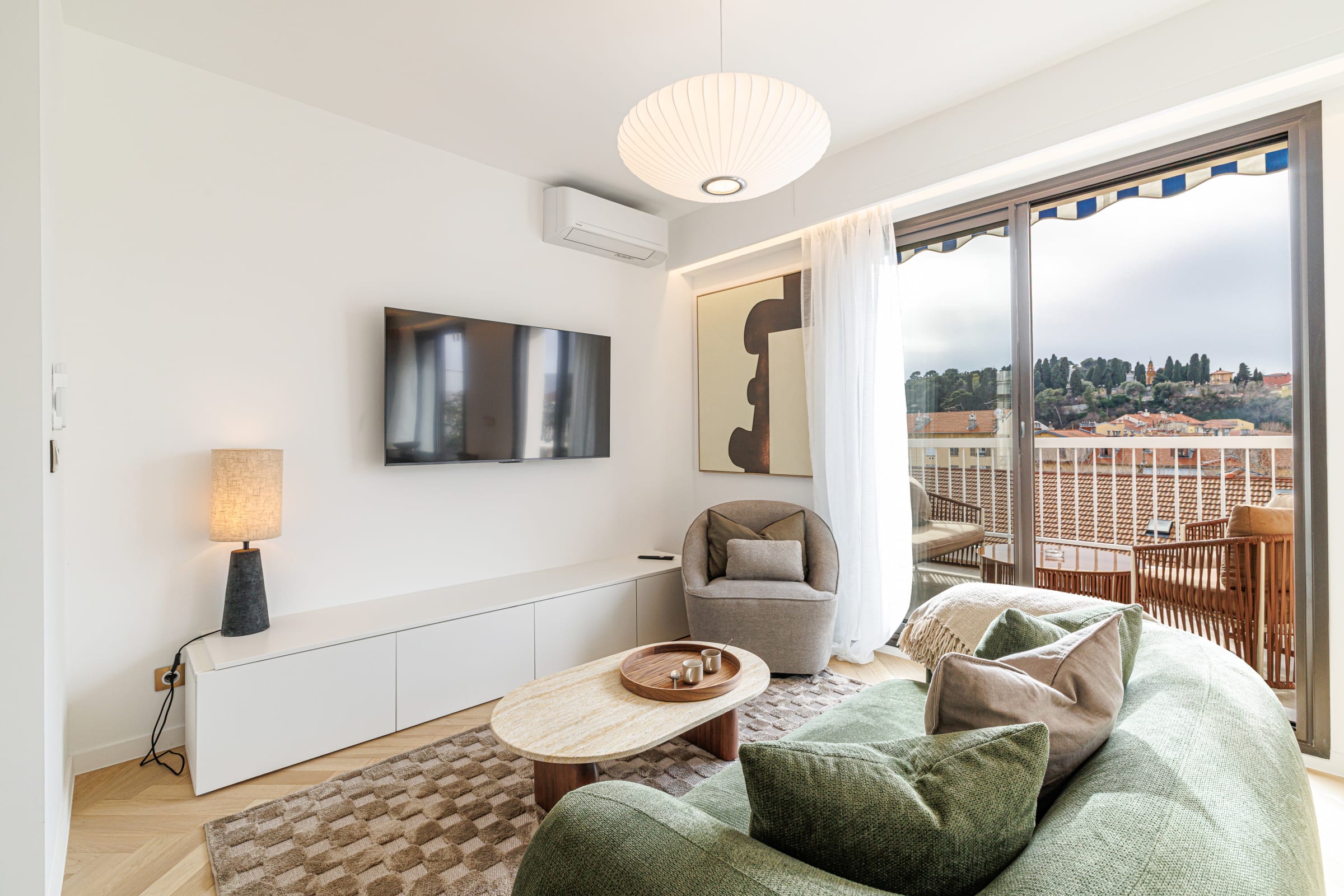 Un triptyque de fenêtres apporte une belle lumière naturelle et une vue dégagée vers les palais de Nice Nord, tout en conservant l’intimité grâce aux voilages.