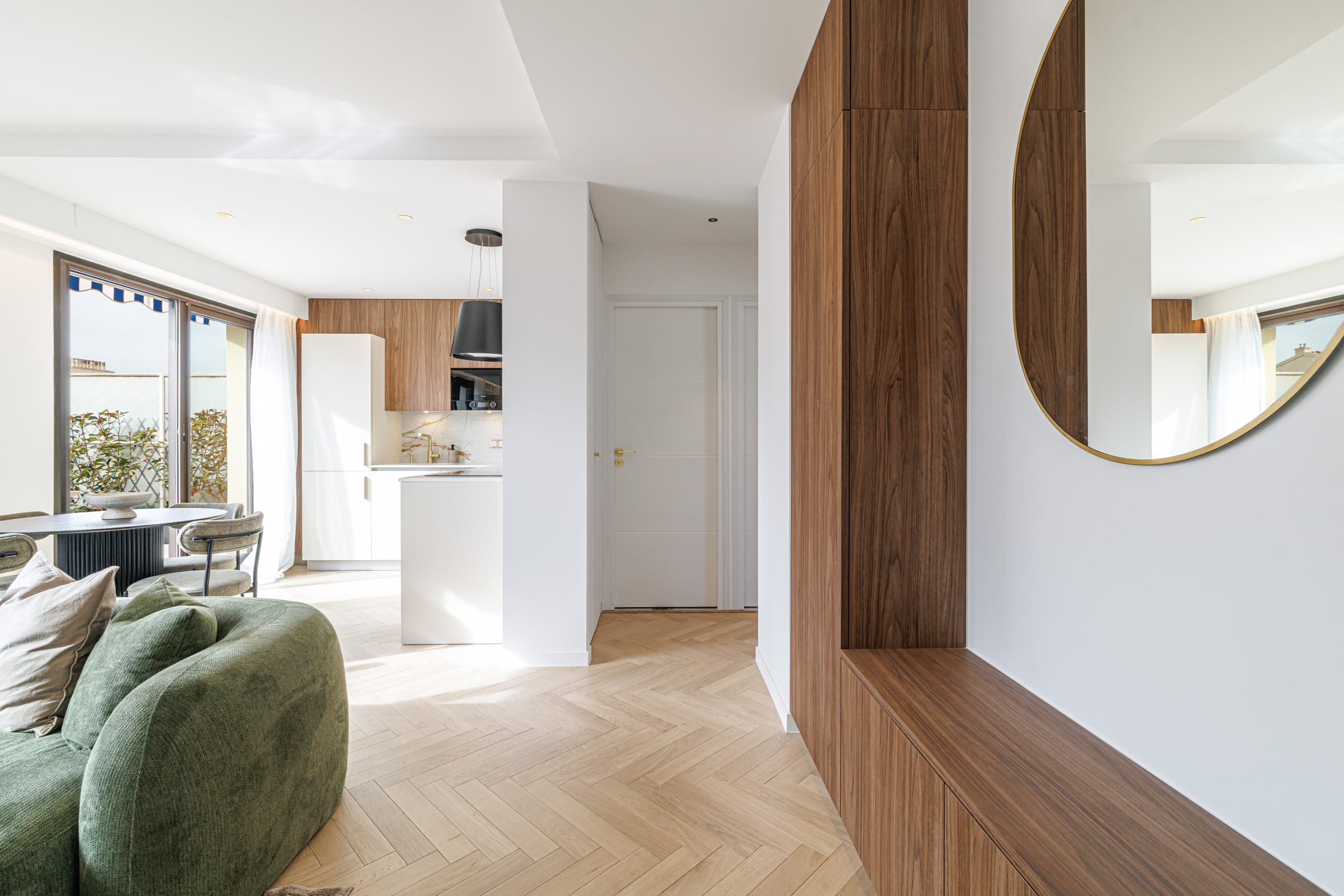 🚪 Dès l’entrée, l’appartement séduit par son agencement fonctionnel et bien pensé. Vous y trouverez un placard en bois avec miroir, idéal pour se préparer avant de sortir. La porte d’entrée sécurisée trois points garantit tranquillité et sérénité durant votre séjour.