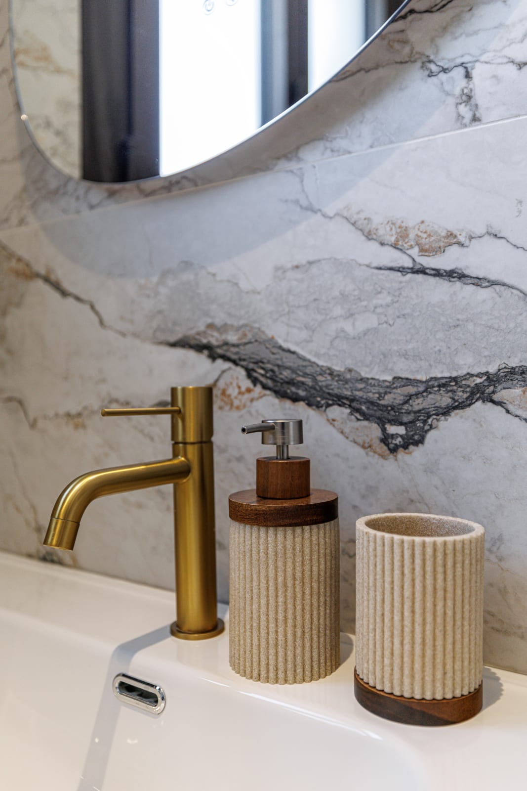 Le meuble vasque aux finitions dorées, le miroir rétro-éclairé et les rangements optimisent le confort.