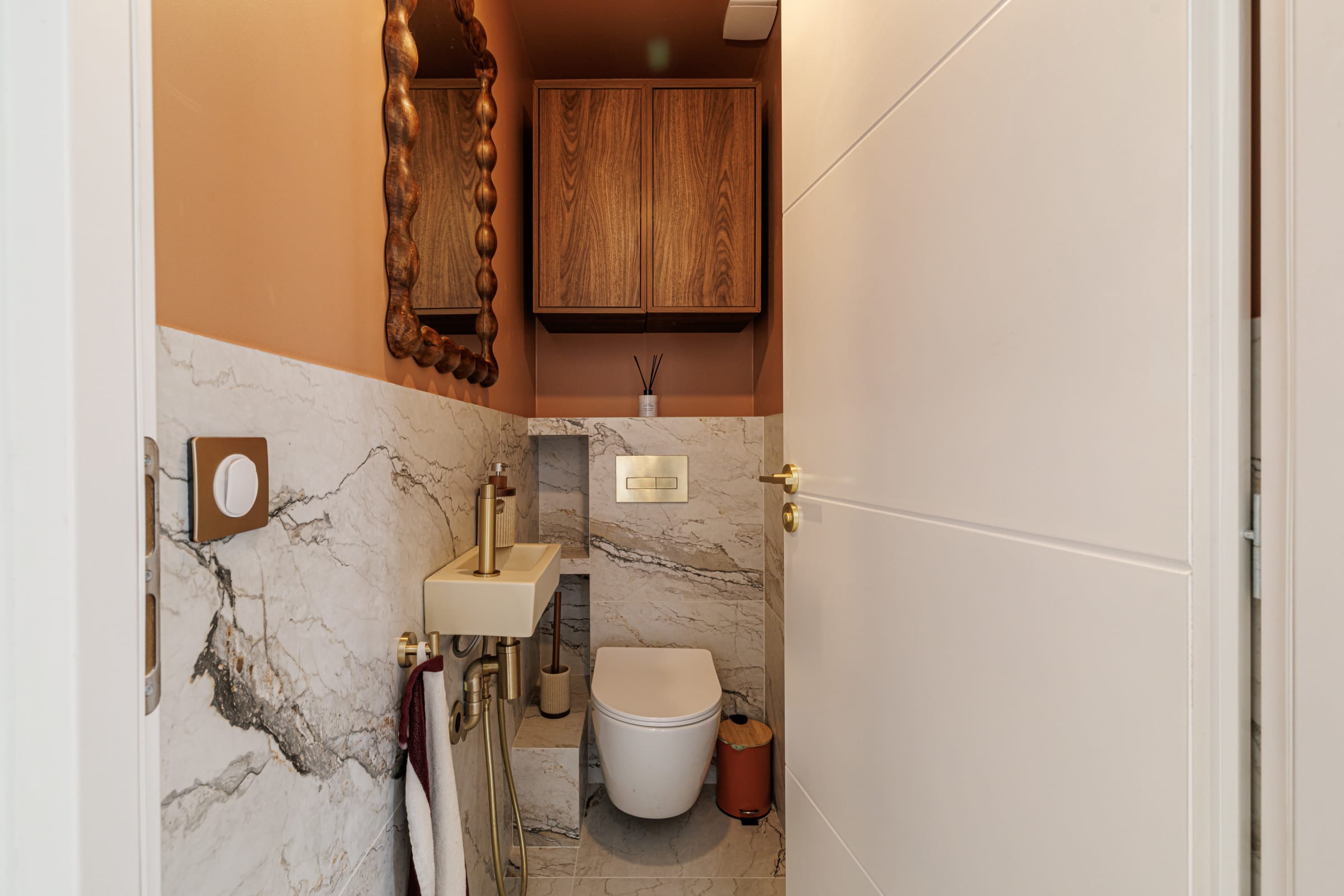 🚽 Les toilettes, indépendantes, sont aménagées avec soin : lave-mains, robinetterie dorée, douchette, rangements en bois ébène, peinture terracotta et miroir encadré créent un espace agréable et pratique.