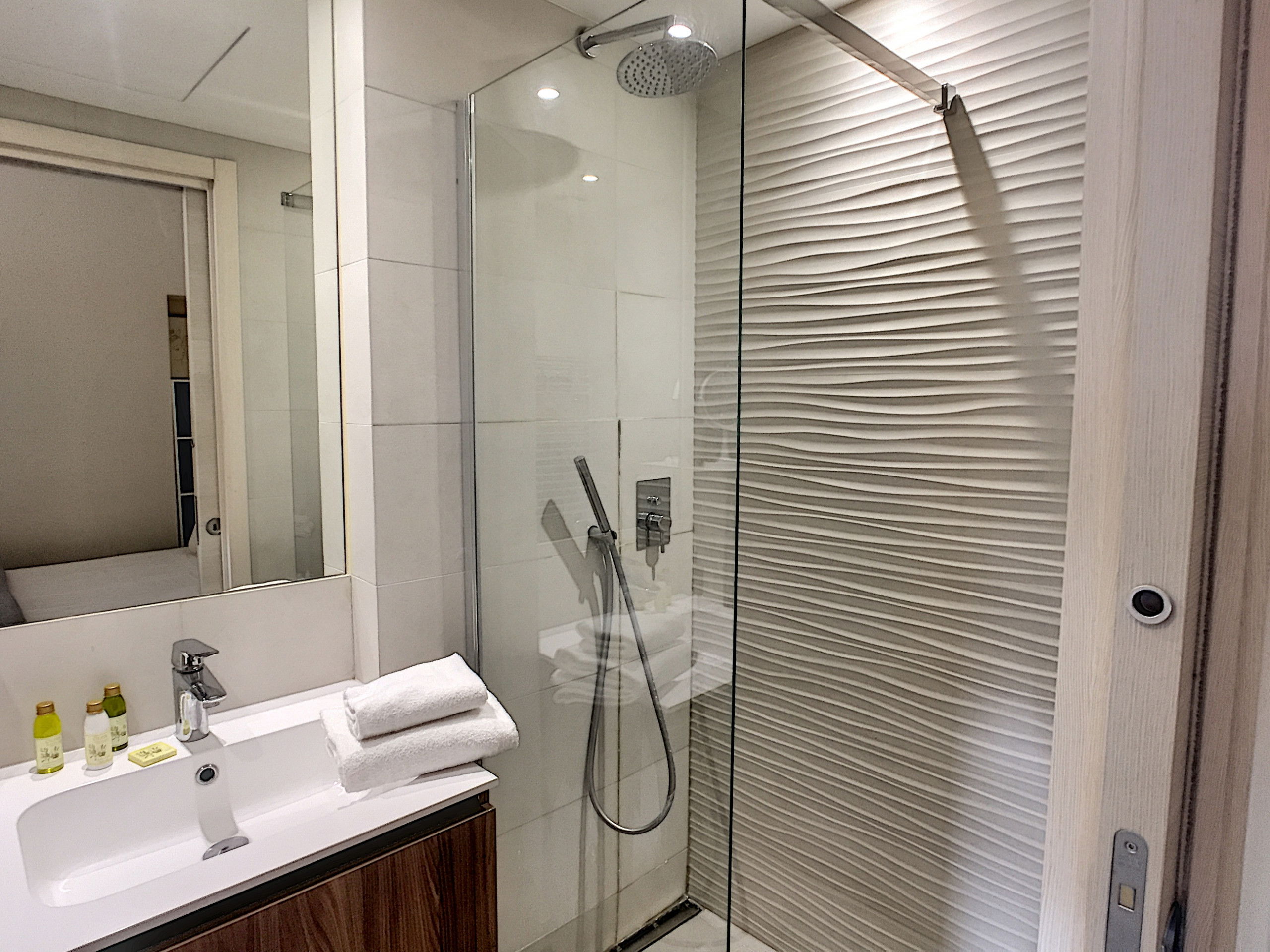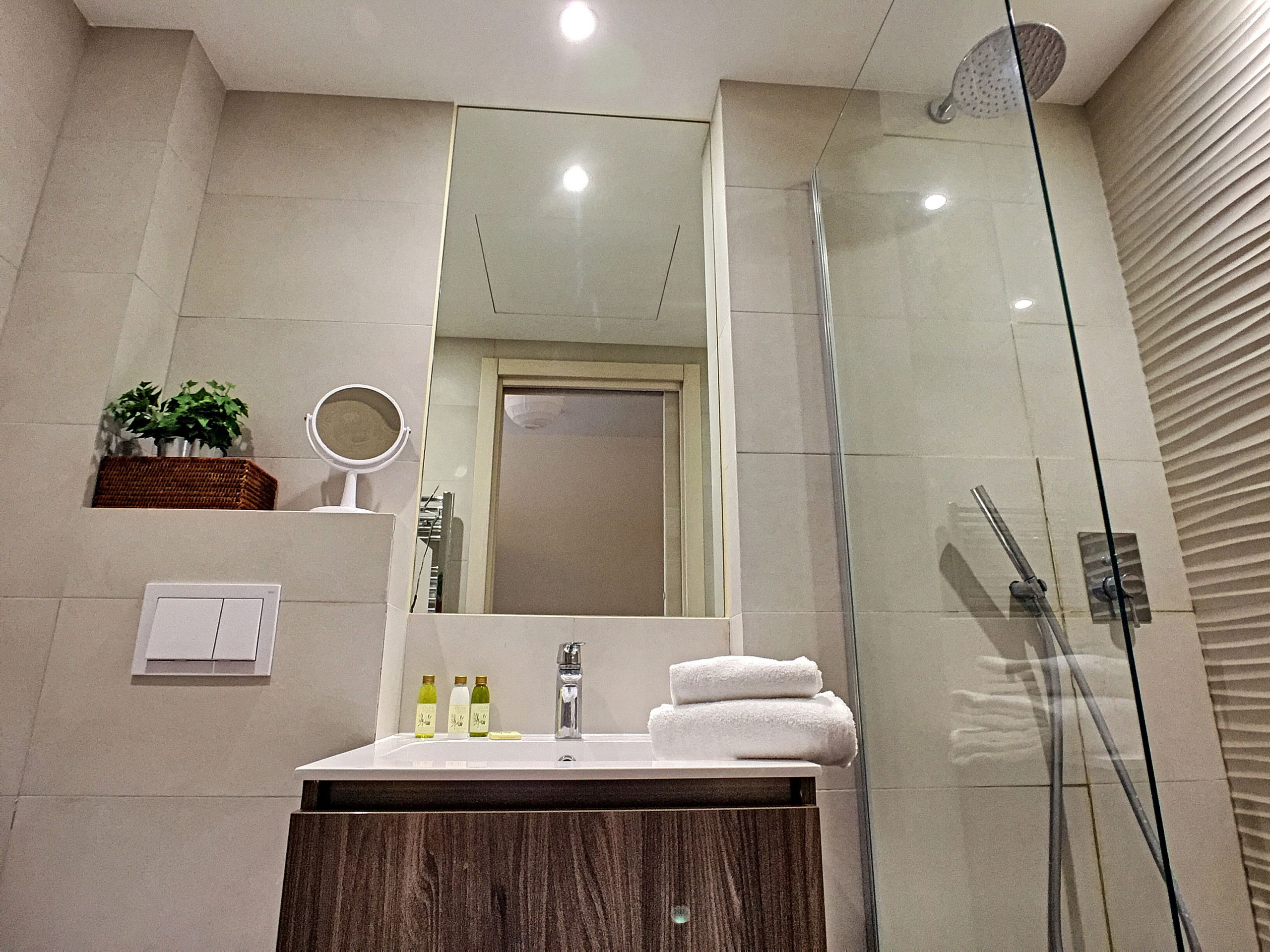 La salle de bain propose une jolie douche, un sèche serviette, un sèche cheveux, un miroir grossissant ainsi que des WC.