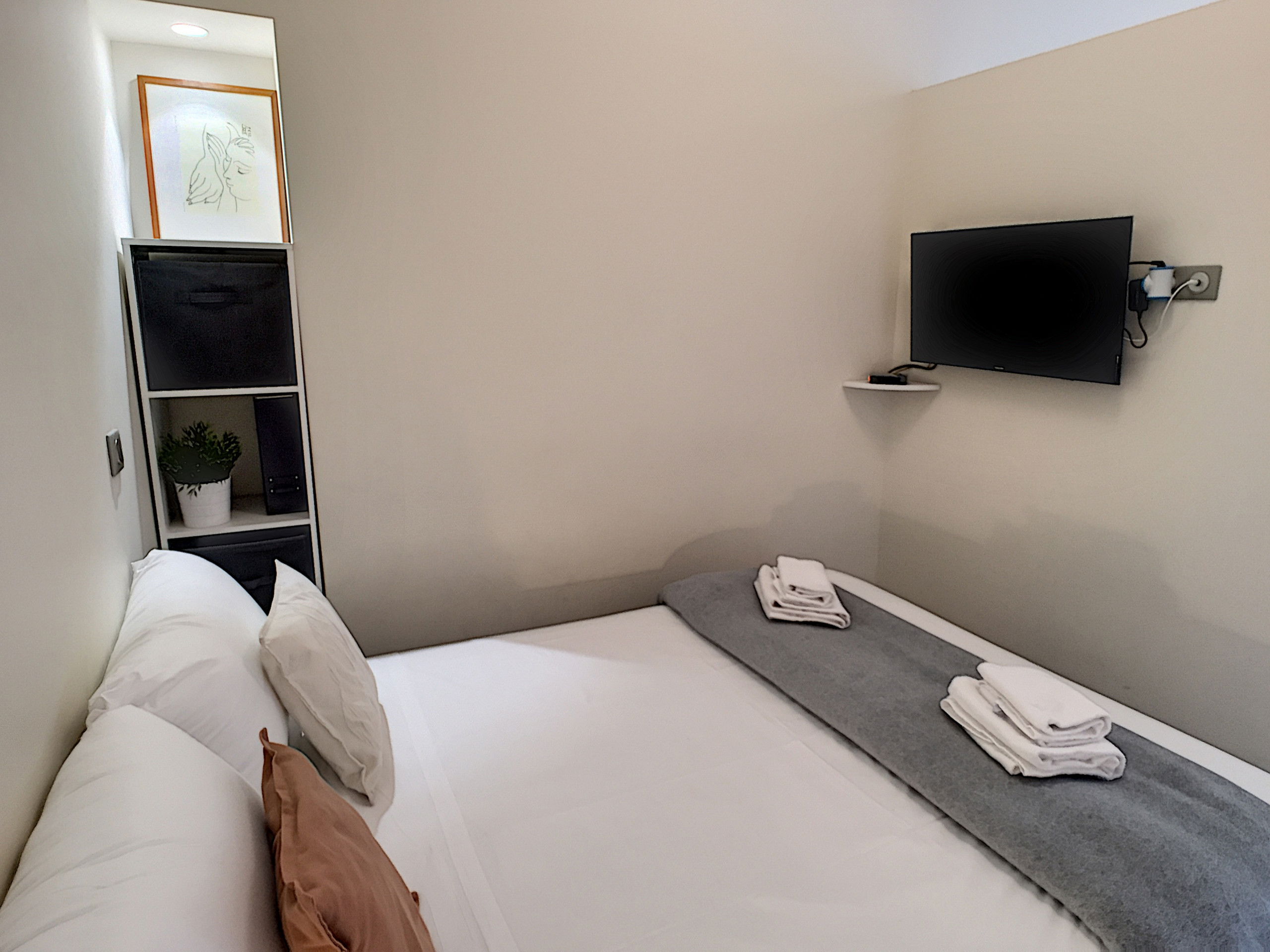 Le coin nuit indépendant dispose d’un lit double, une table de chevet ainsi que d’une TV écran plat pour profiter de vos soirées films ou séries.