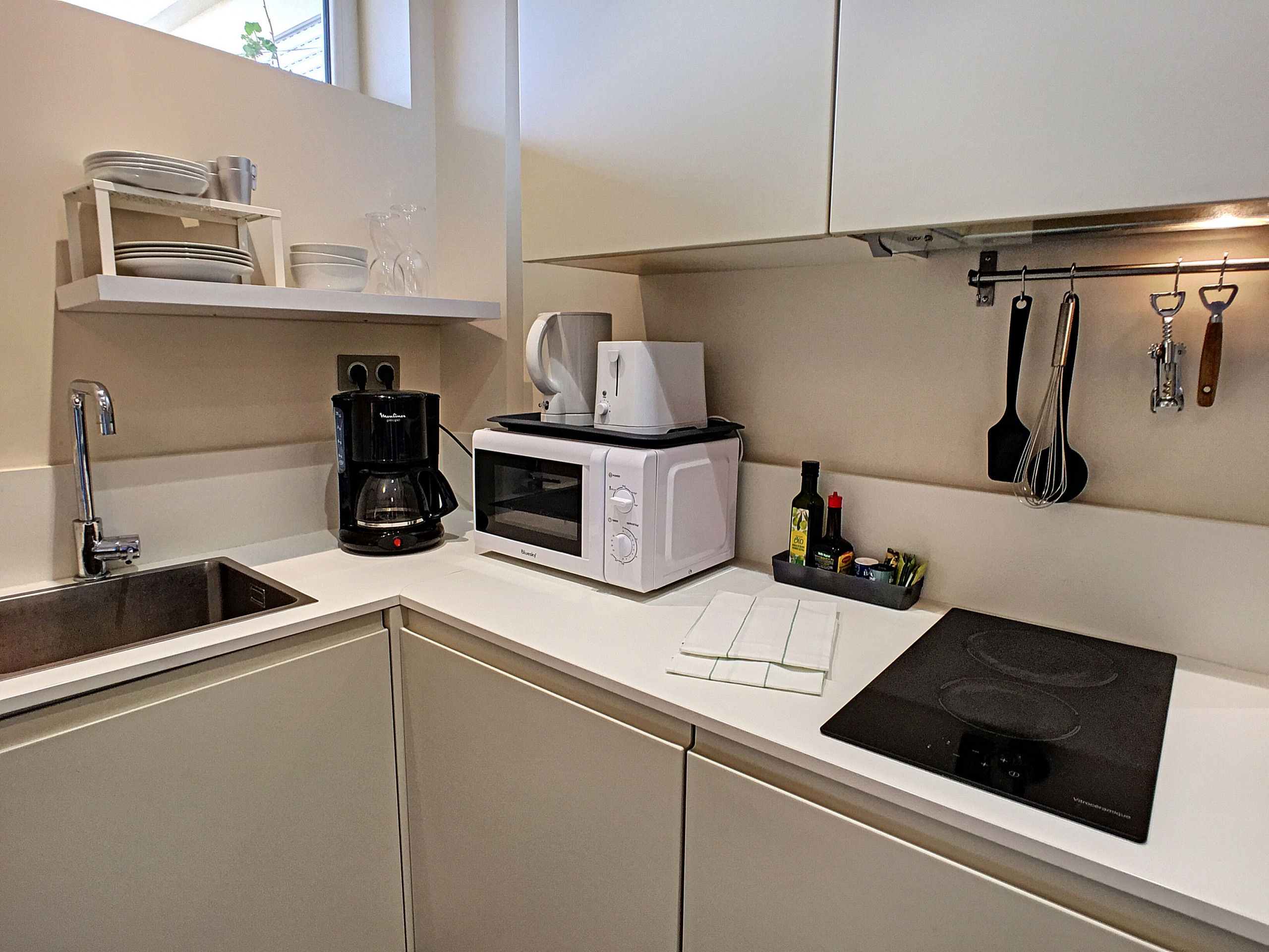 La cuisine américaine est équipée d’un frigidaire, un congélateur 3 étoiles, un micro-ondes, une bouilloire, un grille pain ainsi qu'une cafetière.