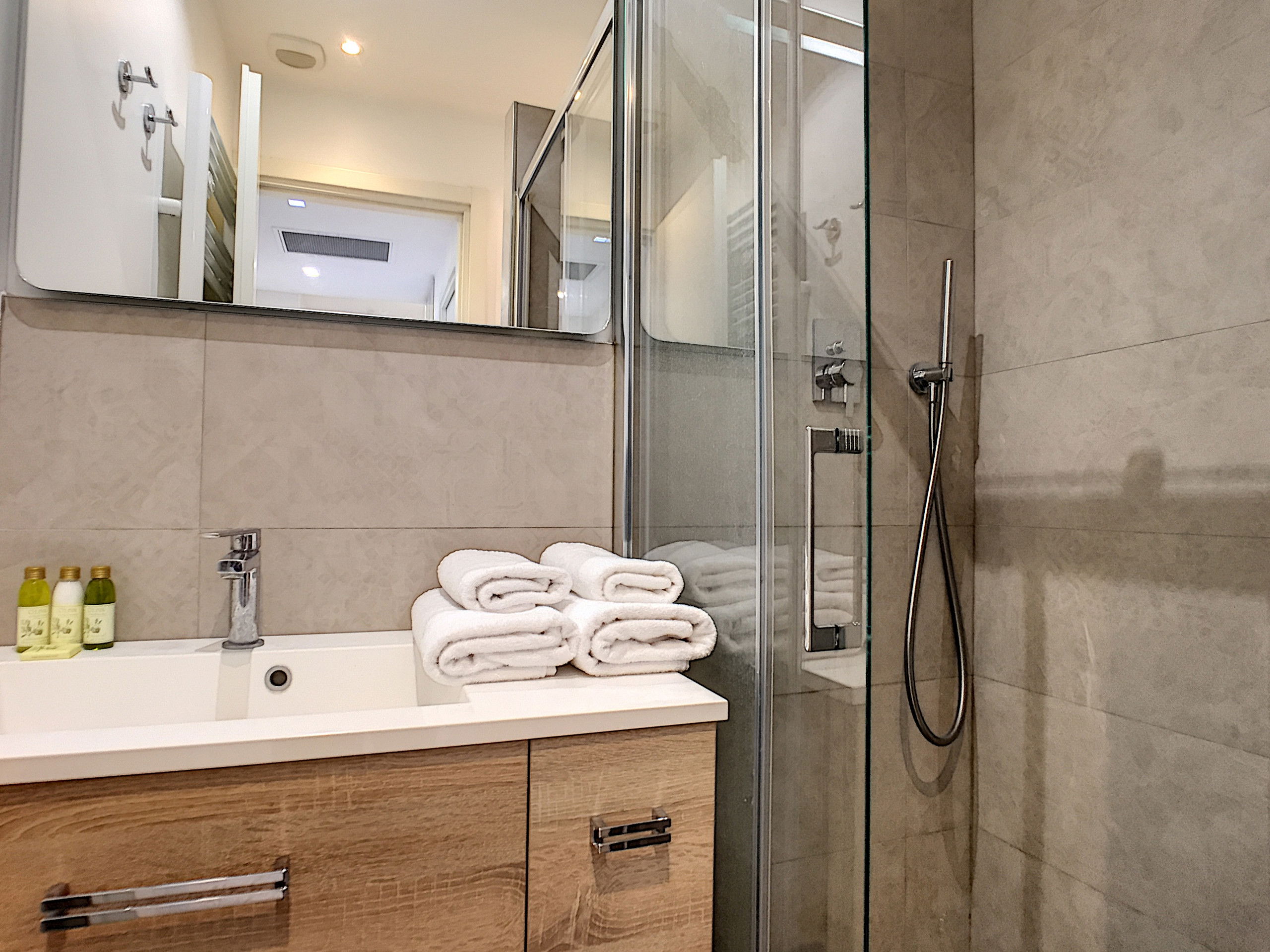 La salle de bain est équipée d’une douche, des wc suspendus, un lavabo avec miroir, un sèche-serviette et un sèche-cheveux.