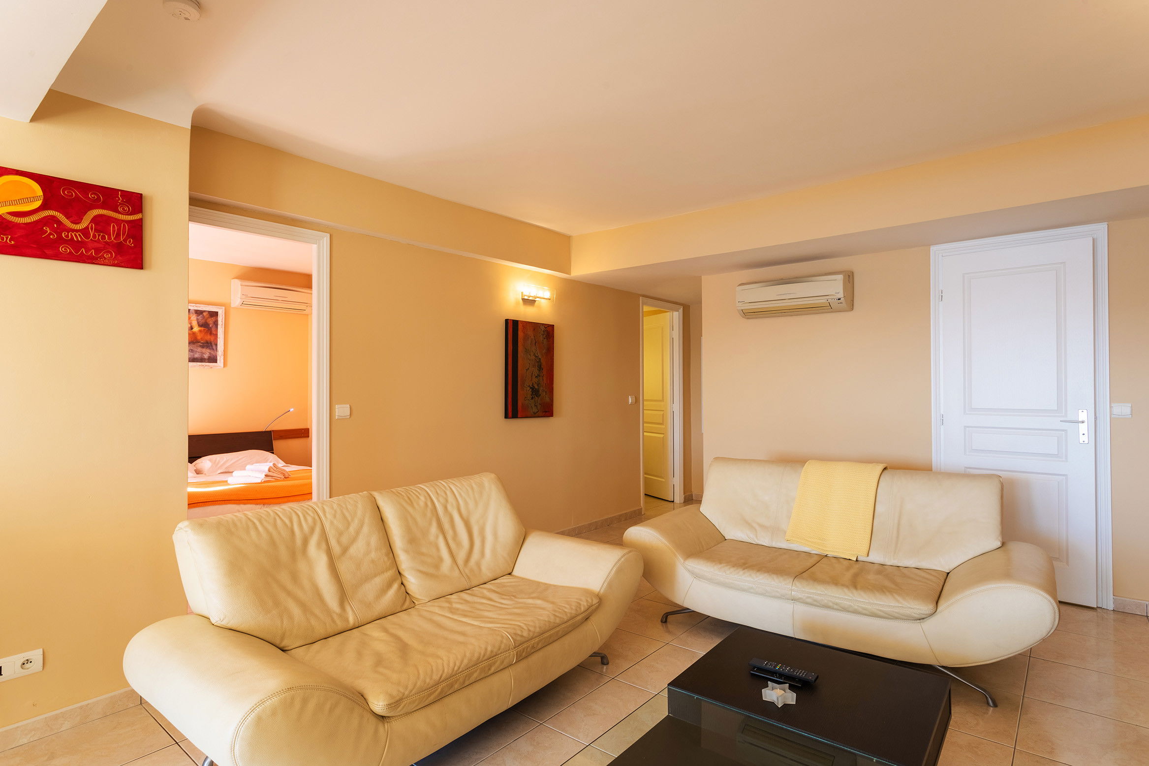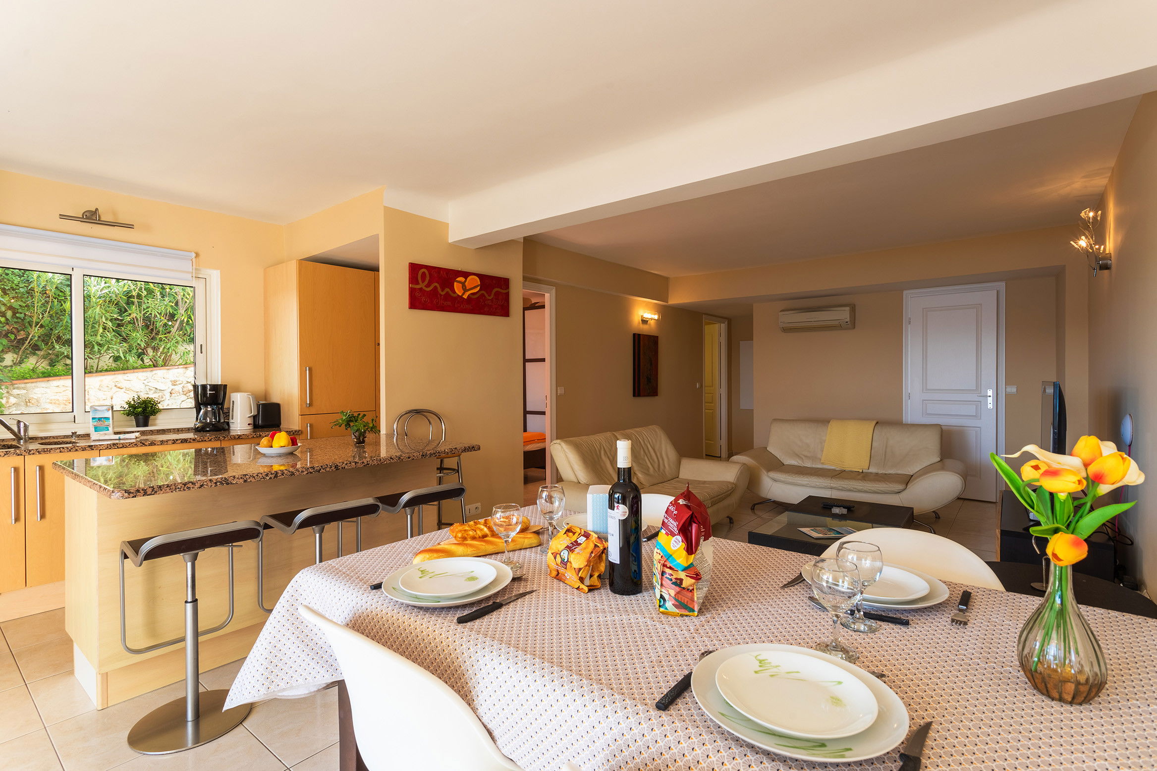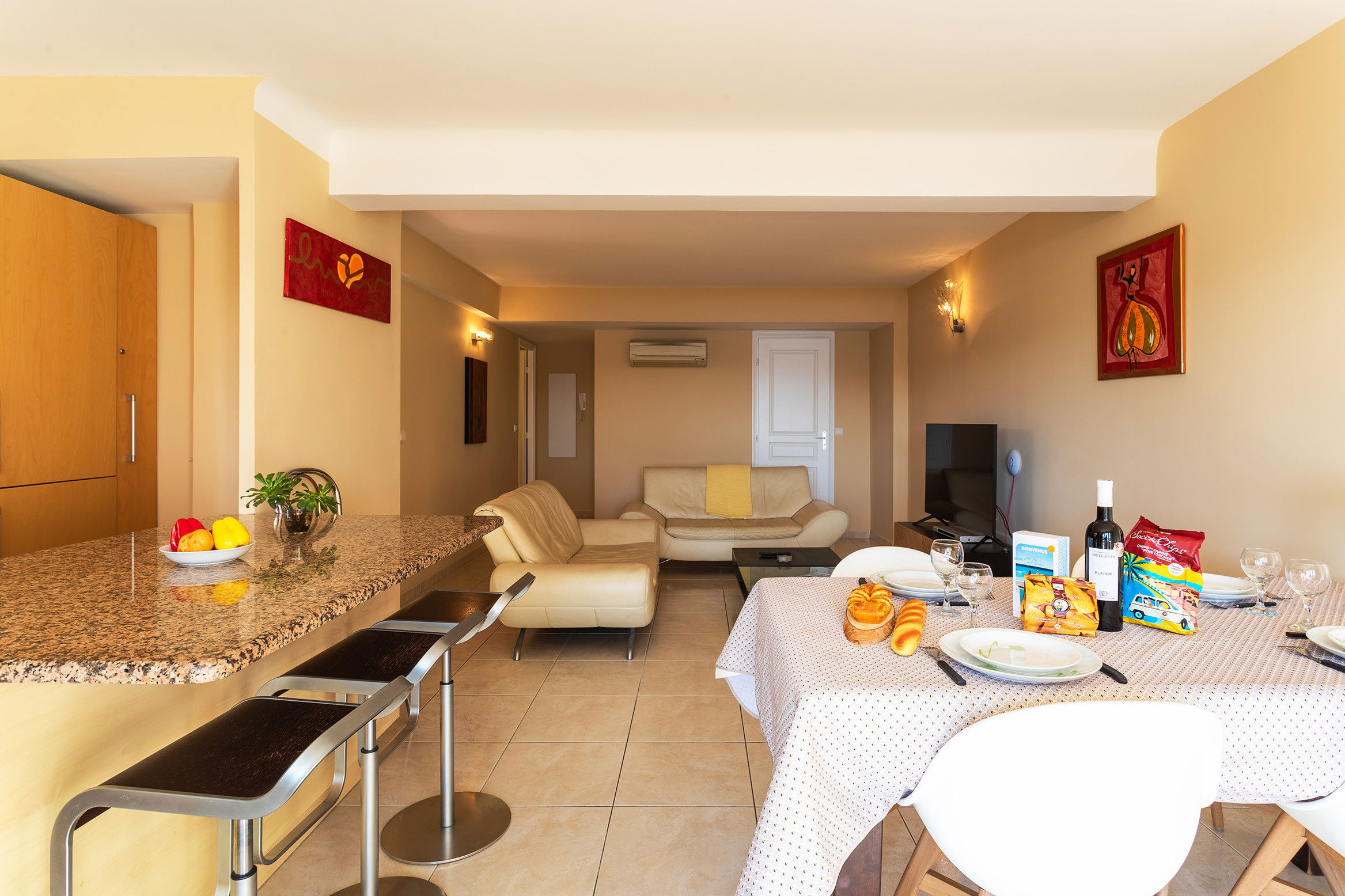 Cet appartement se compose d'une cuisine américaine entièrement équipée ouvrant sur le salon avec coin repas, de 2 chambres, 1 chambre avec 1 lit Queen size (160 cm) et l'autre avec 2 lits simples ainsi que de deux salles de bain, l'une avec douche et WC et l'autre avec baignoire et WC ( lave-linge et sèche-linge dans la salle de bain).