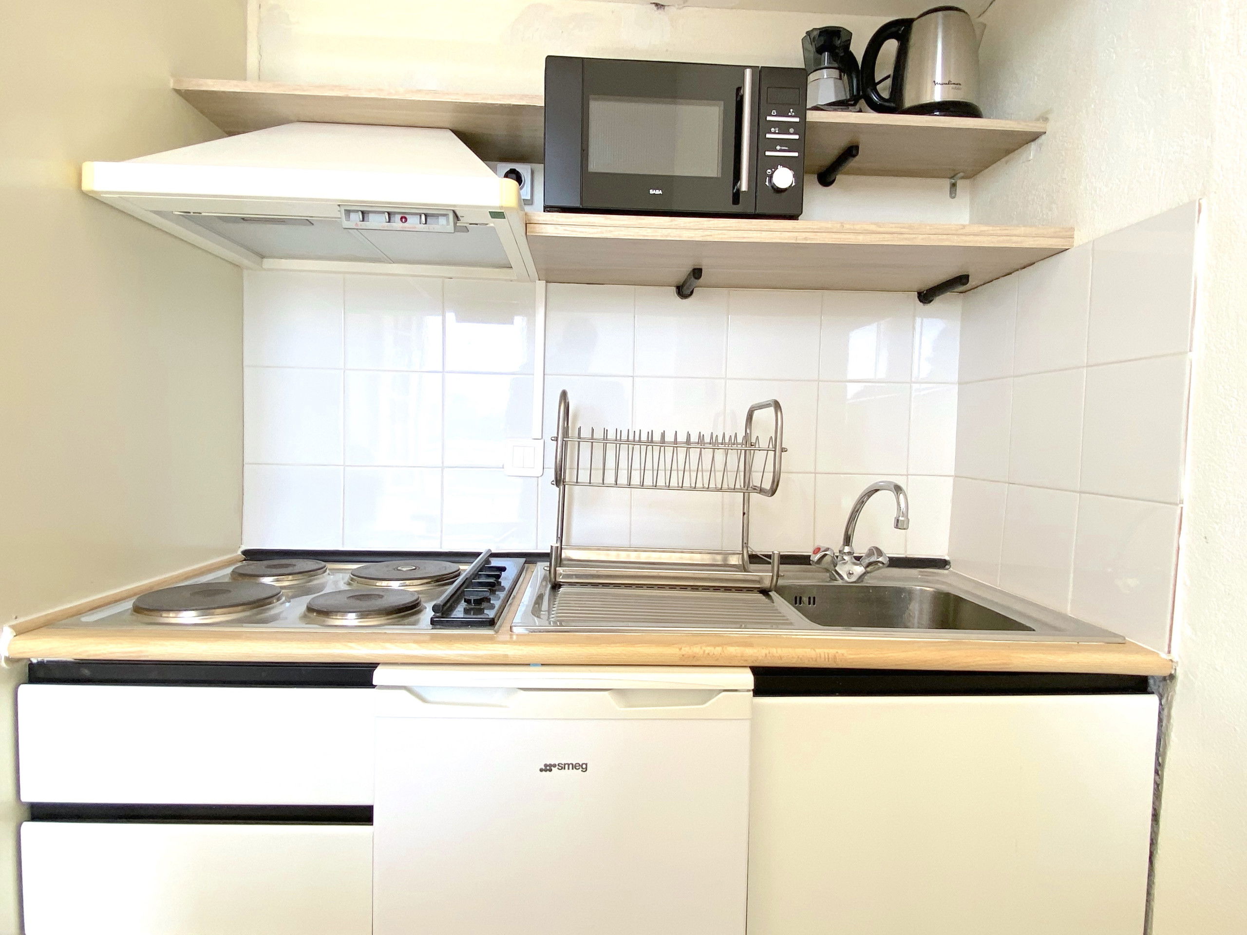 La cuisine fonctionnelle, ouverte sur le salon, avec réfrigérateur, plaques de cuisson, micro-ondes, hotte aspirante, bouilloire, grille-pain, cafetière, et tous les ustensiles nécessaires pour cuisiner et dîner — offrant tous une vue superbe sur la mer et le Cap Ferrat.