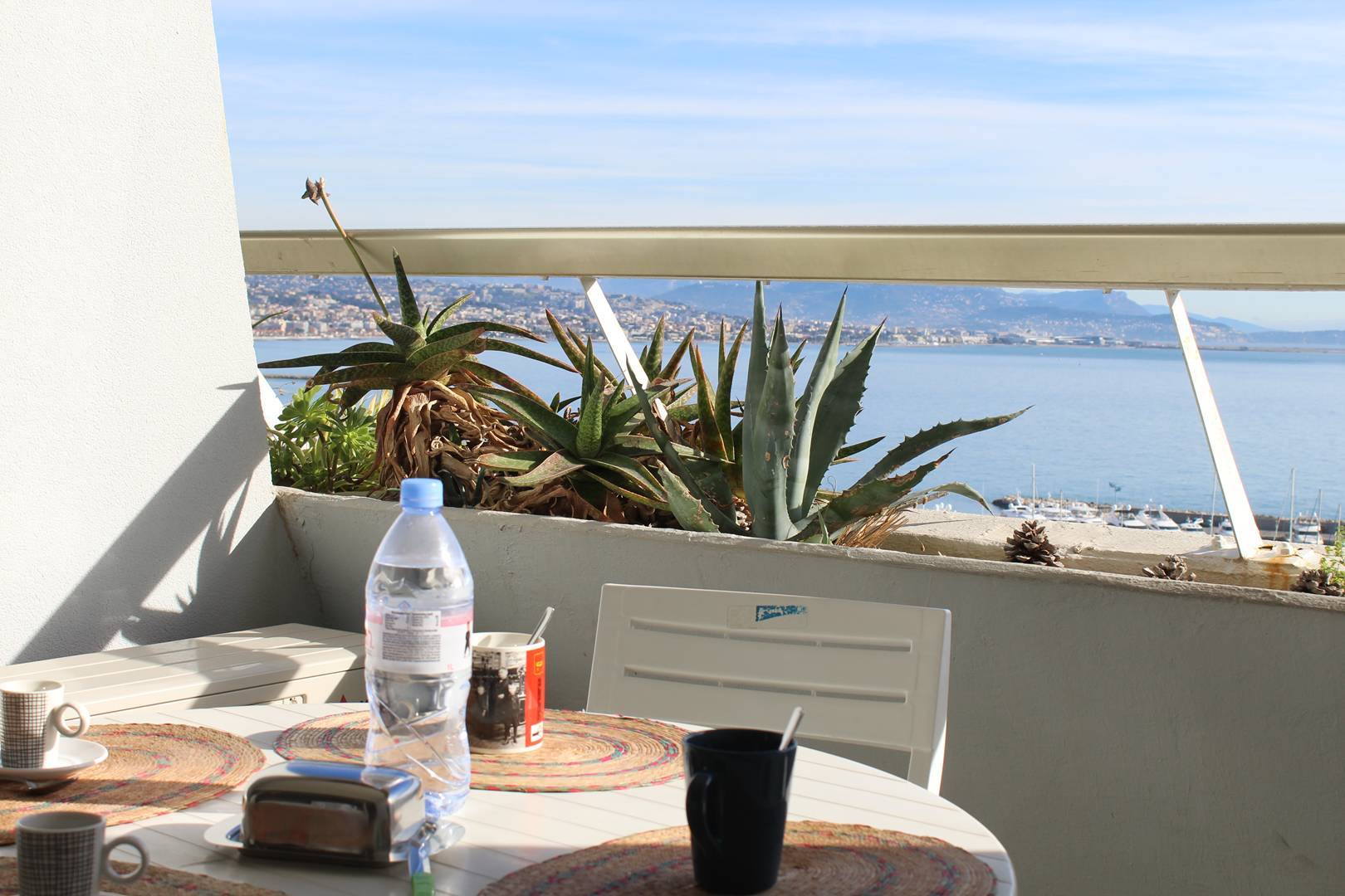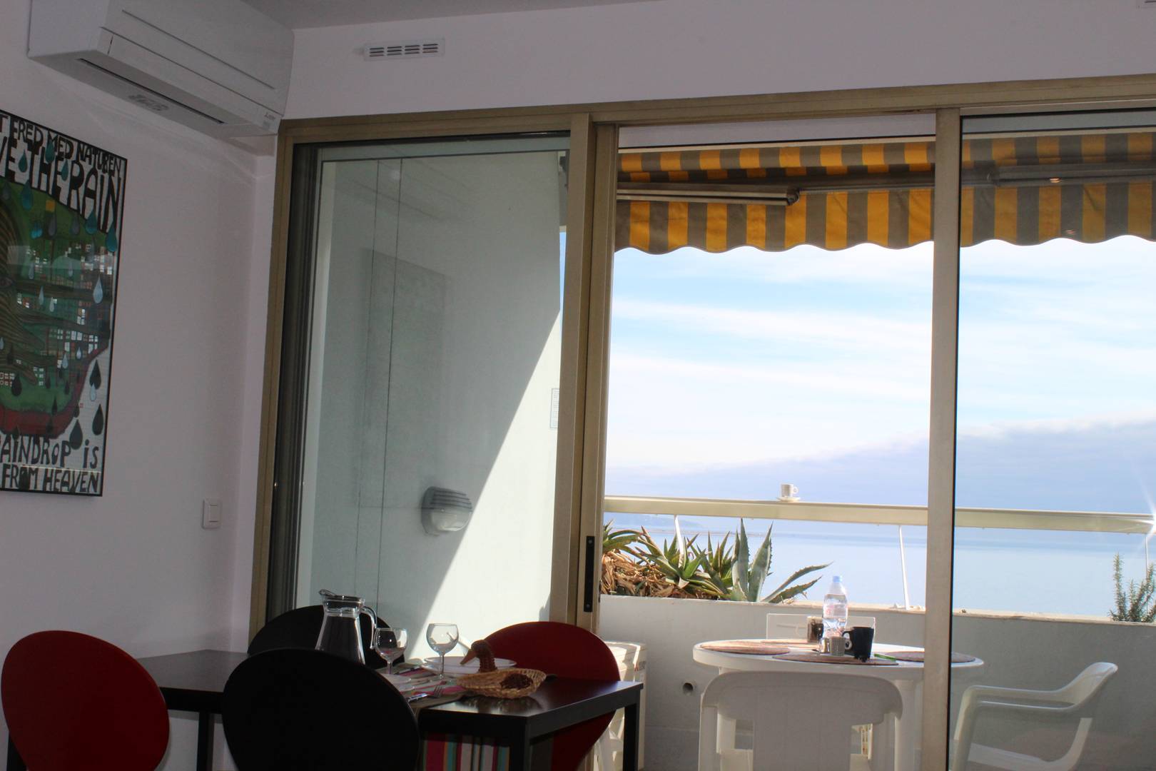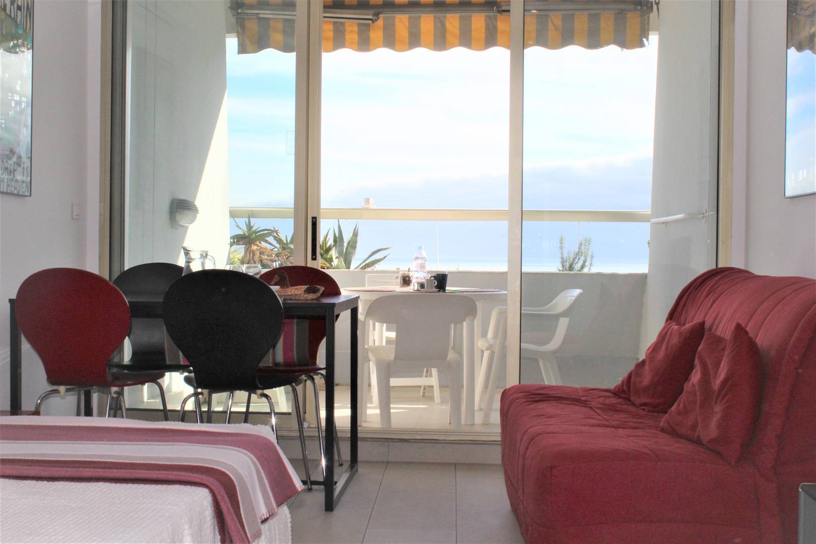 Cet appartement en étage élevé est composé à l’entrée, d’une cuisine indépendante moderne tout équipée, dans la pièce principale qui est climatisé, vous trouverez un joli coin repas , un canapé convertible donnant sur une terrasse avec une vue magnifique sur la méditerranée.