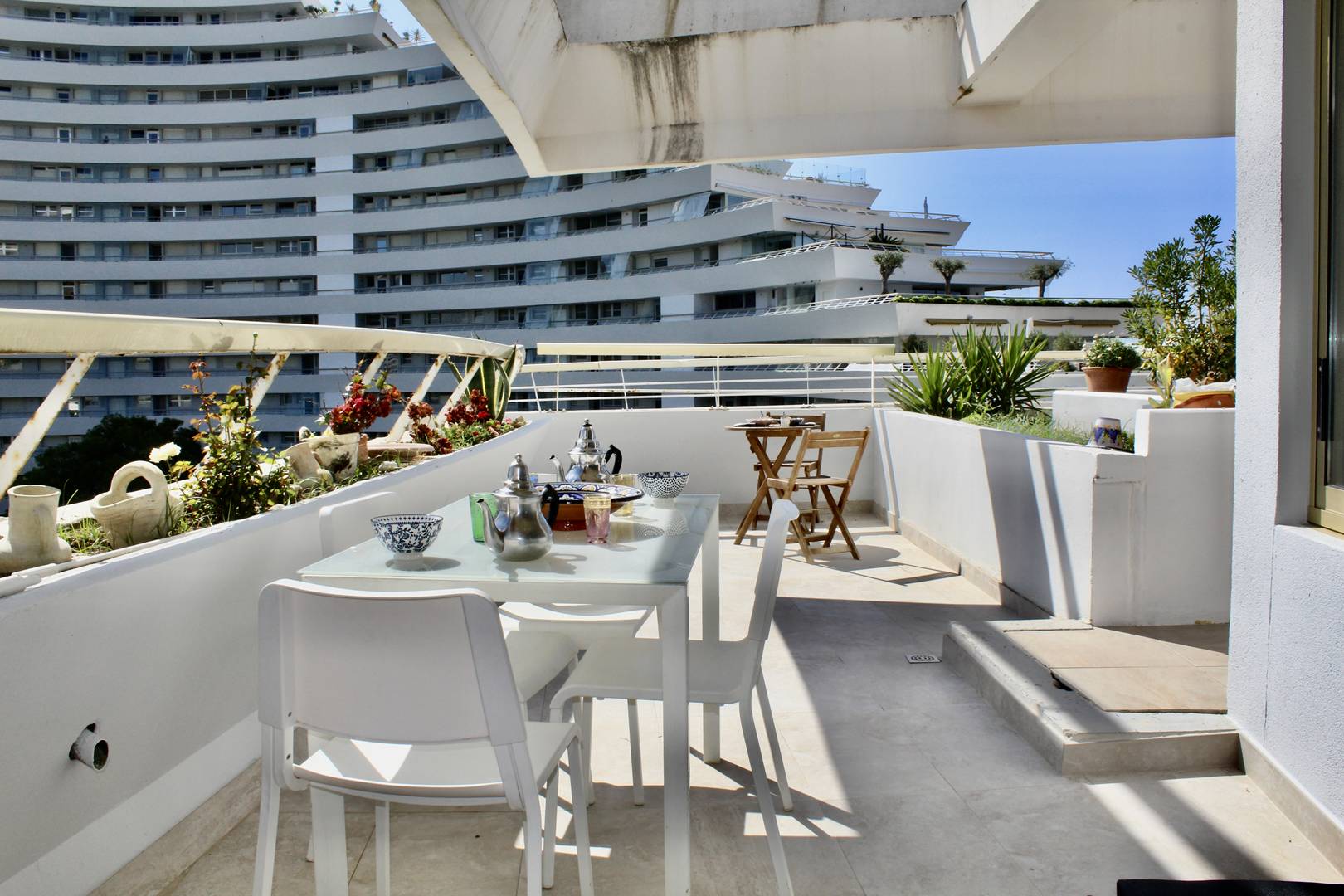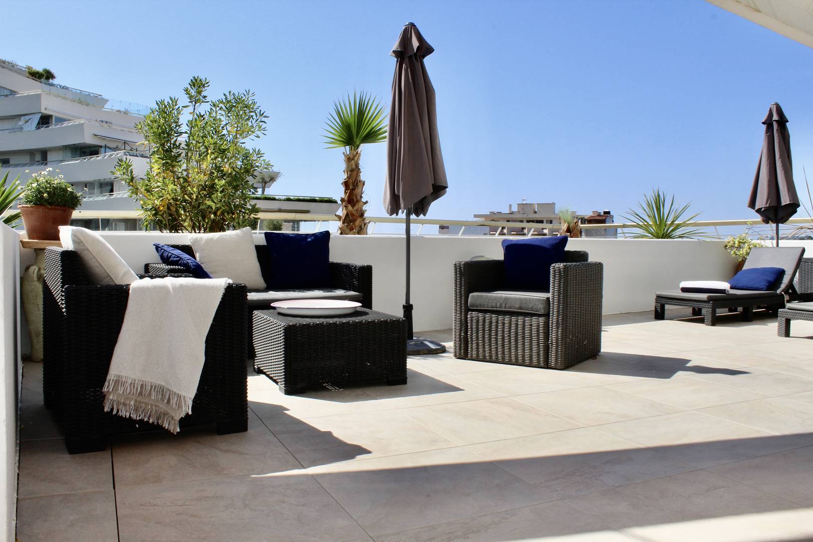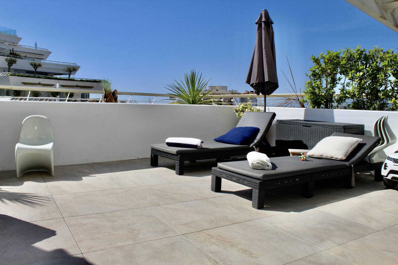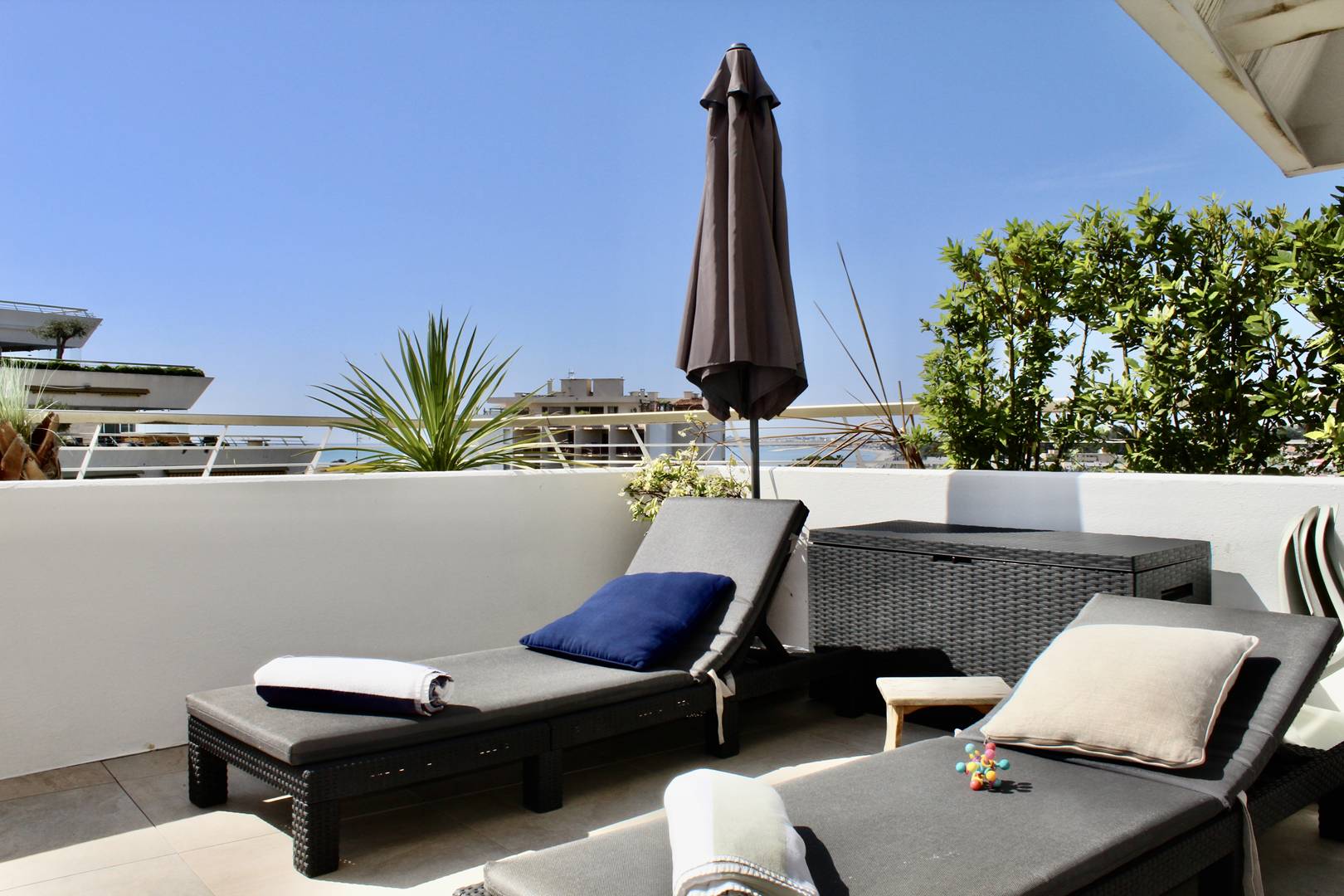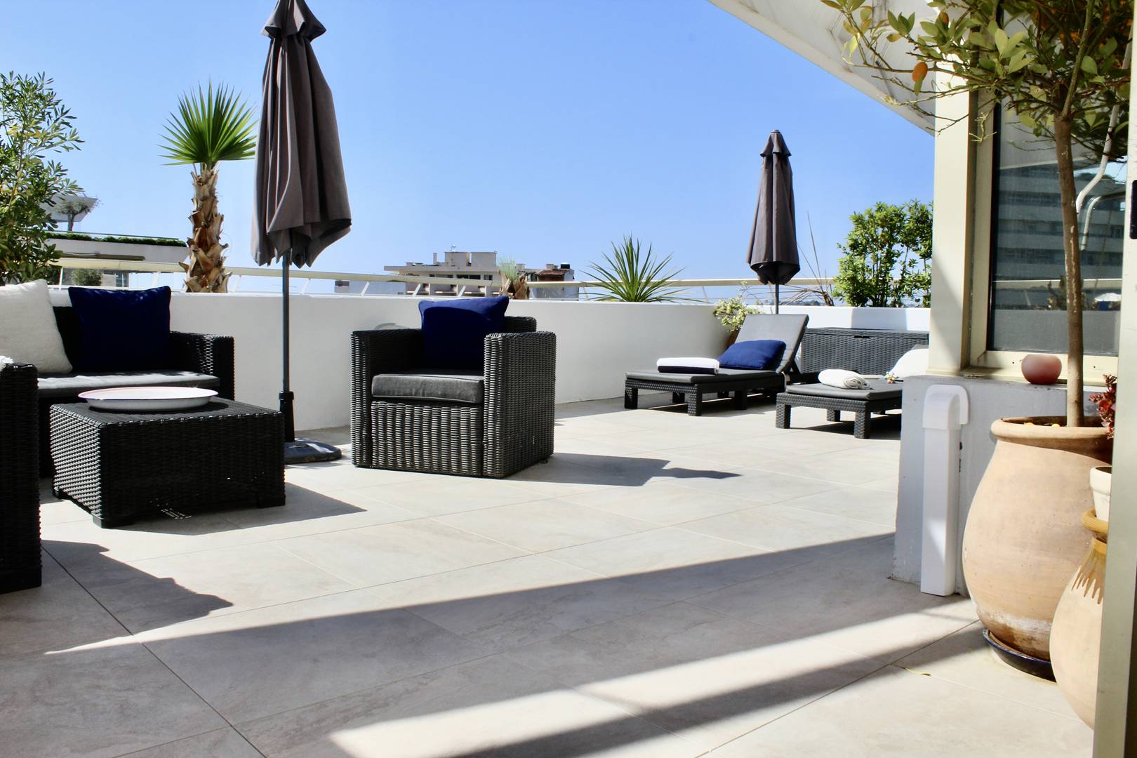 Le plus de ce logement : Cet appartement unique offre une resplendissante terrasse d’angle avec une vue exceptionnelle du Cap d’Antibes à Nice.