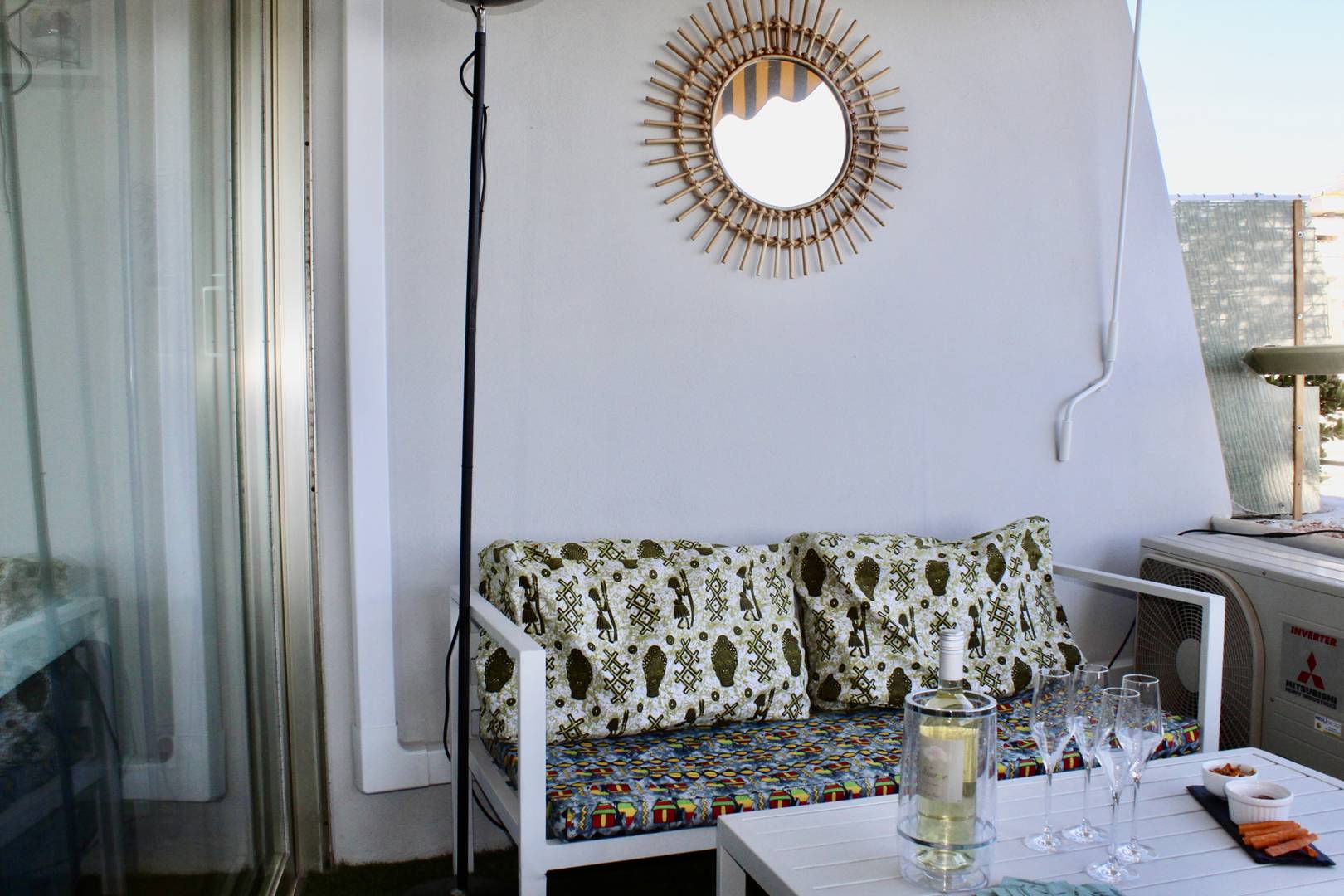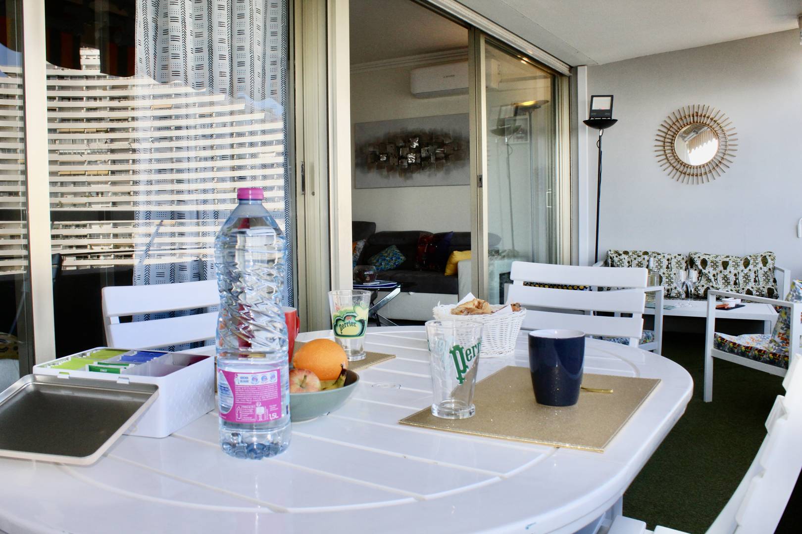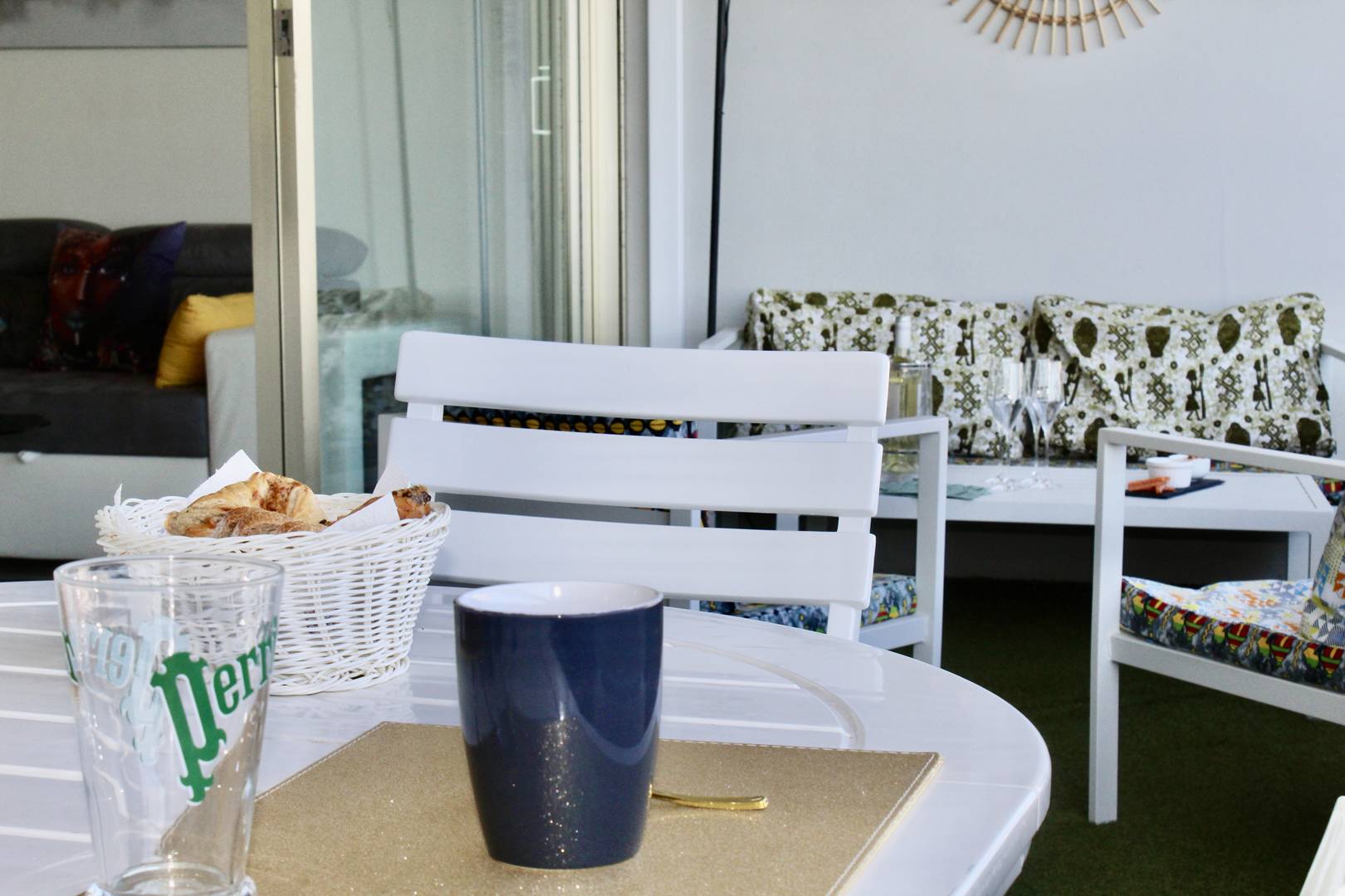 L’appartement offre une terrasse aménagée avec salon, transats et table à manger.