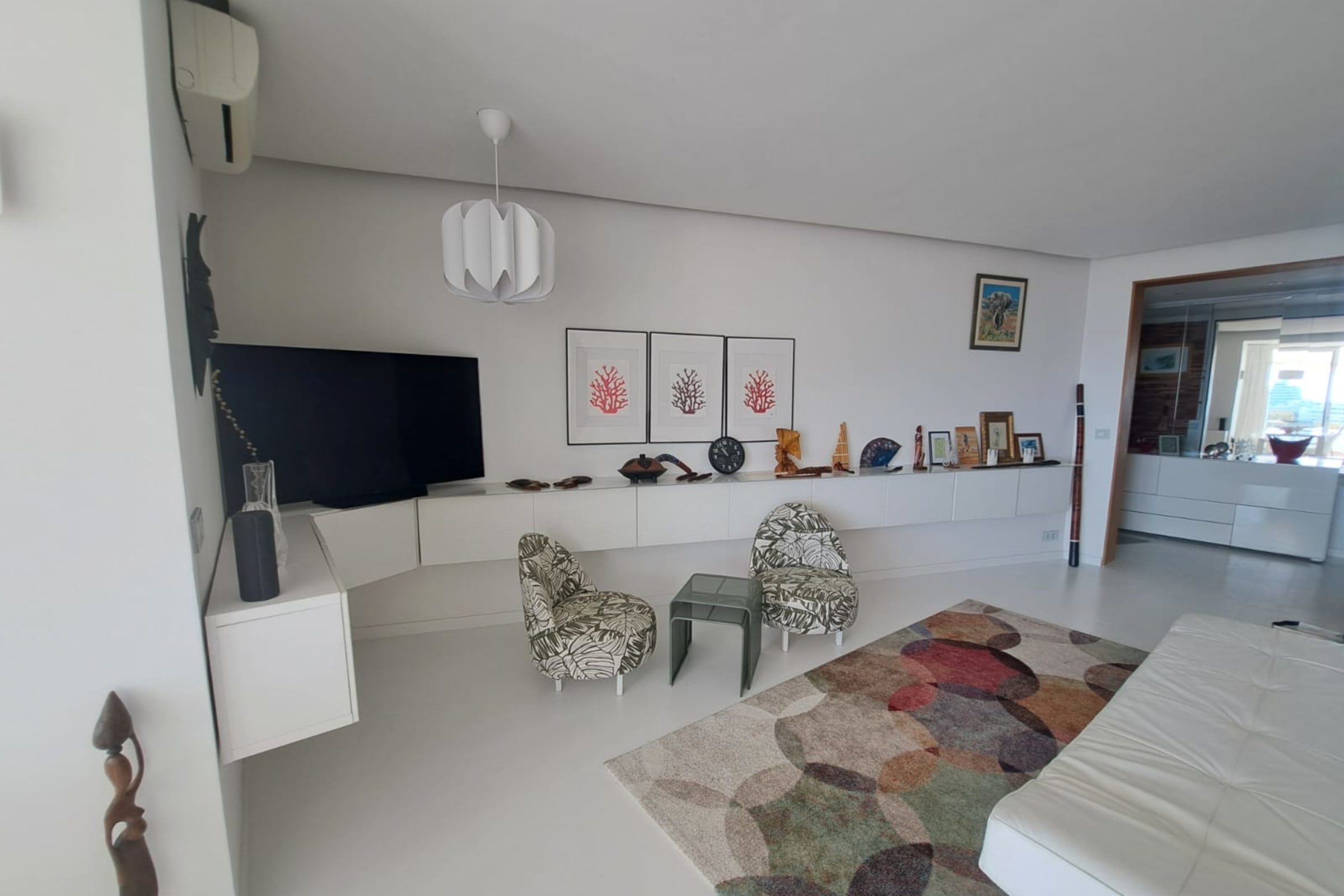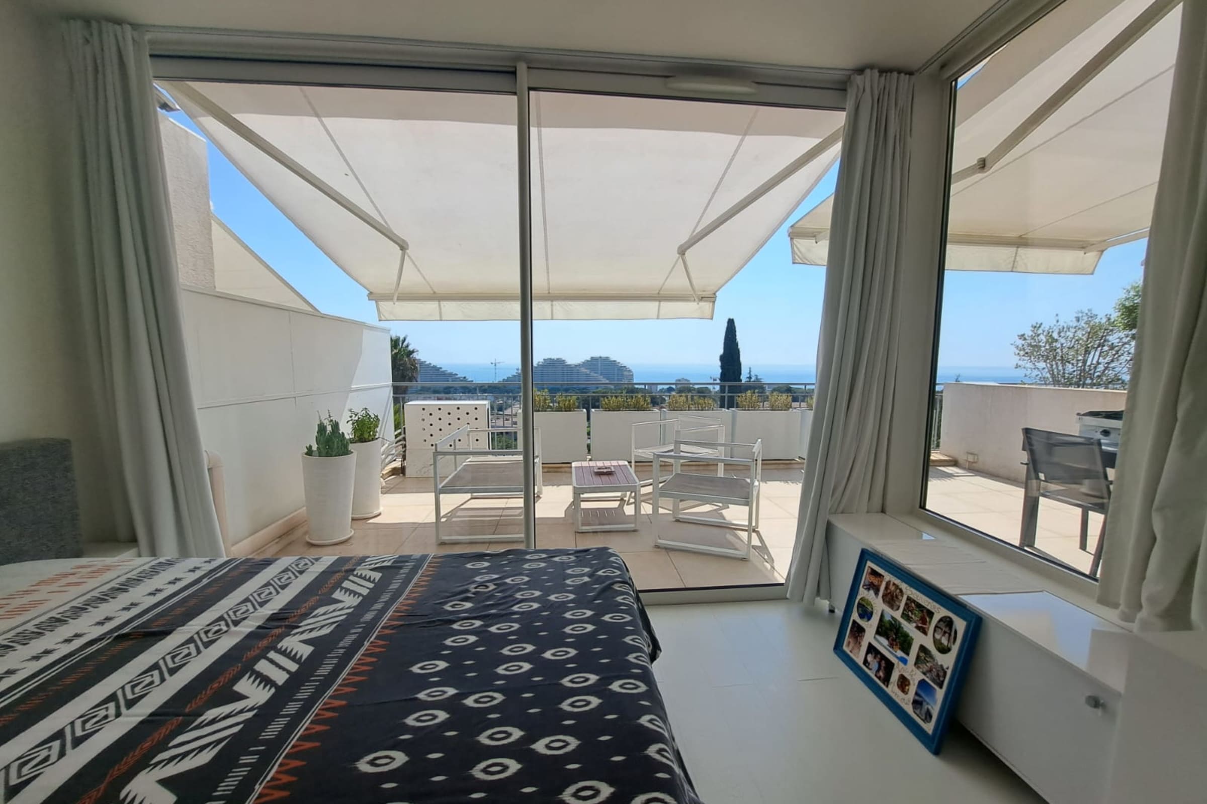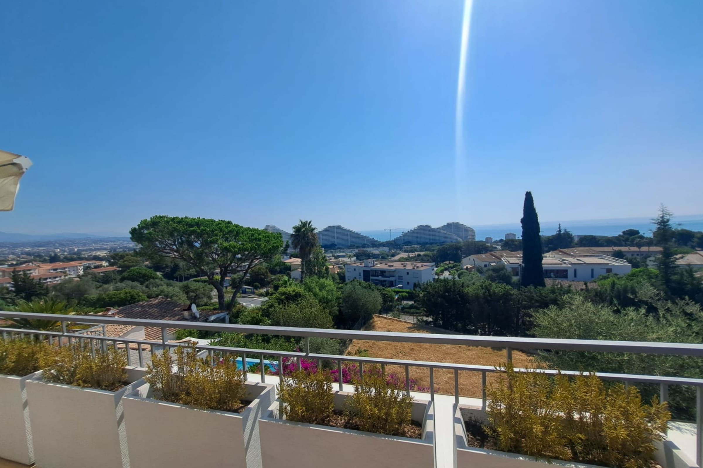 EXTÉRIEUR : Terrasse de 24 m², aménagée avec un coin repas, un salon d'extérieur et des luminaires. Profitez de sa magnifique vue sur la baie de Villeneuve-Loubet !