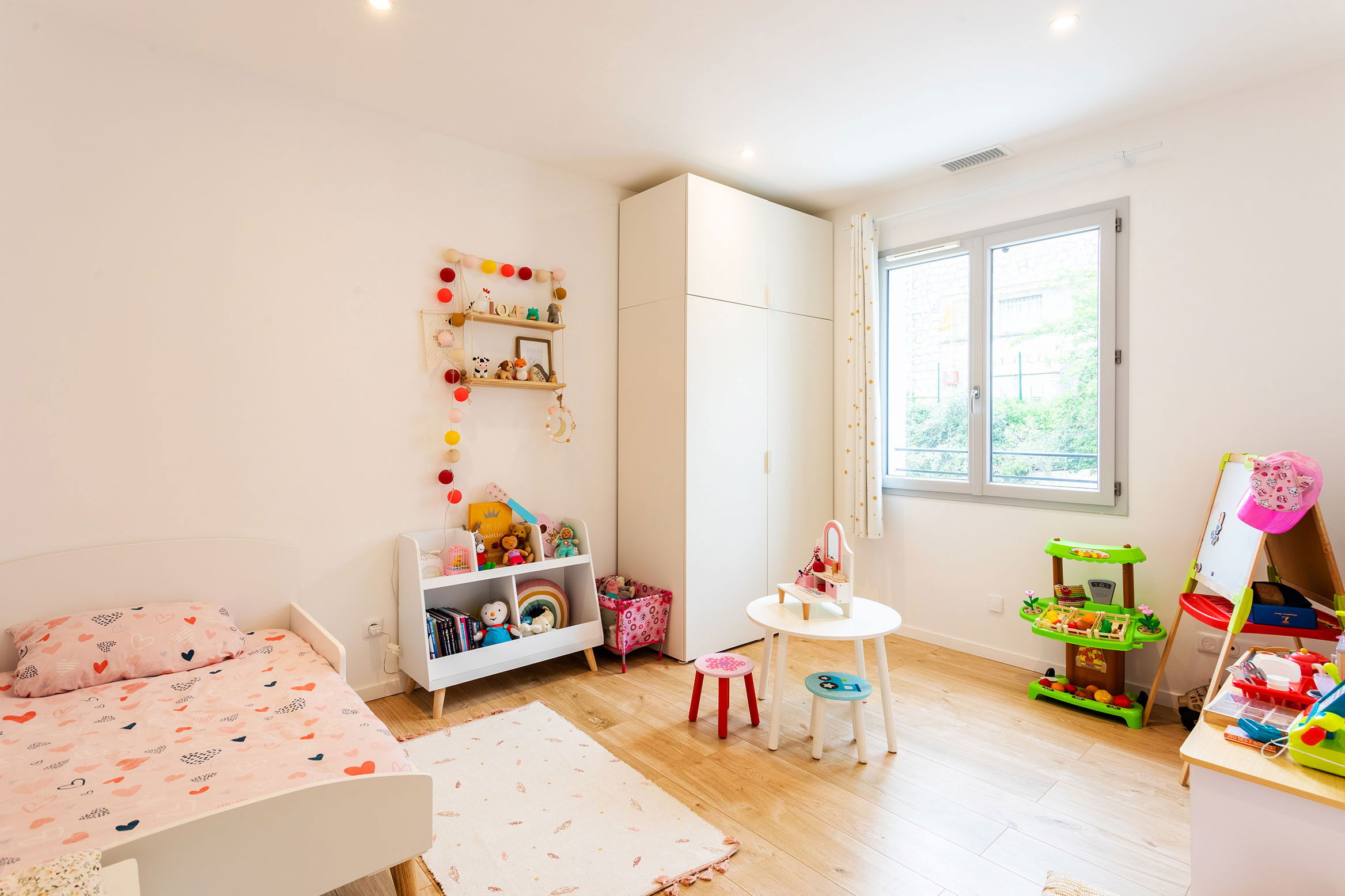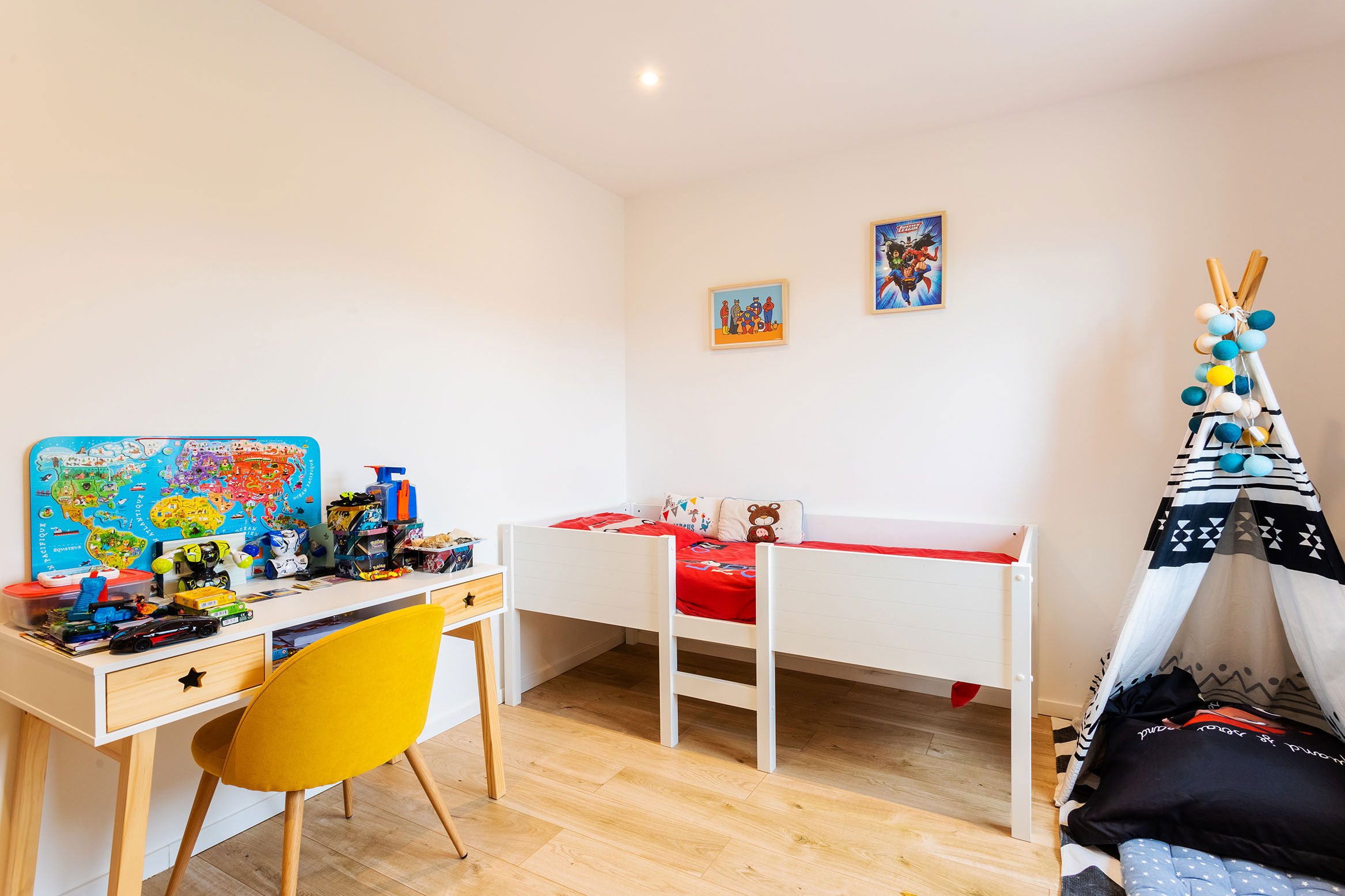 3 autres chambres à l’étage avec 1 lit double (160 cm) et 2 lits 90 dans chaque chambre enfants. Une salle de bain, WC indépendant.