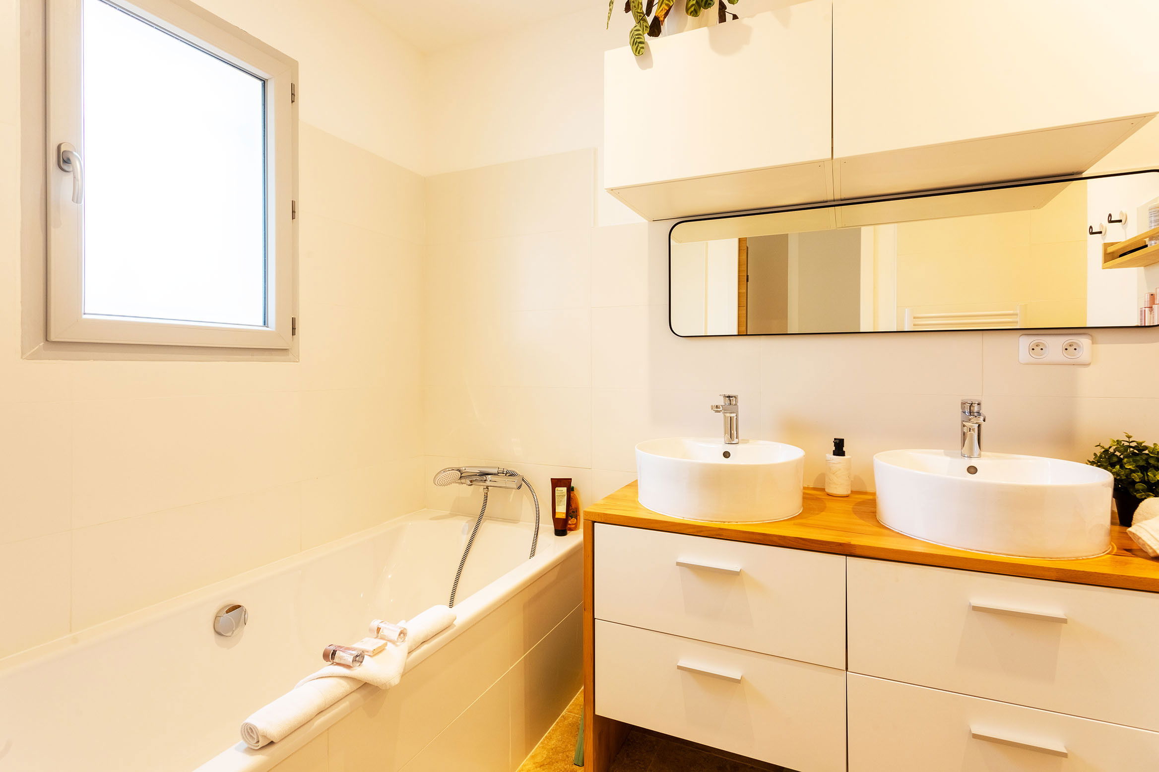 La villa est meublée avec goût avec un beau salon-salle à manger-coin cuisine ouvrant sur la terrasse plein sud équipée d’un coin repas, la piscine sécurisée avec barrière coin salon et bains de soleil et un jardin d’environ 200 m2.
